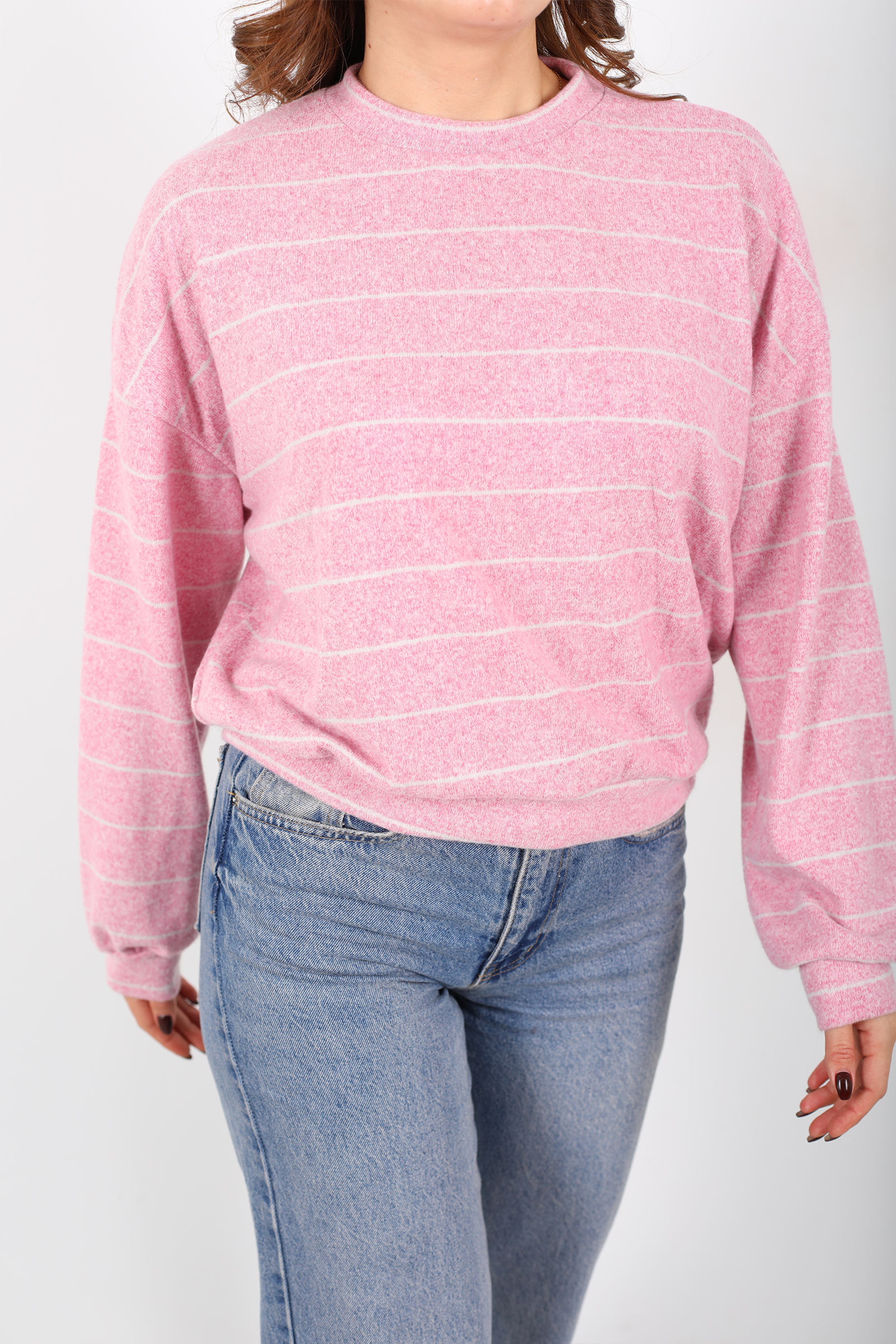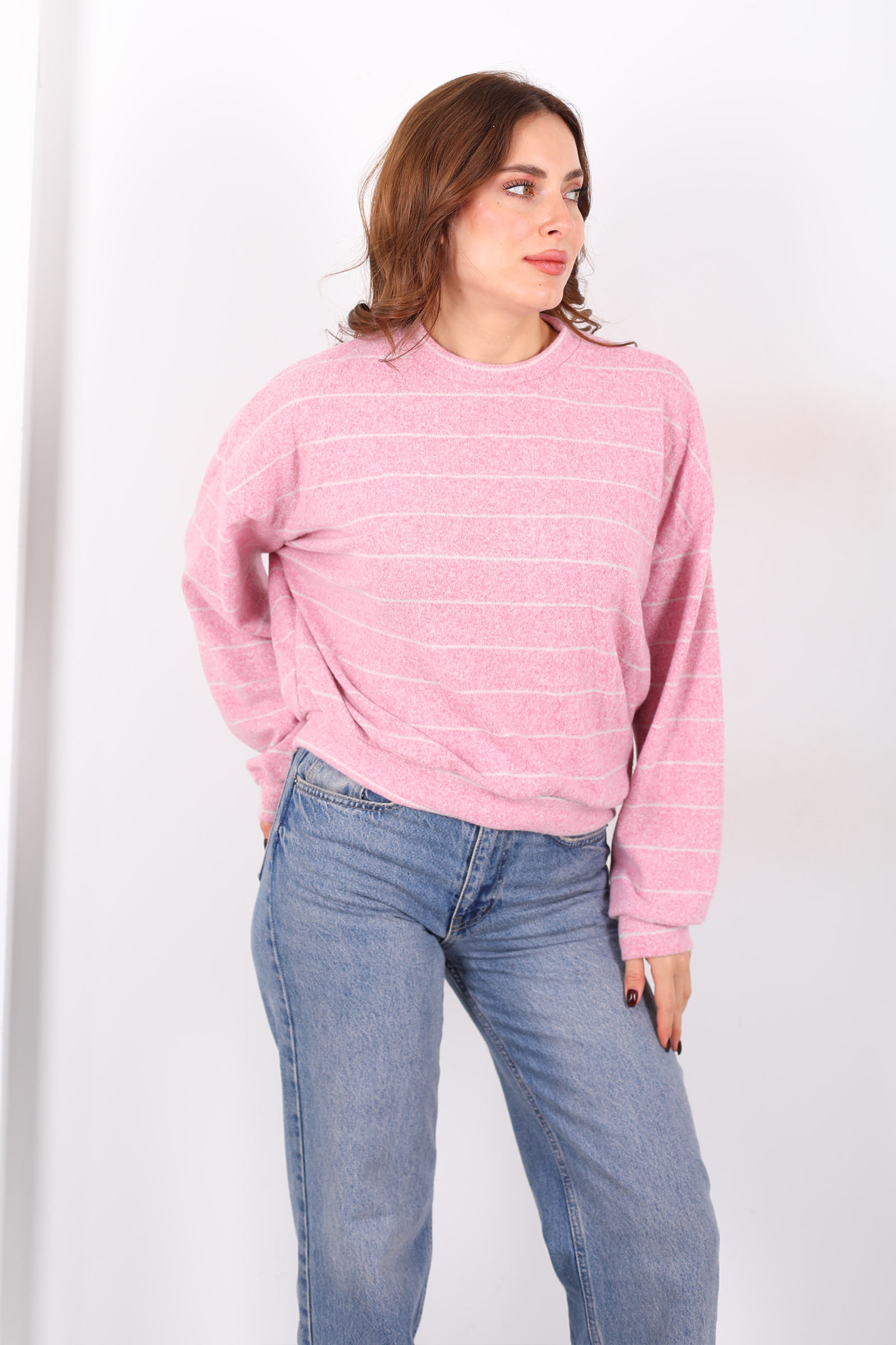 Beli Lastikli Bisiklet Yaka Pembe Kadın Çizgili Bluz