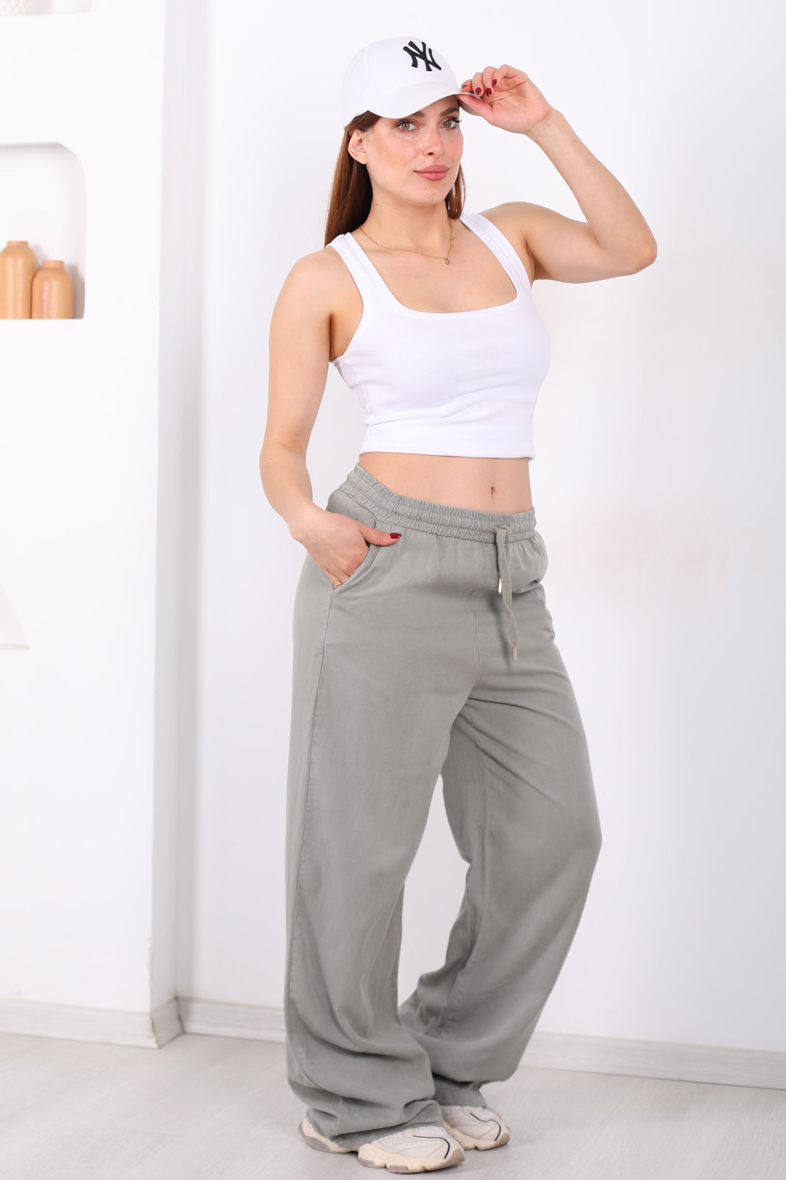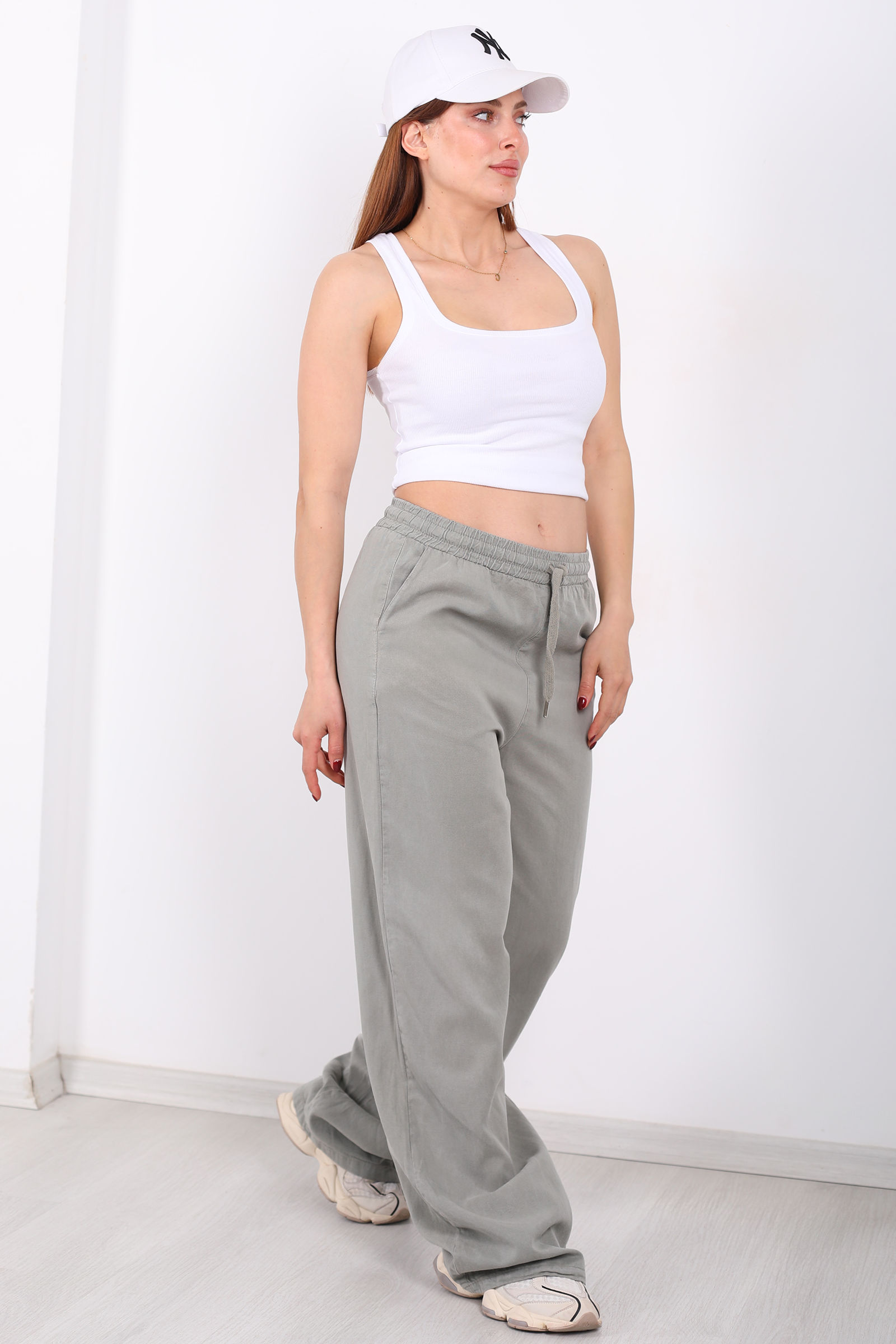 Doğanın yumuşak yeşil tonlarını stilinizle buluşturan bu haki tensel pantolon, rahat kesimi ve akışkan kumaşıyla fark yaratıyor. Beli lastikli kısmı bedeninizle uyumlu bir silhouette oluştururken, geniş bol paça kesimi özgür hareket hissini artırır. Cepli tasarımı ise günlük yaşamda hem işlevsellik hem de cool bir detay olarak öne çıkar.