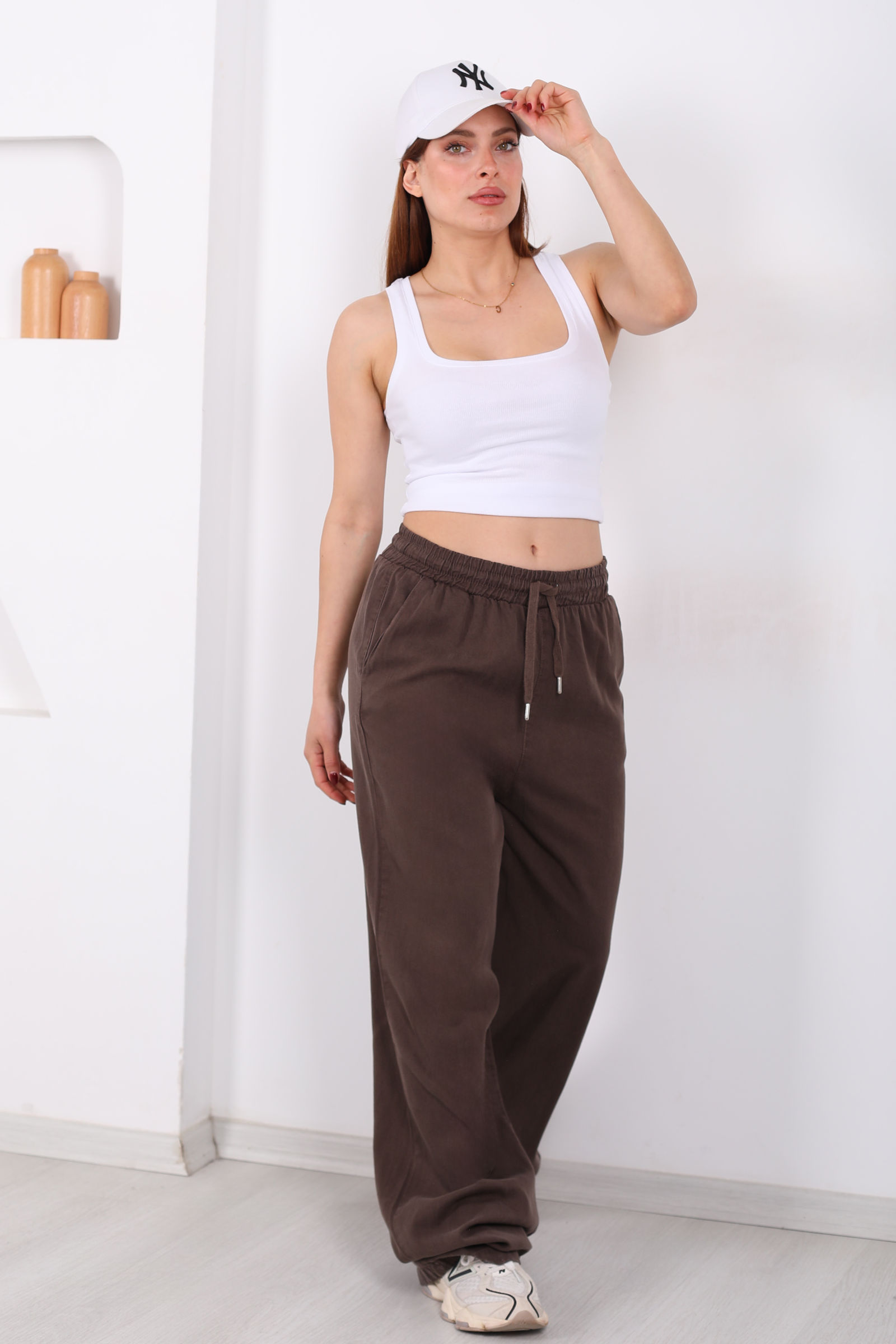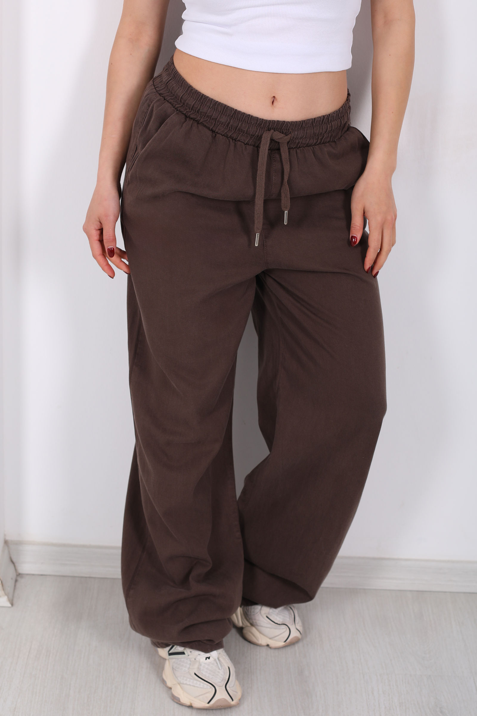 Kahverenginin sıcak ve toprak tonlarıyla stilinizi güçlendiren bu tensel pantolon, bol paça kesimi sayesinde modern bir siluet sunar ve gün boyu hareket özgürlüğü sağlar. Beli lastikli yapısı, pantolonu kişisel ölçünüze göre rahatça şekillendirmenize olanak tanır; cepler ise pratik bir kullanım ve spor-şık detay yaratır.