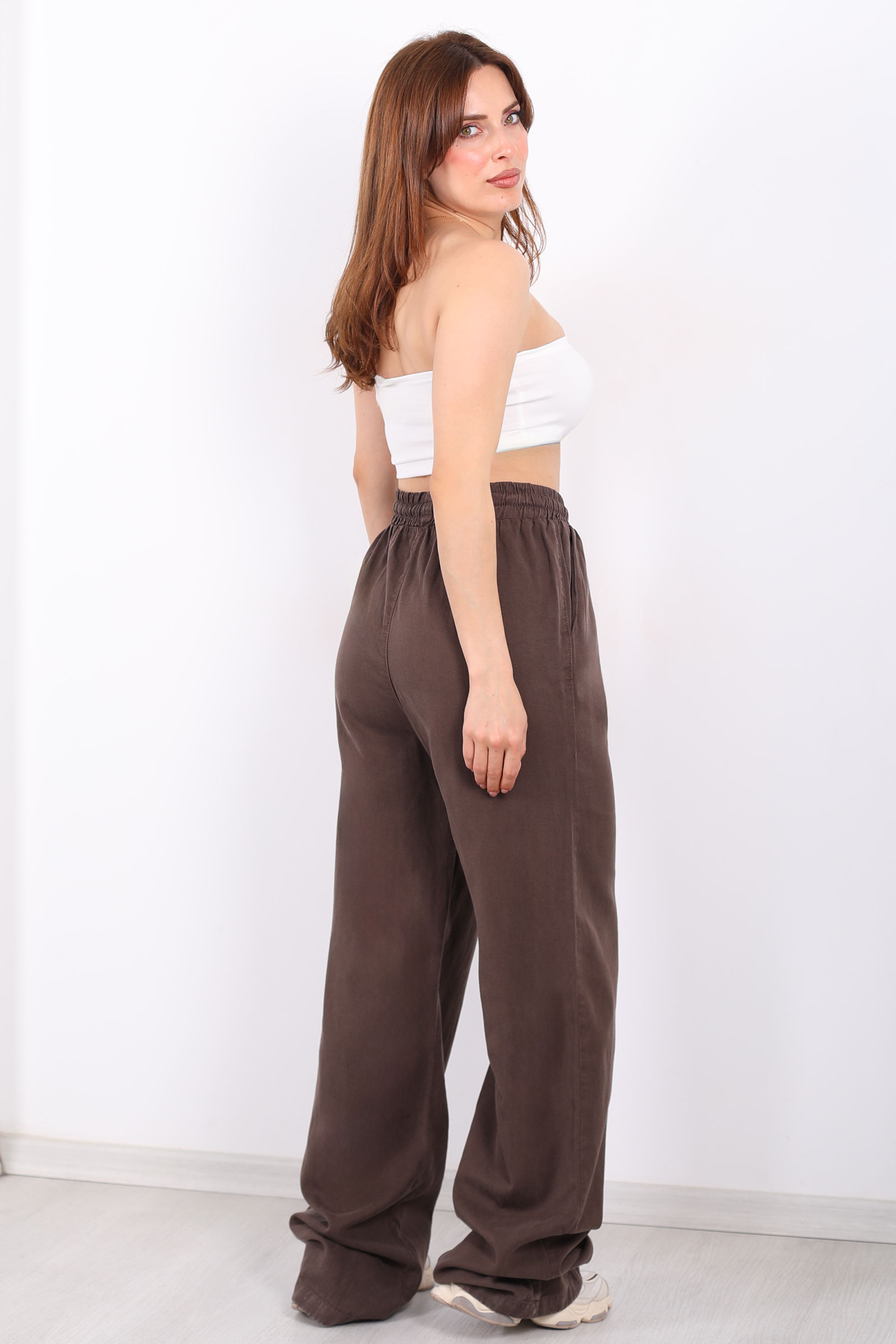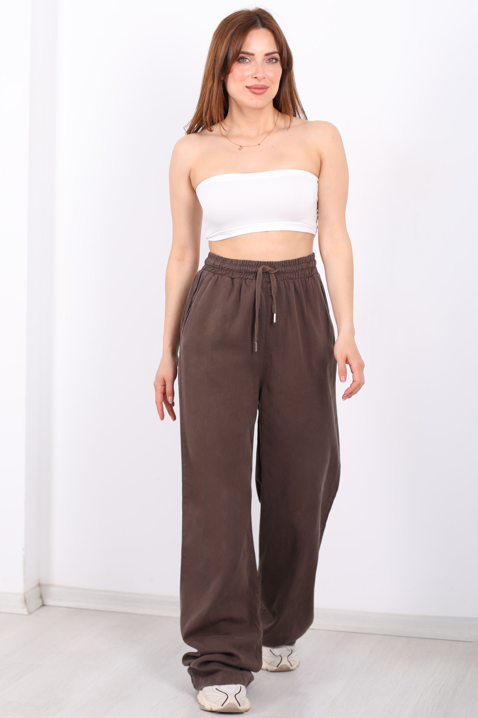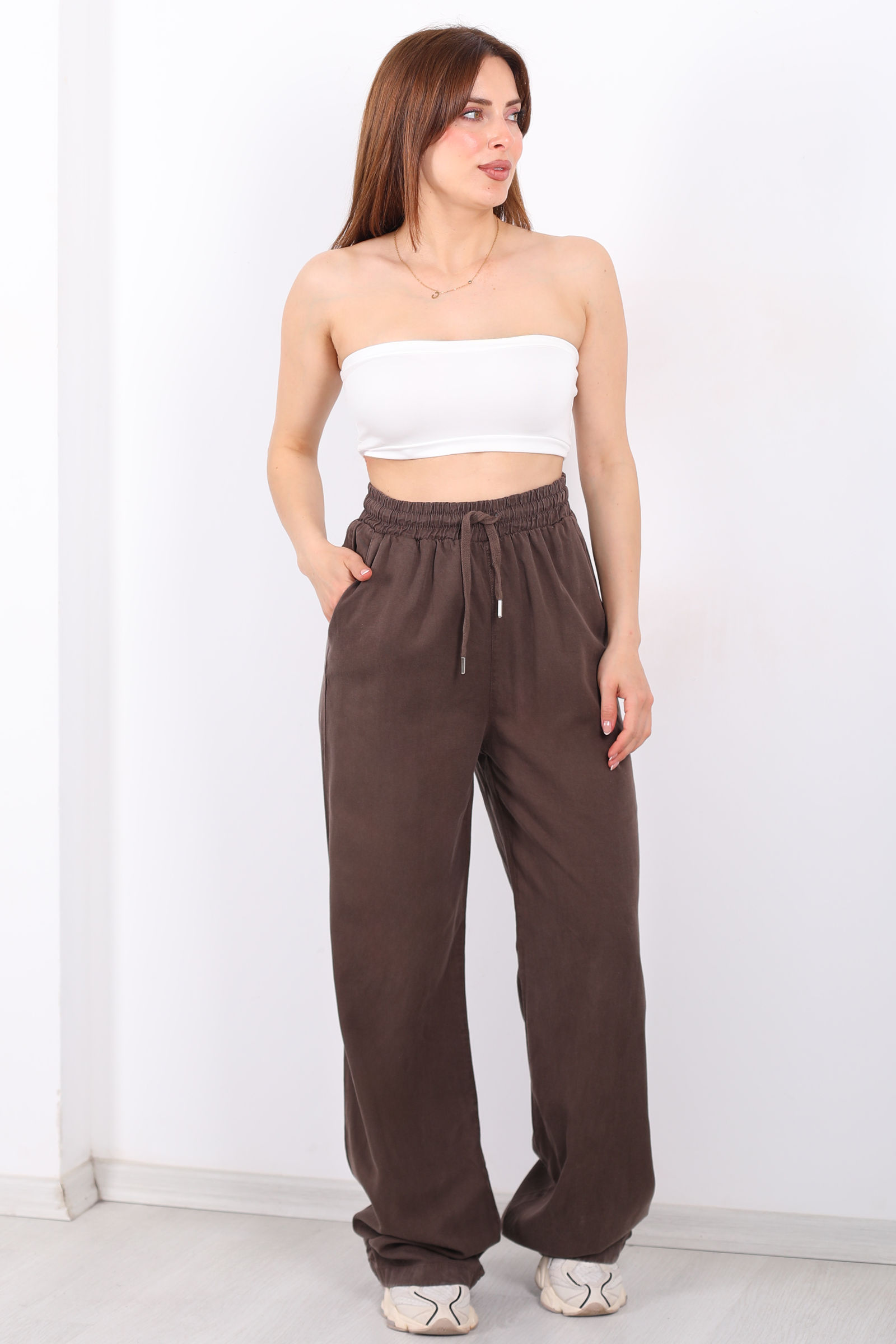 Yumuşak ve nefes alabilen tensel kumaş, günlük yaşamın temposunda bile ferah bir his verir. Kahverenginin doğal ve zengin tonu, pastel veya canlı üstlerle kolayca kombinlenebilir, sade ama etkileyici bir şehir stili oluşturur.