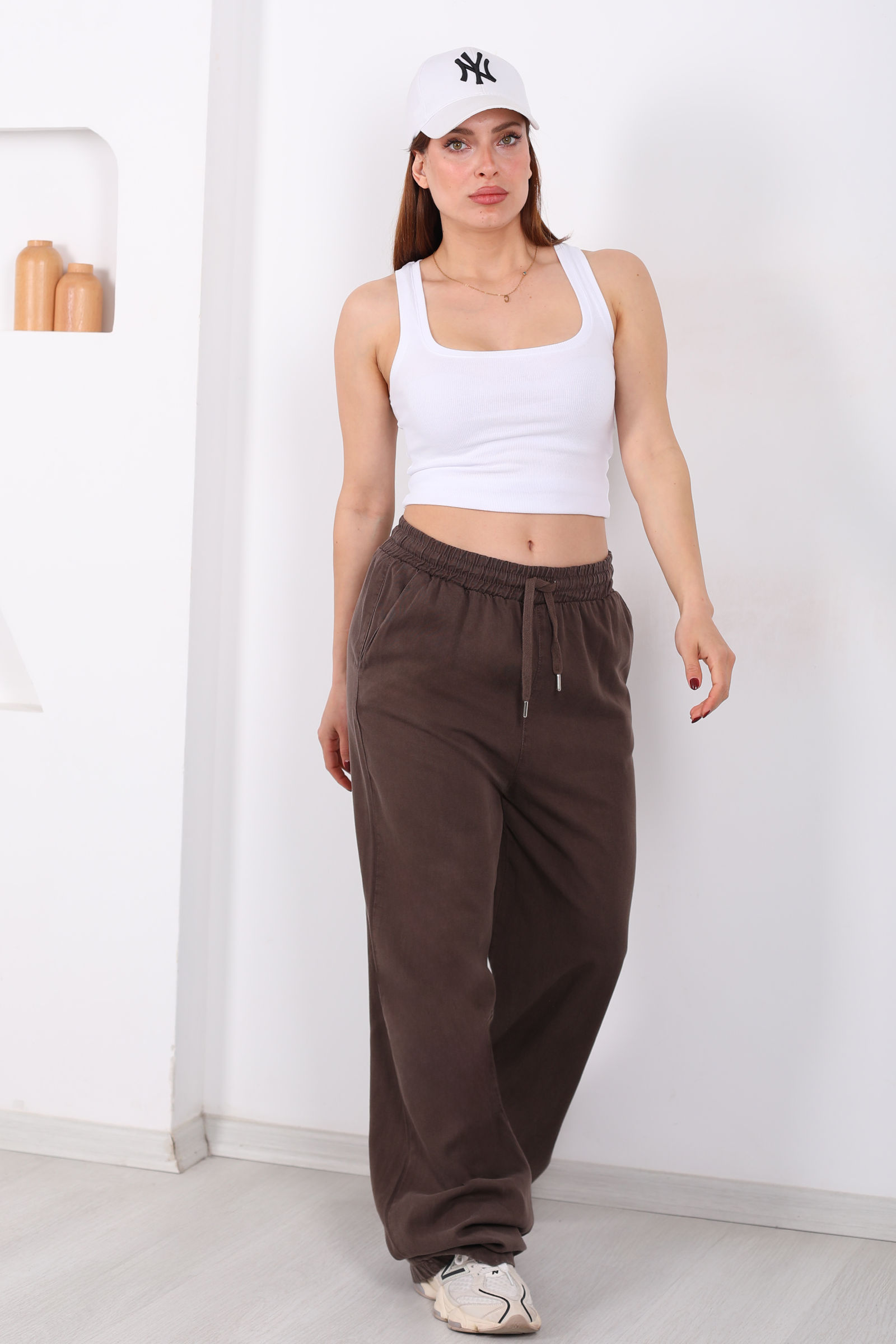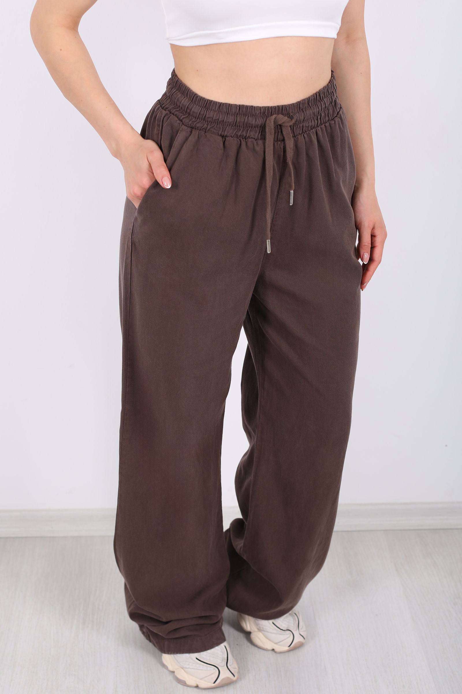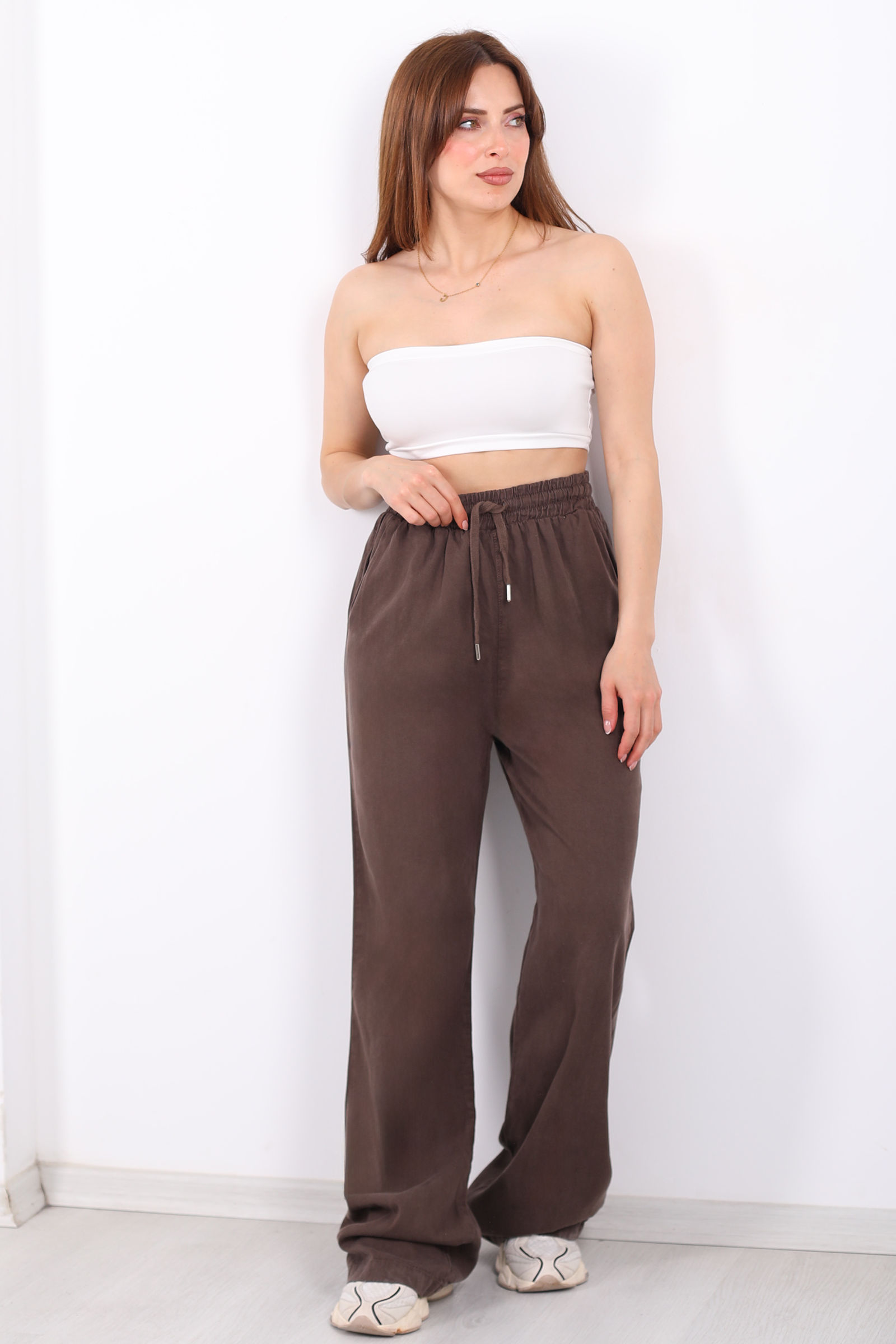 Yumuşak ve nefes alabilen tensel kumaş, günlük yaşamın temposunda bile ferah bir his verir. Kahverenginin doğal ve zengin tonu, pastel veya canlı üstlerle kolayca kombinlenebilir, sade ama etkileyici bir şehir stili oluşturur.