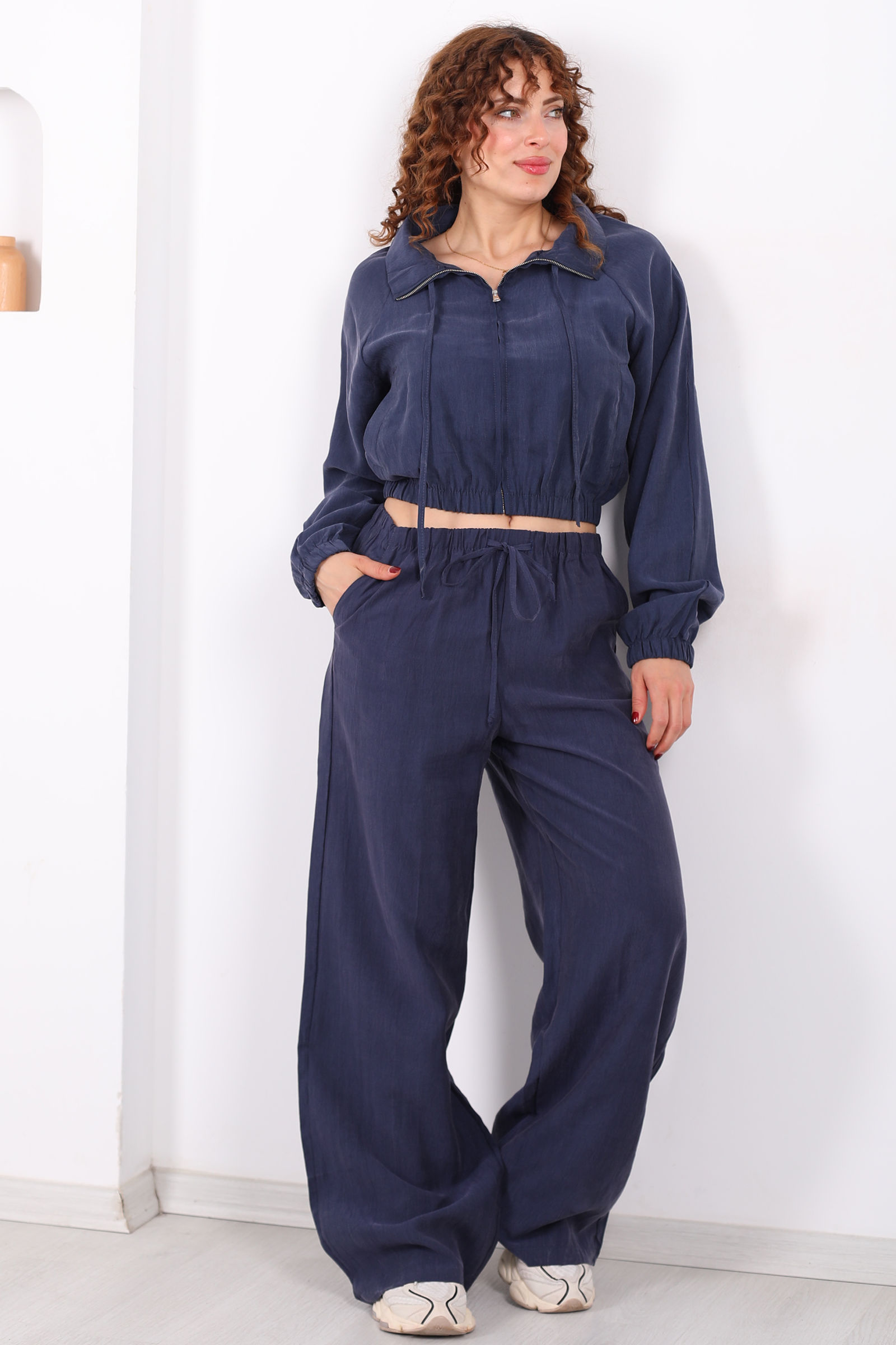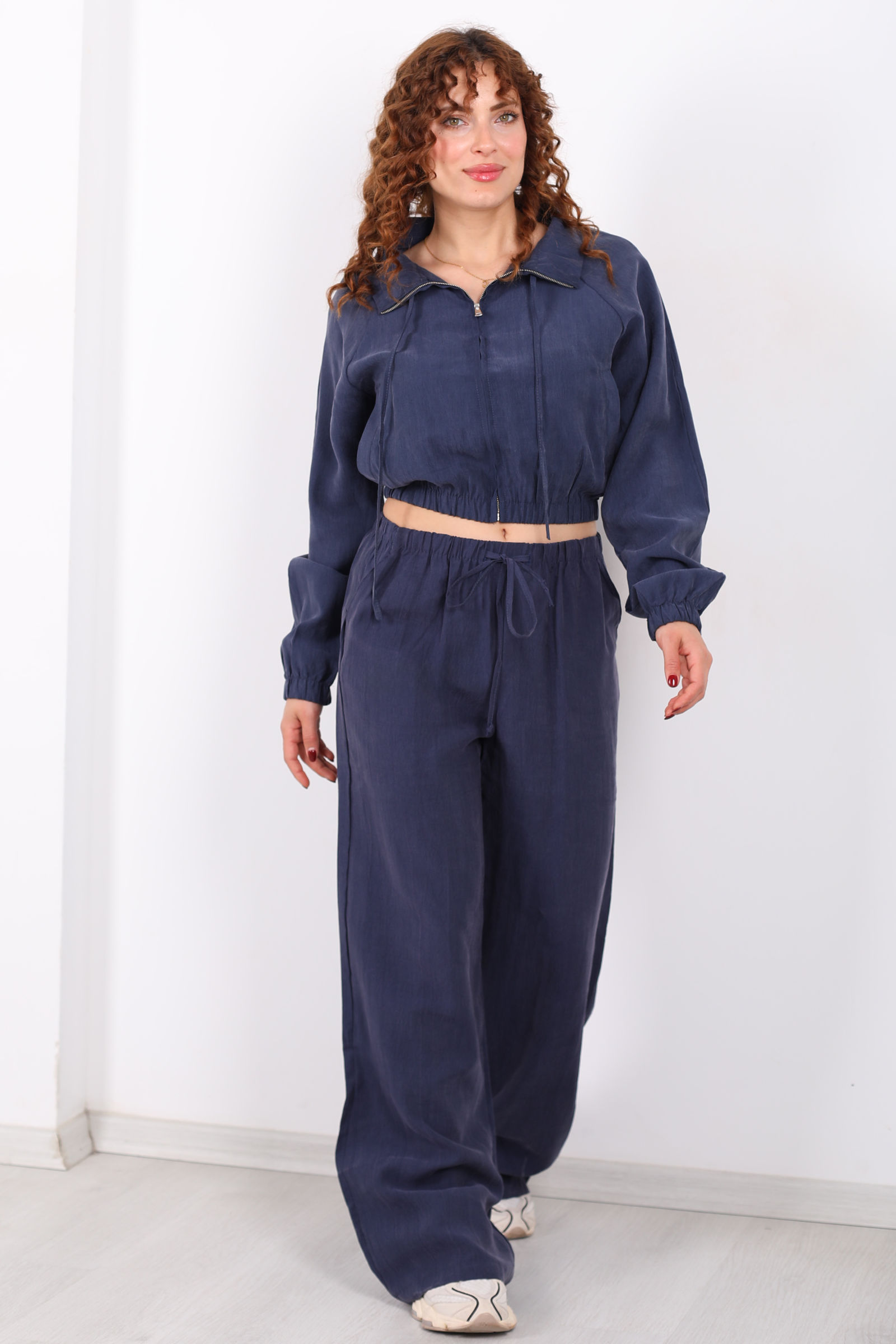 Önü Püsküllü Yırtmaçlı Gofre Lacivert Kadın Pantolon
