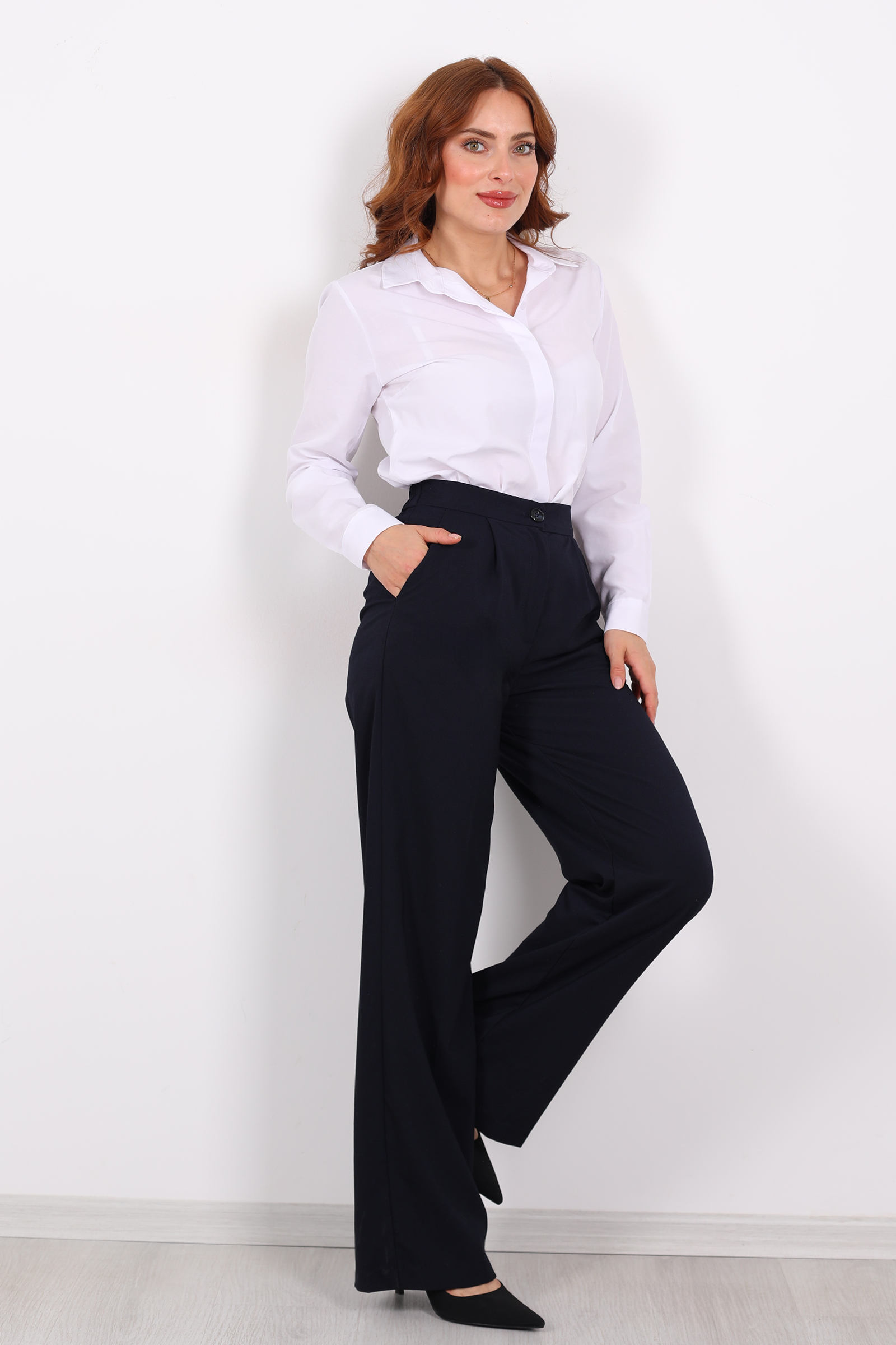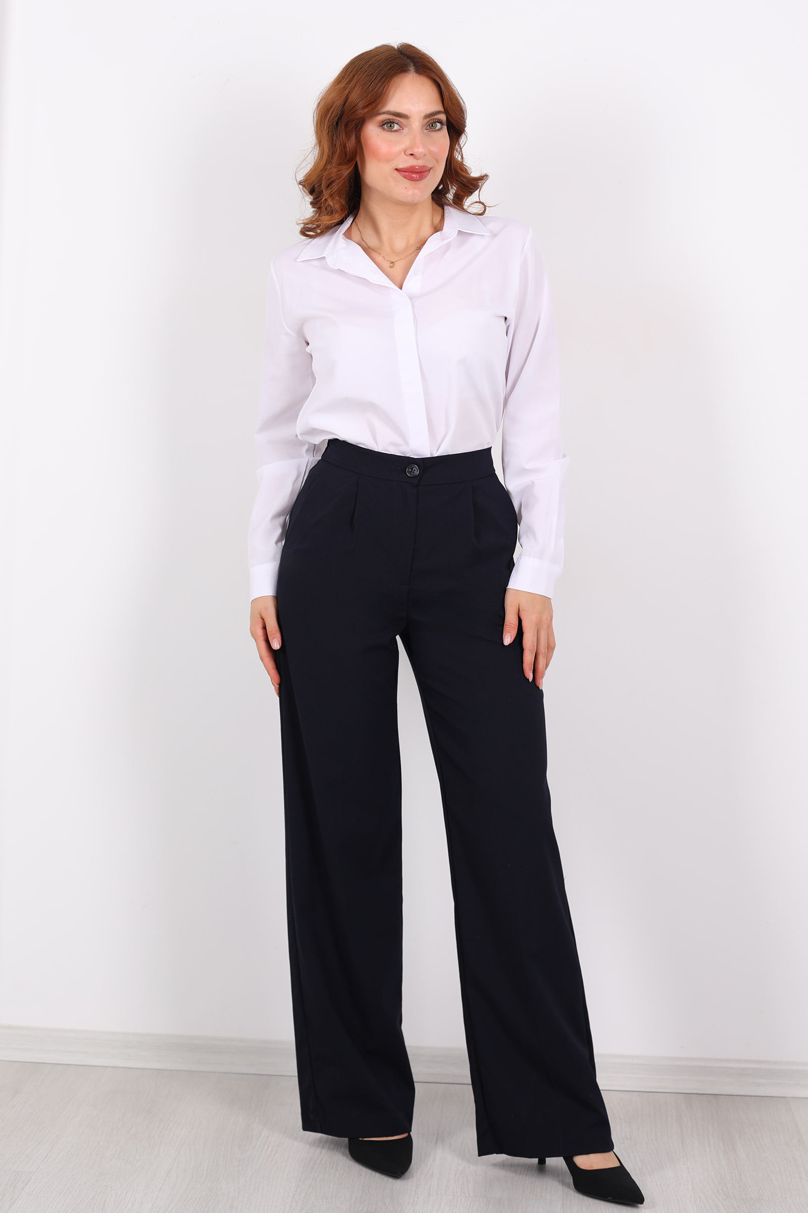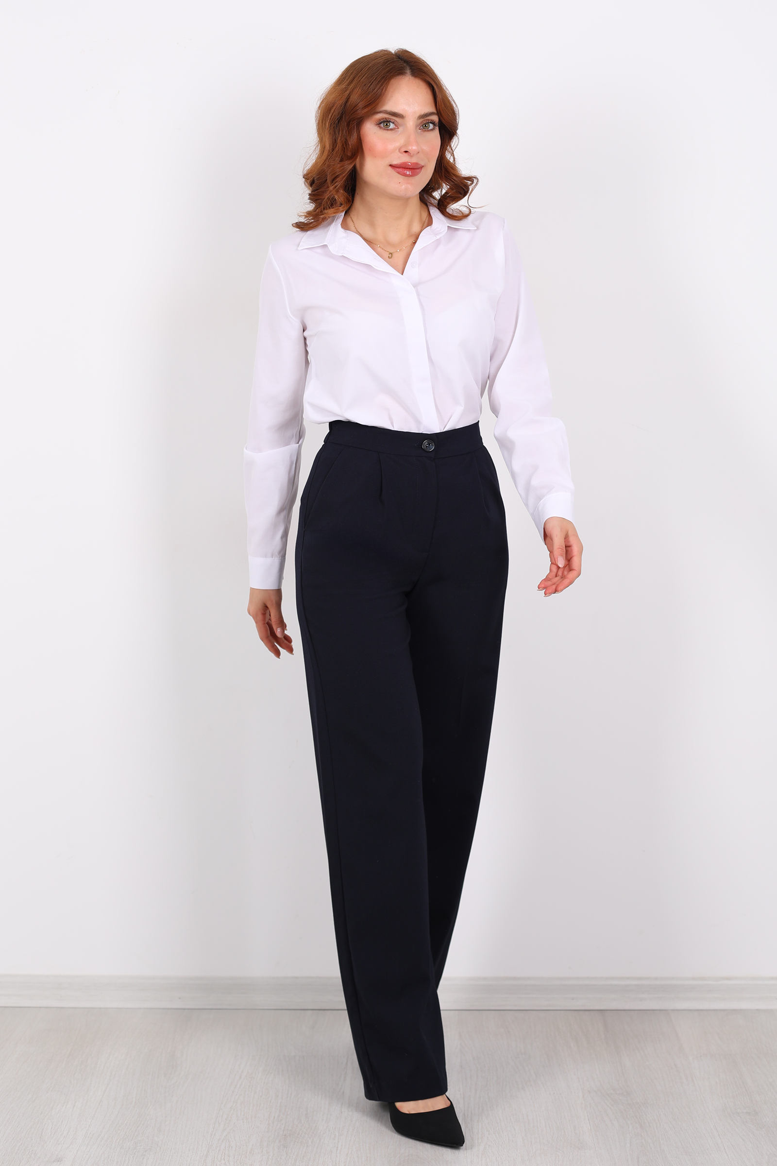Klasik çizgilerle modern rahatlığı bir araya getiren bu lacivert kumaş pantolon; lastikli beliyle mükemmel uyum sağlar, boru paça kesimi ise günlük stilde hem zarafet hem özgürlük sunar.Bu pantolon, kaliteli kumaştan tasarlanmış olup, hem dayanıklı hem de yumuşak bir dokuya sahiptir. Lastikli bel sayesinde gün boyu konfor sağlar.Hem iş hem gündüz kombinlerinde şık ve konforlu pantolon arayan kadınlar için.