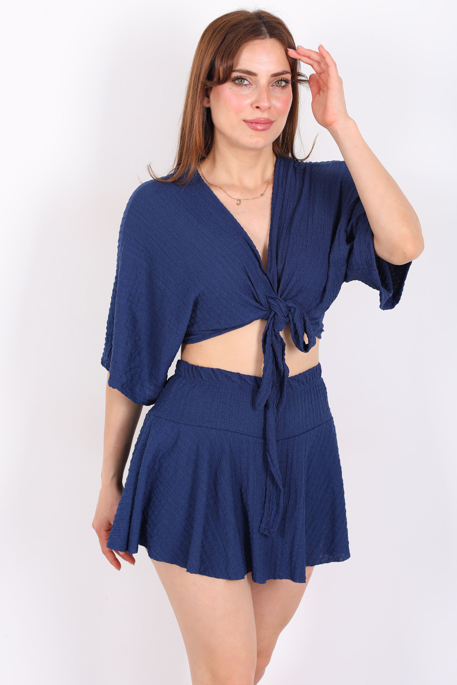 Pileli Kemerli Lacivert Mini Kadın Etek