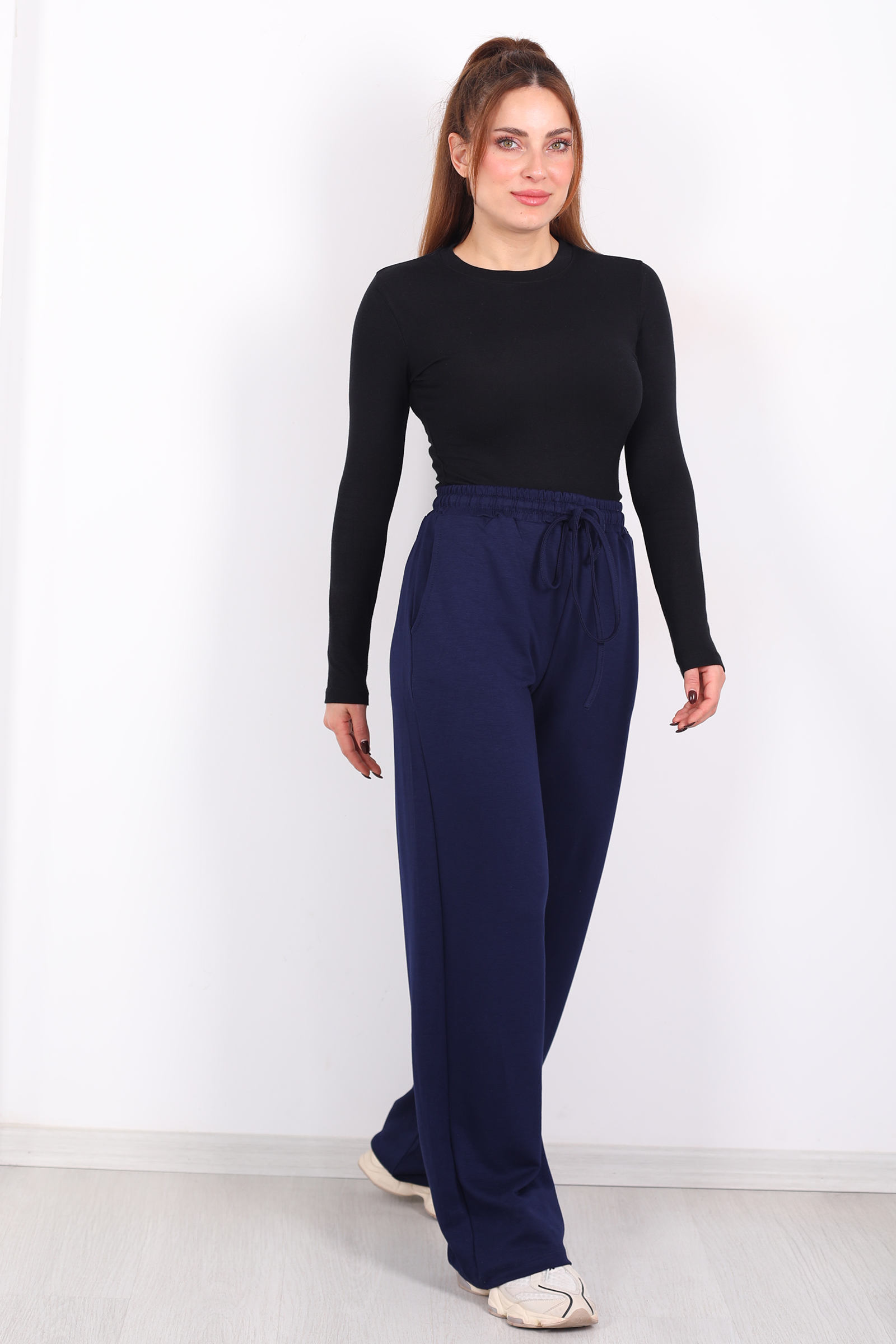 Karanlığın içinden geçerken gökyüzünde beliren ilk gece mavisini andıran lacivert, bu pantolonda sadece bir renk değil stilin sakin ama akılda kalan bir tondur. Günlük yaşamda “sadece giyilen” bir parça değil; hareketini zarif bir ritimle takip eden, seninle birlikte akan bir duruş sunar.Pantolonun beli lastikli tasarımı, seni sıkmayan ama sarıp sarmalayan bir konfor sağlar; gün içinde ister evde keyif koltuğunda otur, ister dışarıda tempolu adımlarla dolaş pantolon hep yanında. Cepler ise sadece küçük objelerin yerleşim noktası değil; kombinin içine fonksiyonel bir duruş ekleyen bir detaydır telefonu, anahtarı, ritmini yanında taşır gibi.