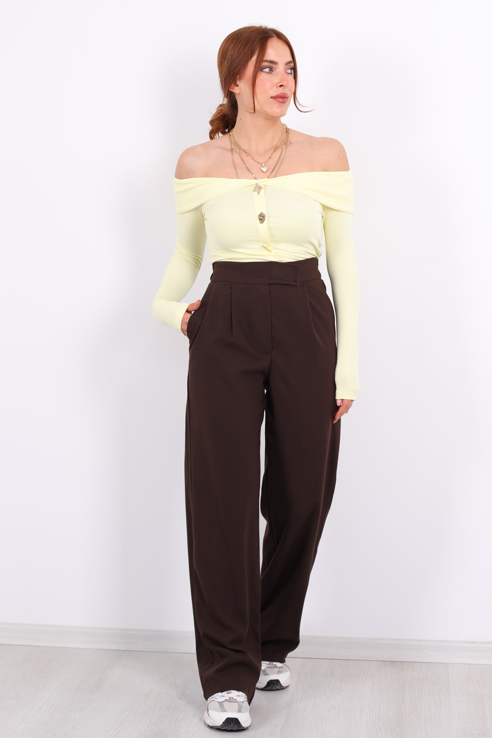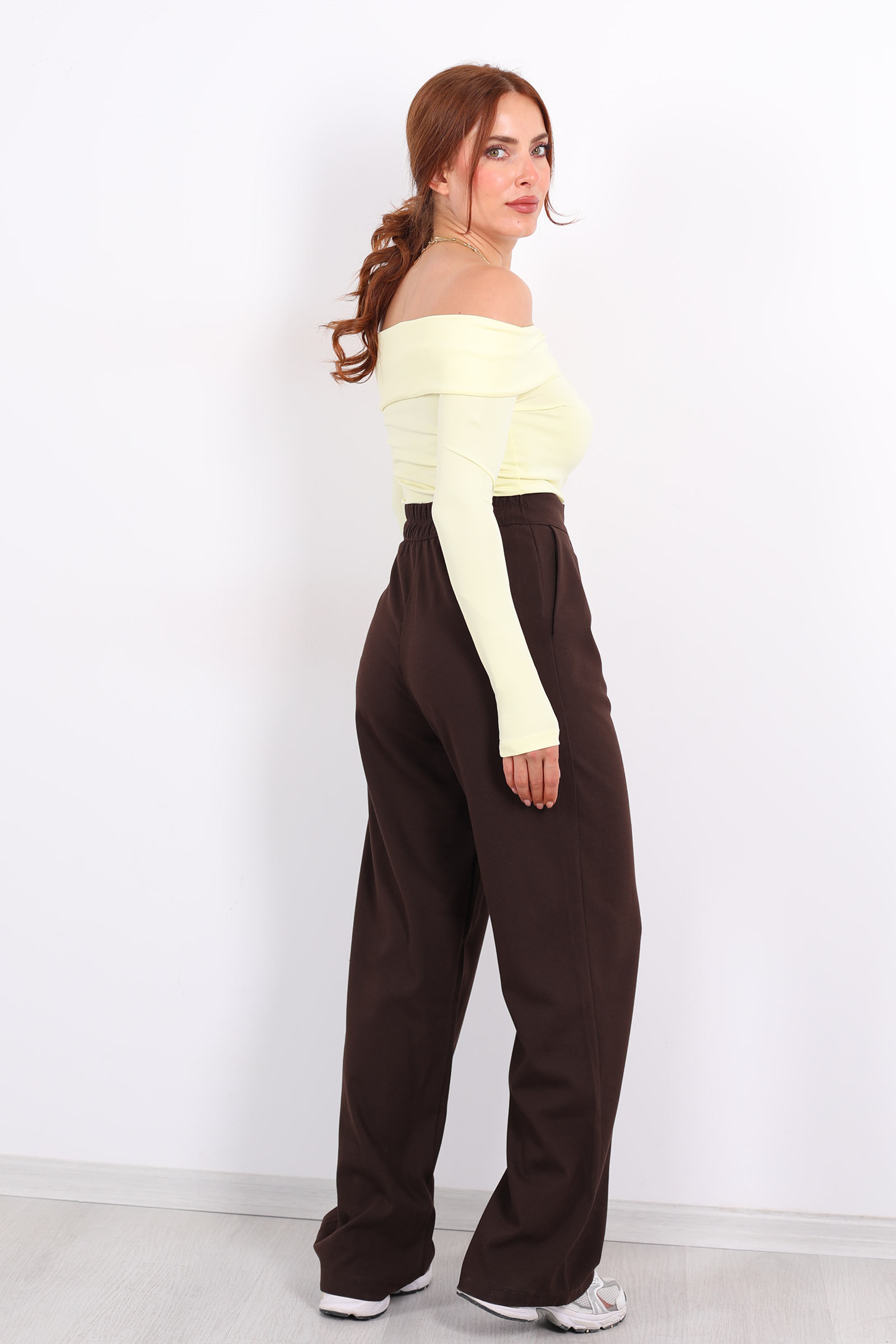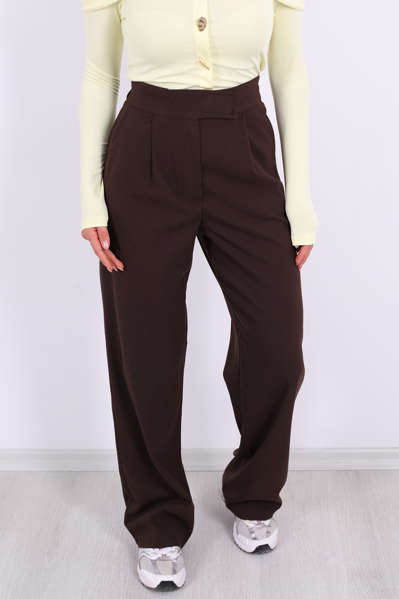 Modern kadının gardırobuna zarif bir dokunuş katan bu pantolon; acı kahve tonunun sıcaklığı ile konforu bir araya getiriyor. Elastik bel bandı ve cırtlı kapanma detayı sayesinde hem rahat hem de pratik bir kullanım sağlar. Yumuşak dokulu kumaşı sayesinde gün boyu özgürce hareket ederken, şık kesimiyle hem günlük kombinlerde hem de daha resmi alternatiflerde stilinizi tamamlar.