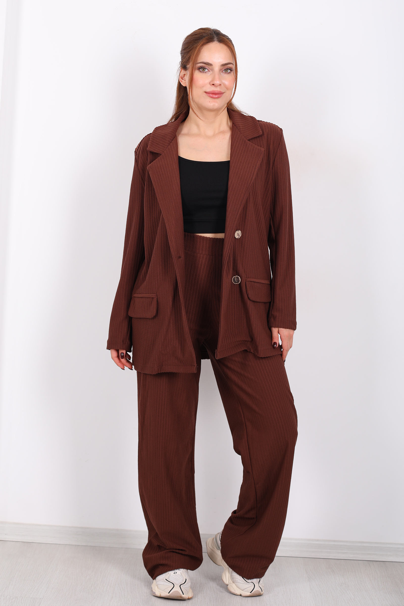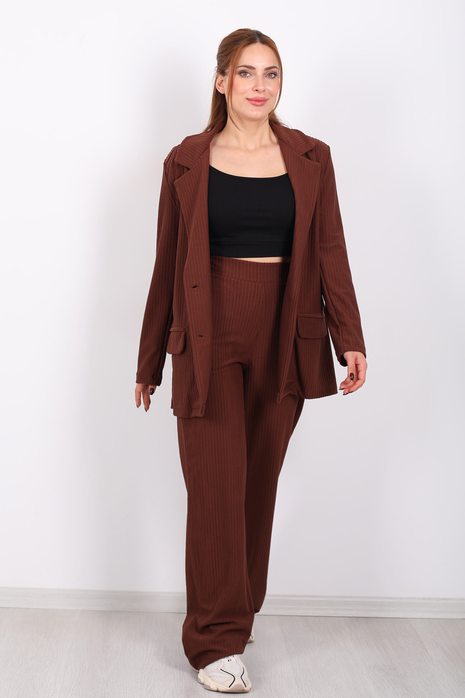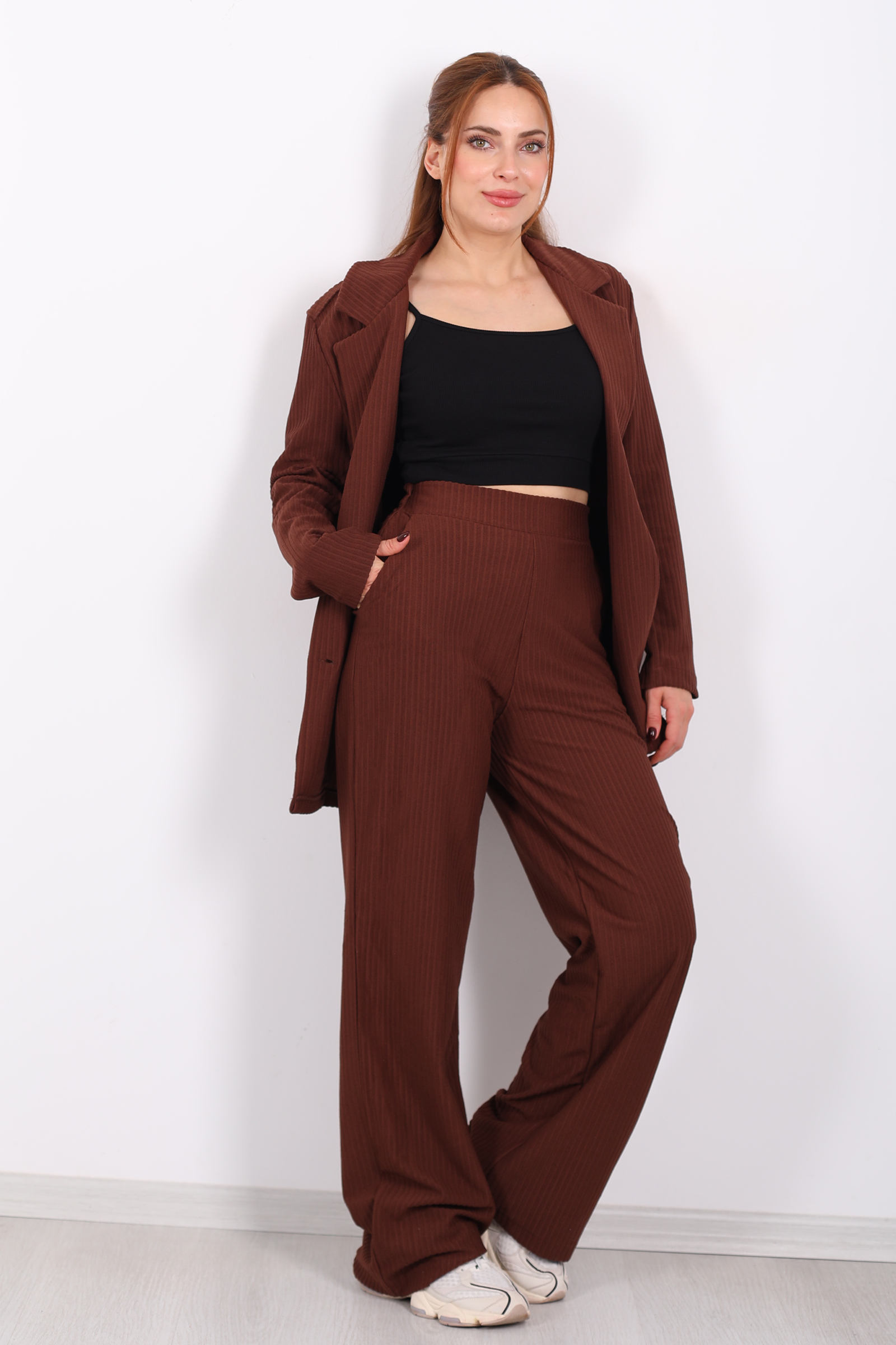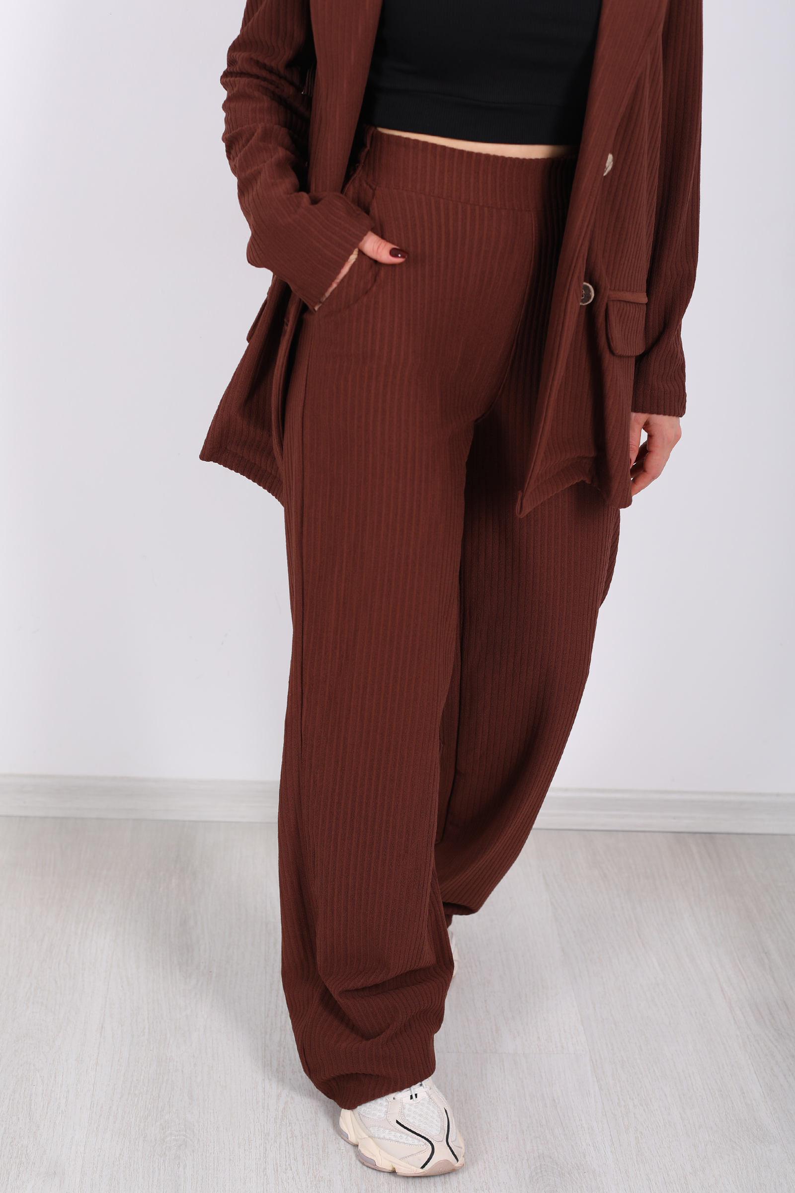 Beli Lastikli Dokuma Kahverengi Kadın Palazzo Pantolon