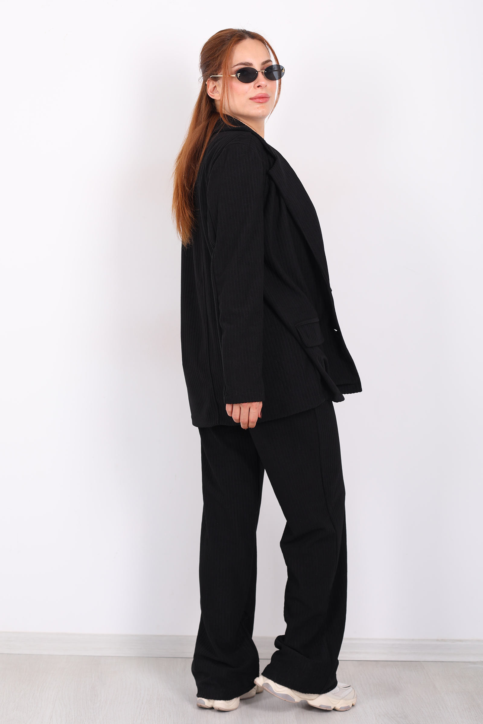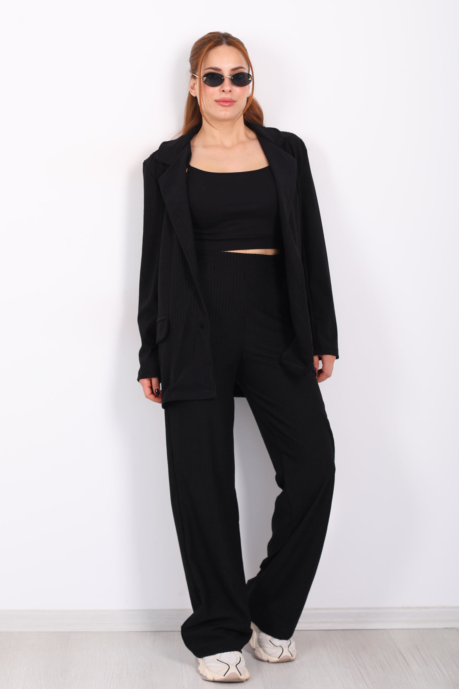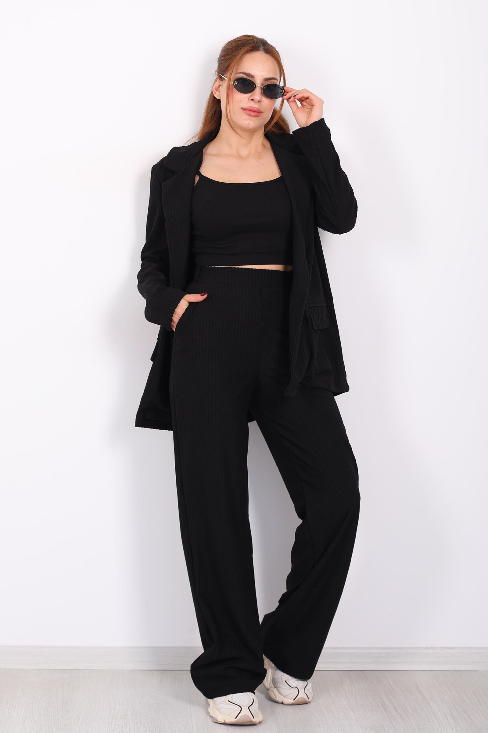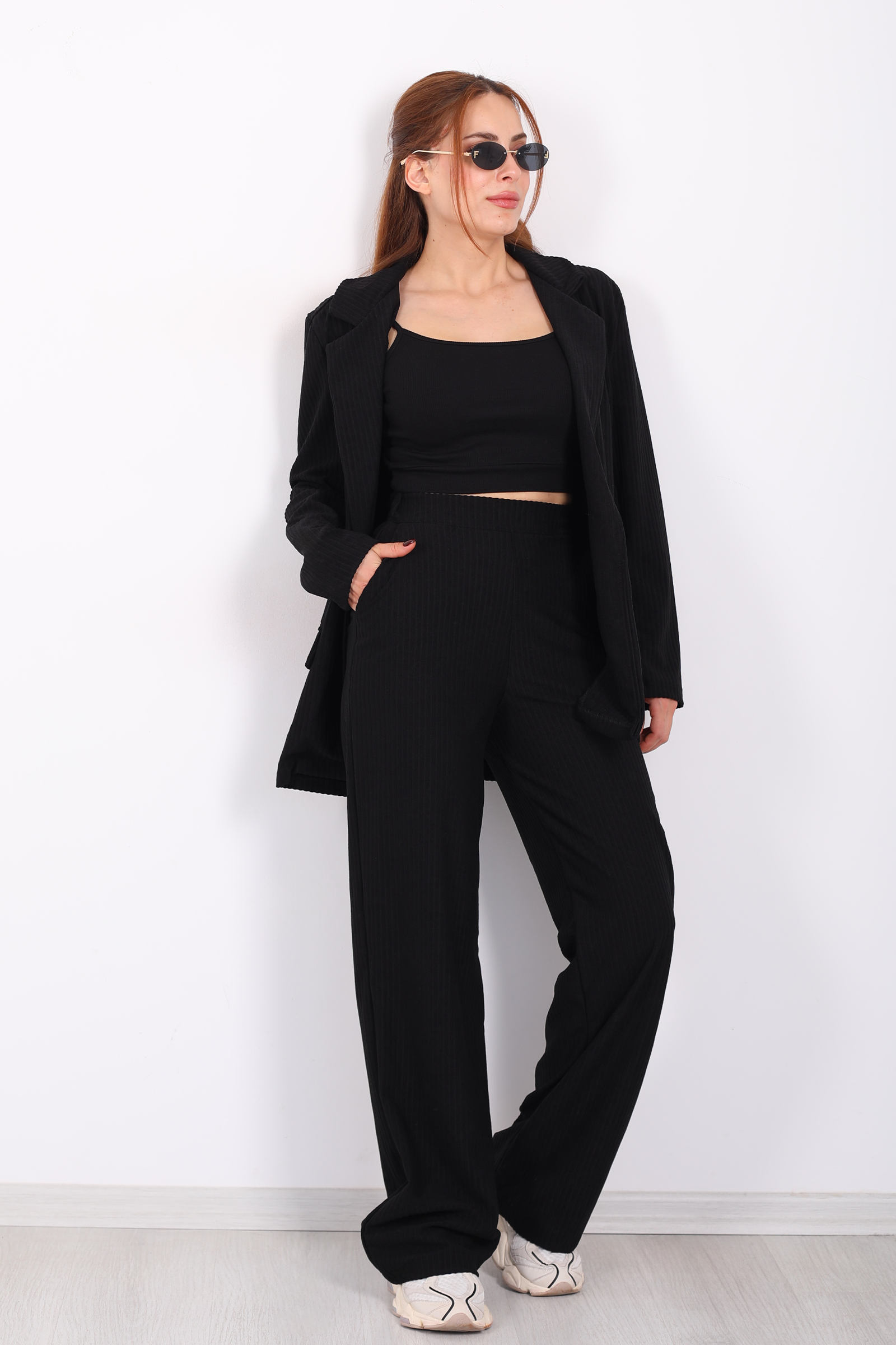 Önü Püsküllü Yırtmaçlı Gofre Siyah Kadın Pantolon