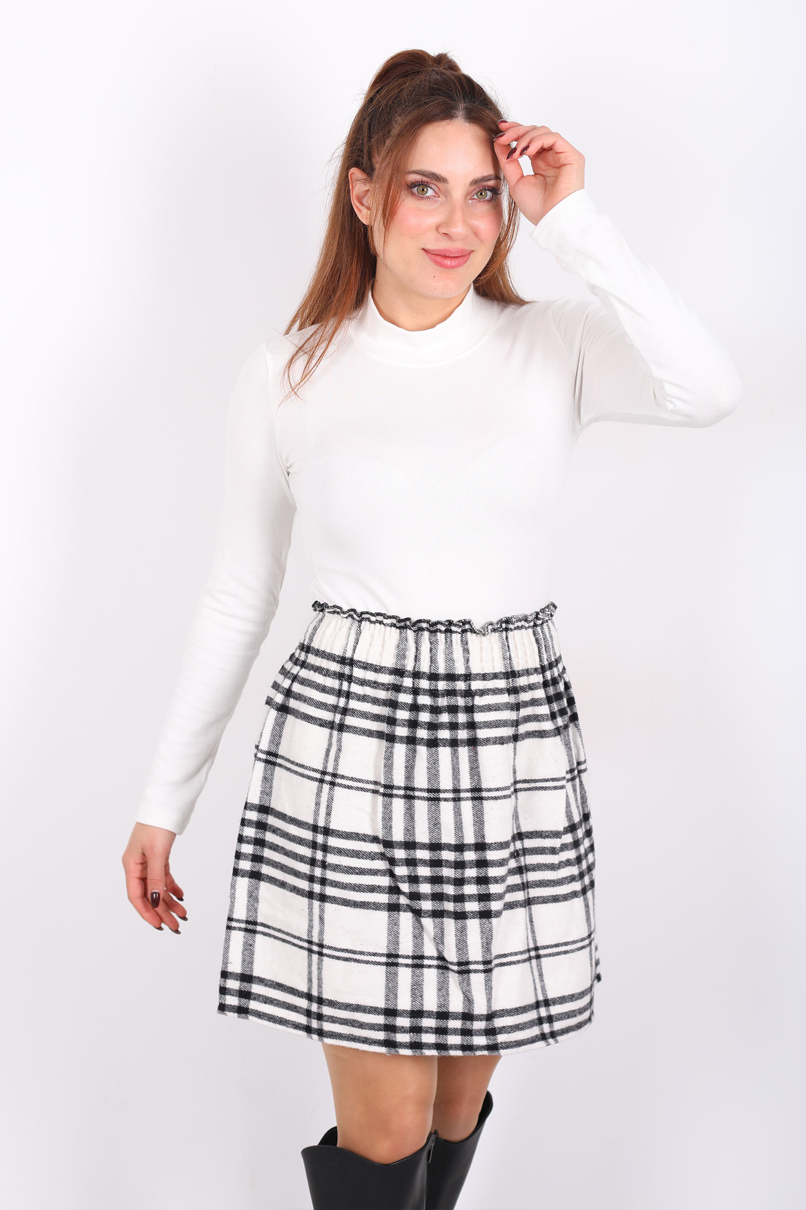 Bu Beli Lastikli Ekose Desen Beyaz Kareli Kadın Etek, sade bir klasikten daha fazlasını sunuyor. Nazik ve modern ekose kare desenli kumaşıyla sade görünümünüzü canlandırırken, beli lastikli tasarımı rahatlığı garanti eder. Kaşe kumaş dokusu sayesinde dört mevsim kullanım için ideal; yumuşak, orta kalınlıkta ve doğal bir duruşa sahip. Mini boyuyla feminen ve enerjik bir hava katarken içindeki pileler etek ucuna hareket katar.
