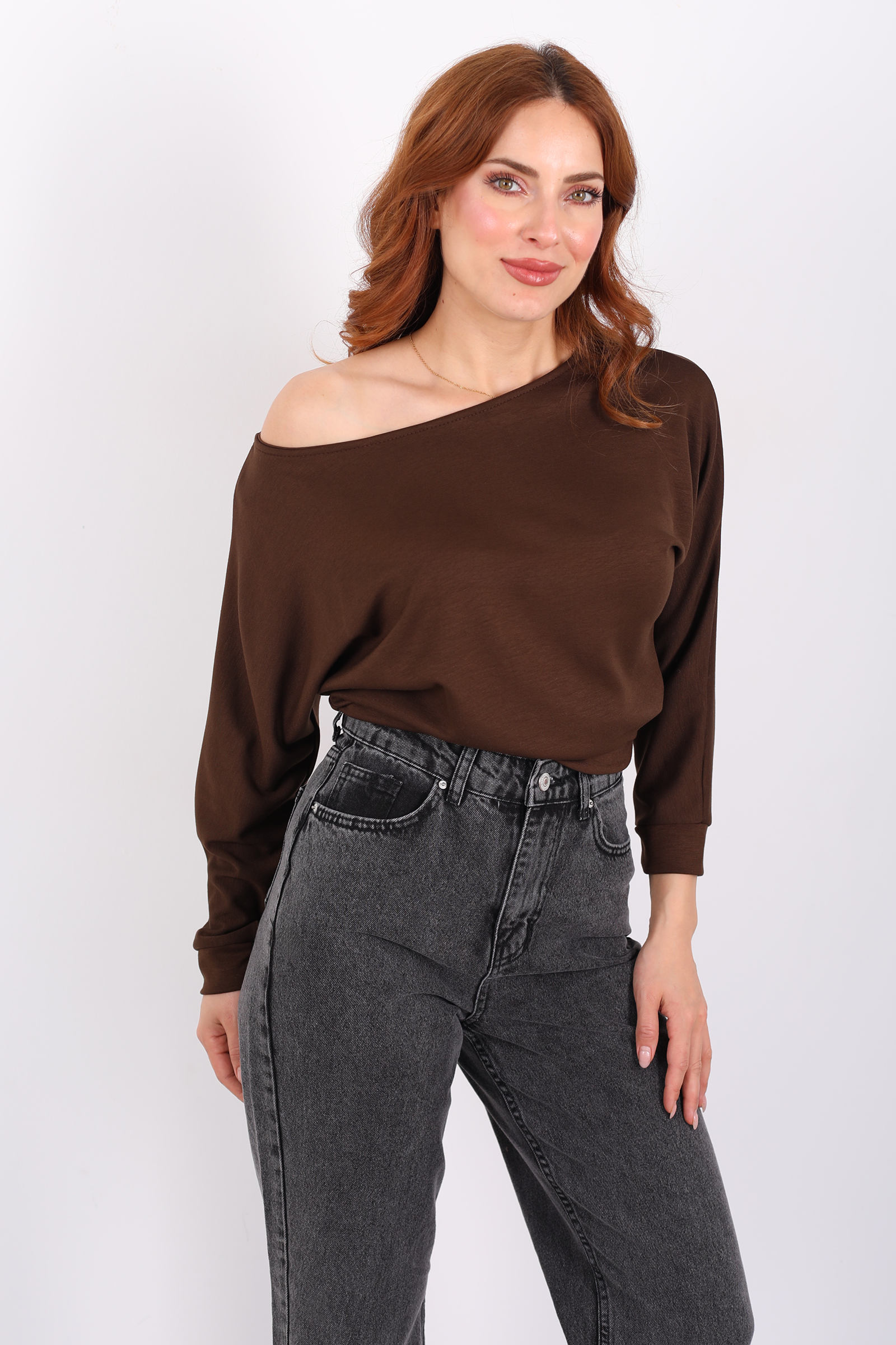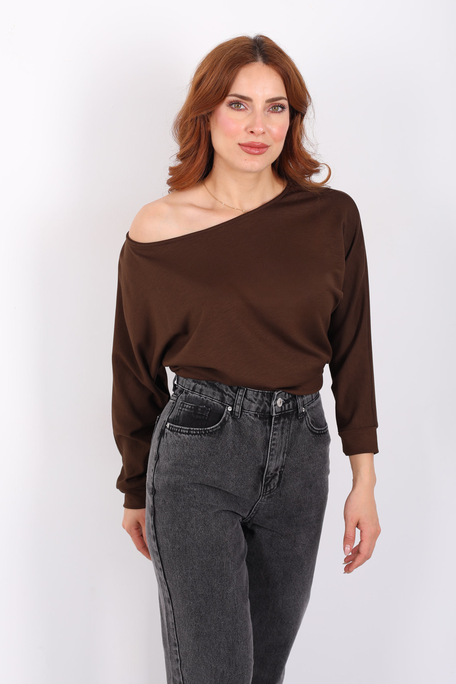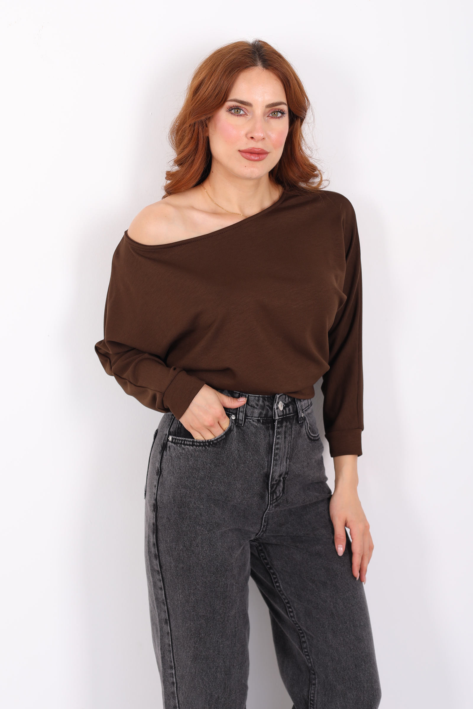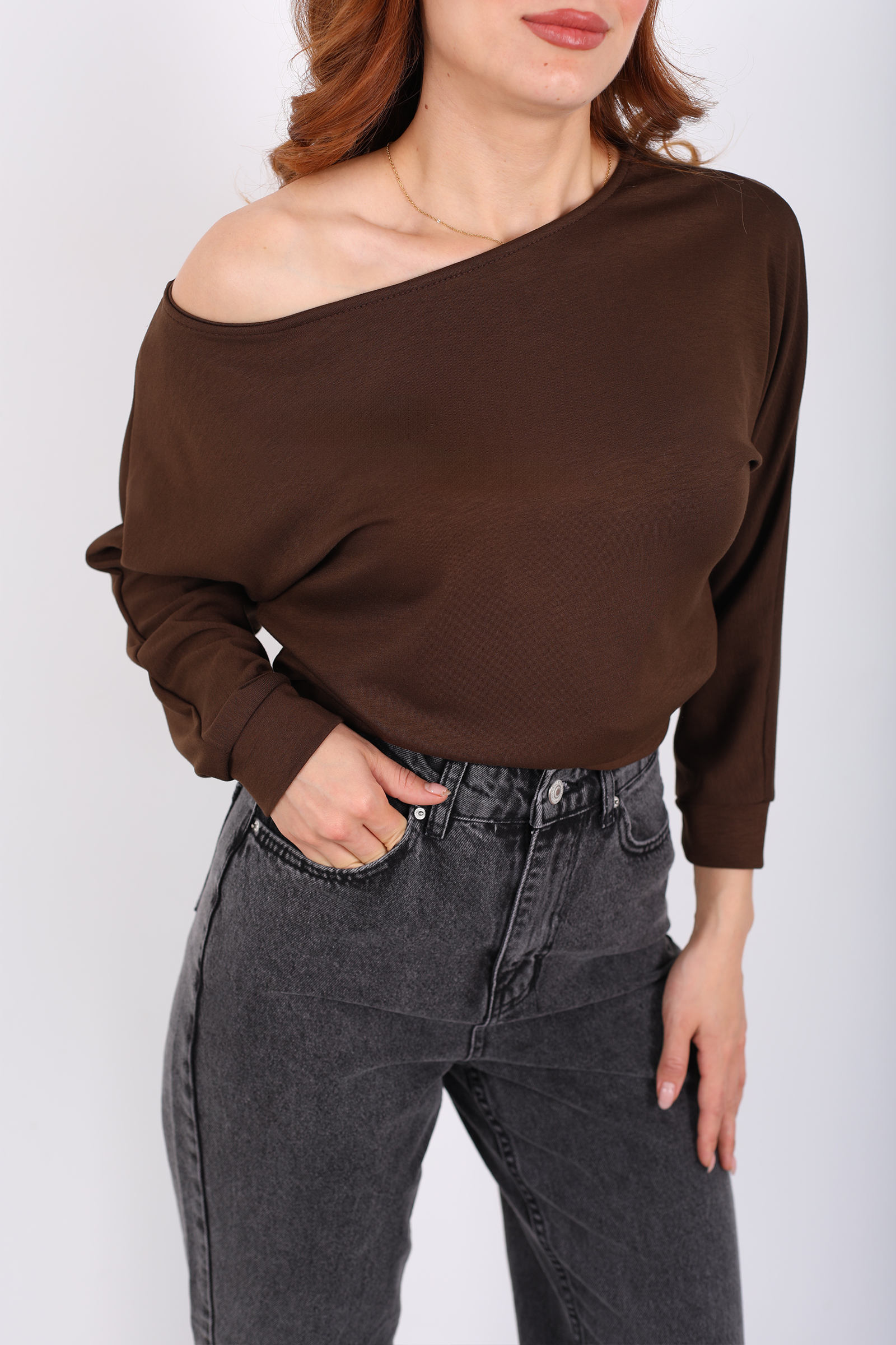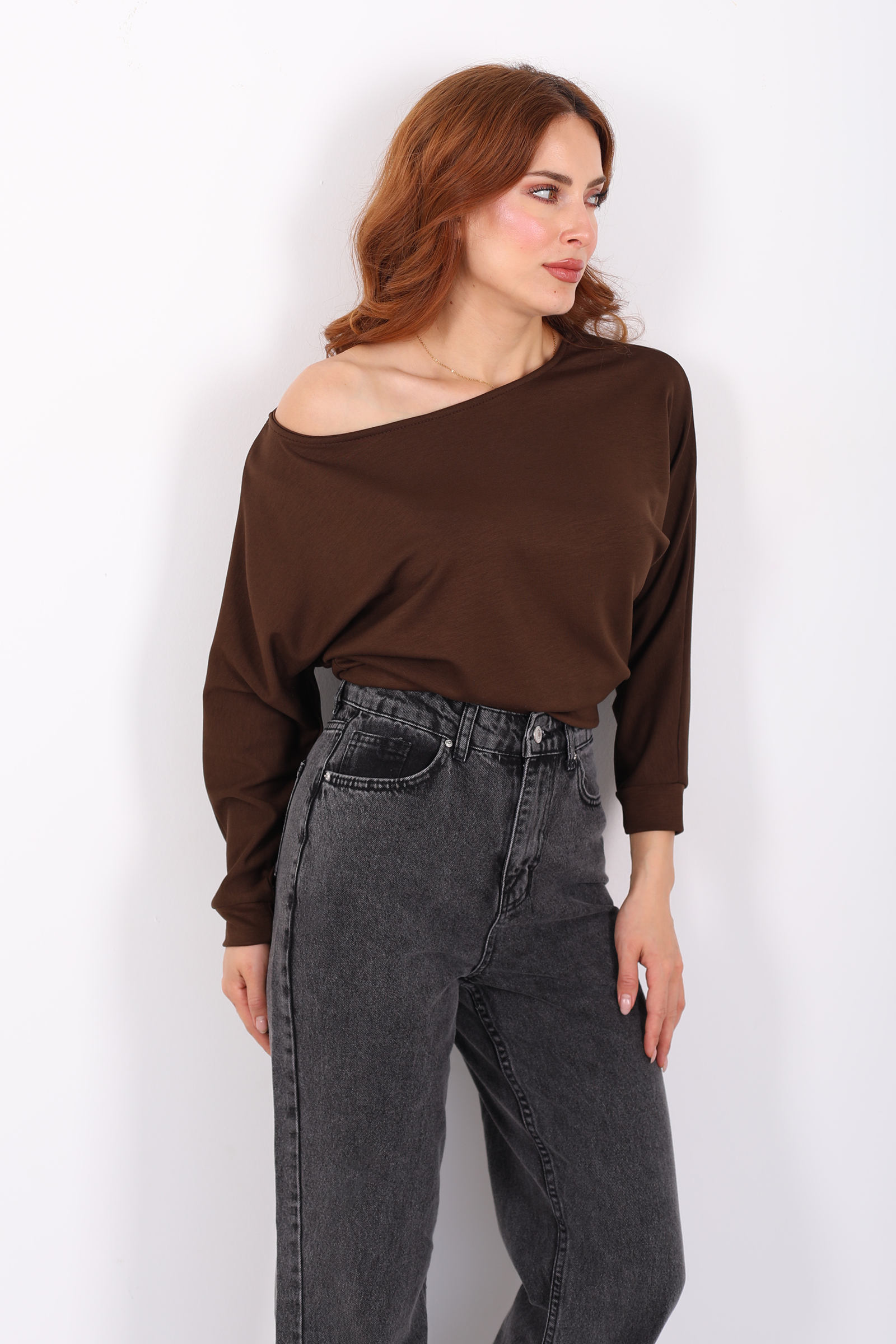 Beli Lastikli Kayık Yaka Kahverengi Kadın Modal Bluz