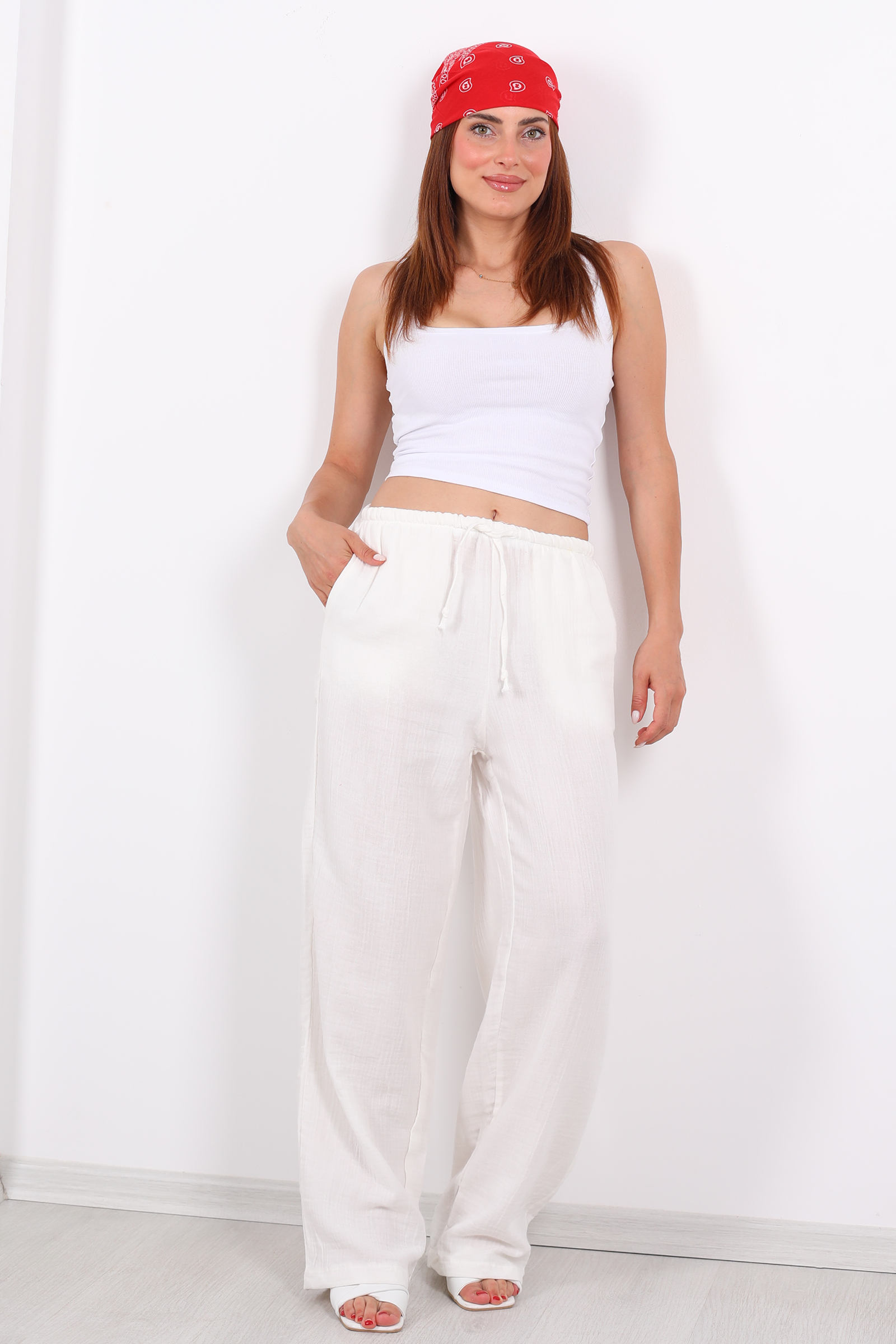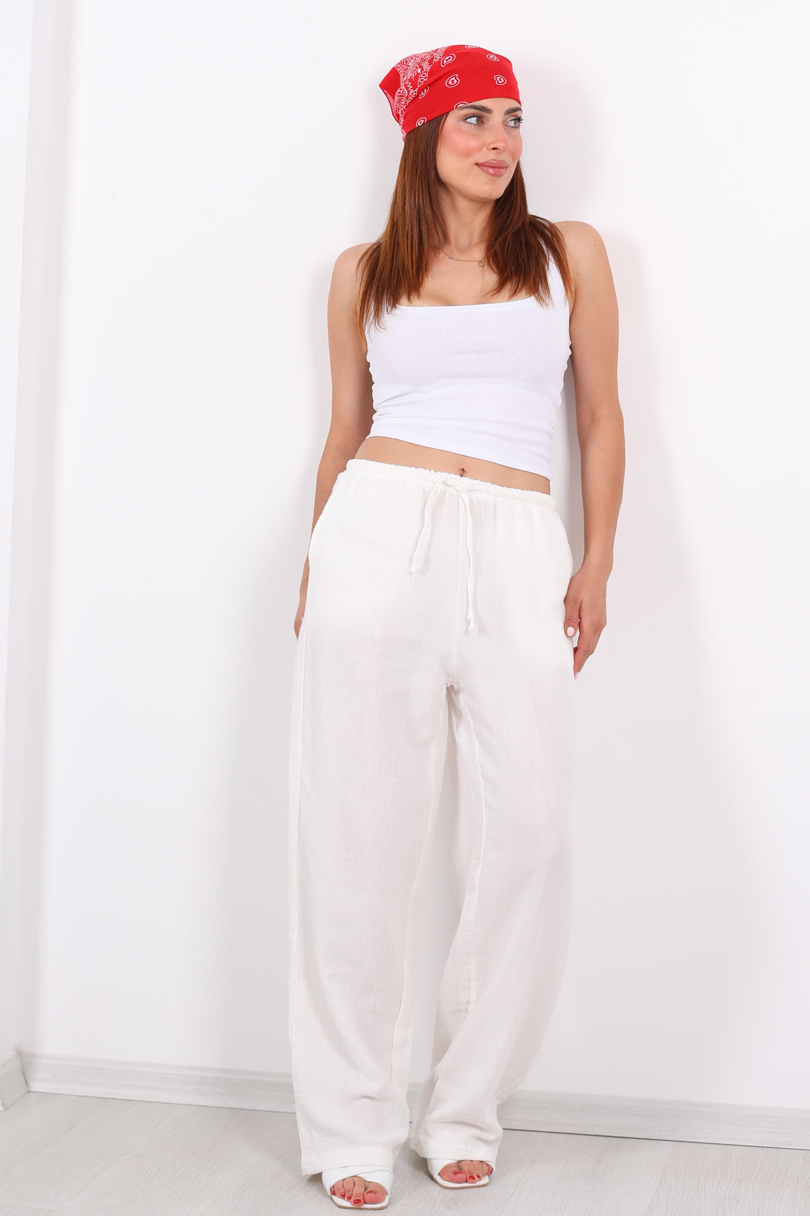 Sıcak yaz günlerinin vazgeçilmezi olacak bu pantolon, hafif ve nefes alabilen müslin kumaşıyla cildinize nazikçe dokunur. Beli lastikli tasarımı, esneklik ve rahatlık sunarken, bol paça kesimi hareket özgürlüğünüzü kısıtlamaz. Ekru rengi, sade ve şık bir görünüm sağlar; ister günlük kombinlerinizde ister özel davetlerde rahatlıkla tercih edebilirsiniz. Türkiye'de üretilen bu pantolon, kaliteli işçiliği ve modern tasarımıyla gardırobunuzun vazgeçilmez parçalarından biri olmaya aday.