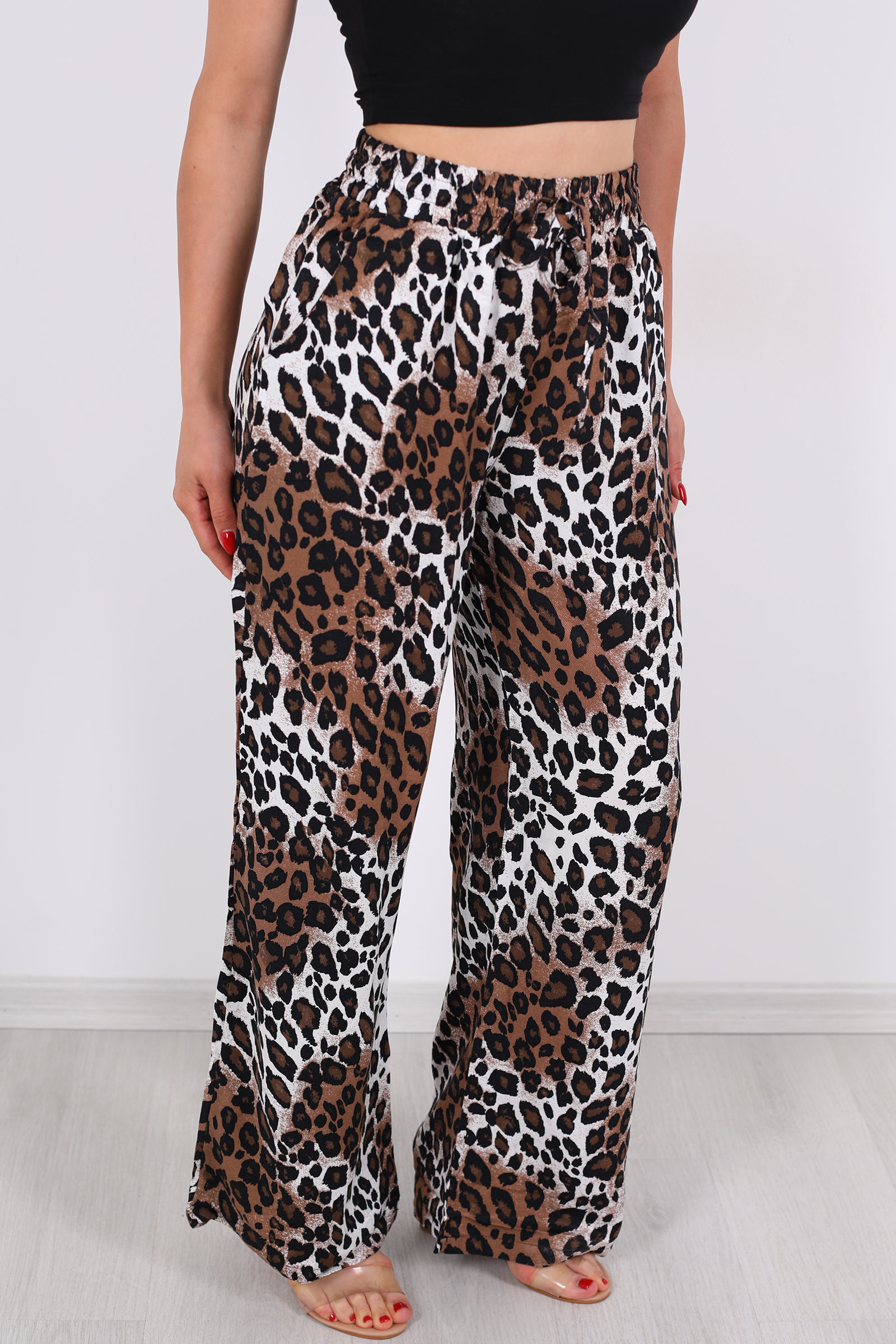 Cesur desenlerle modern şıklığı buluşturan bu leopar desenli saten pantolon, parlak dokusu ve canlı baskısıyla stilinize özgün bir dokunuş katıyor. Pürüzsüz yüzeyiyle ışığı yakalayarak hareket ederken şık bir parıltı sunar.Beli lastikli yapısı, tüm vücut tiplerine uyum sağlarken, gün boyu konfor ve esneklik sunmayı hedefler.Geniş paça kesimi, hem farklı kombinlerle kolaylıkla uyum sağlar hem de bacak boyunu uzun gösterir.