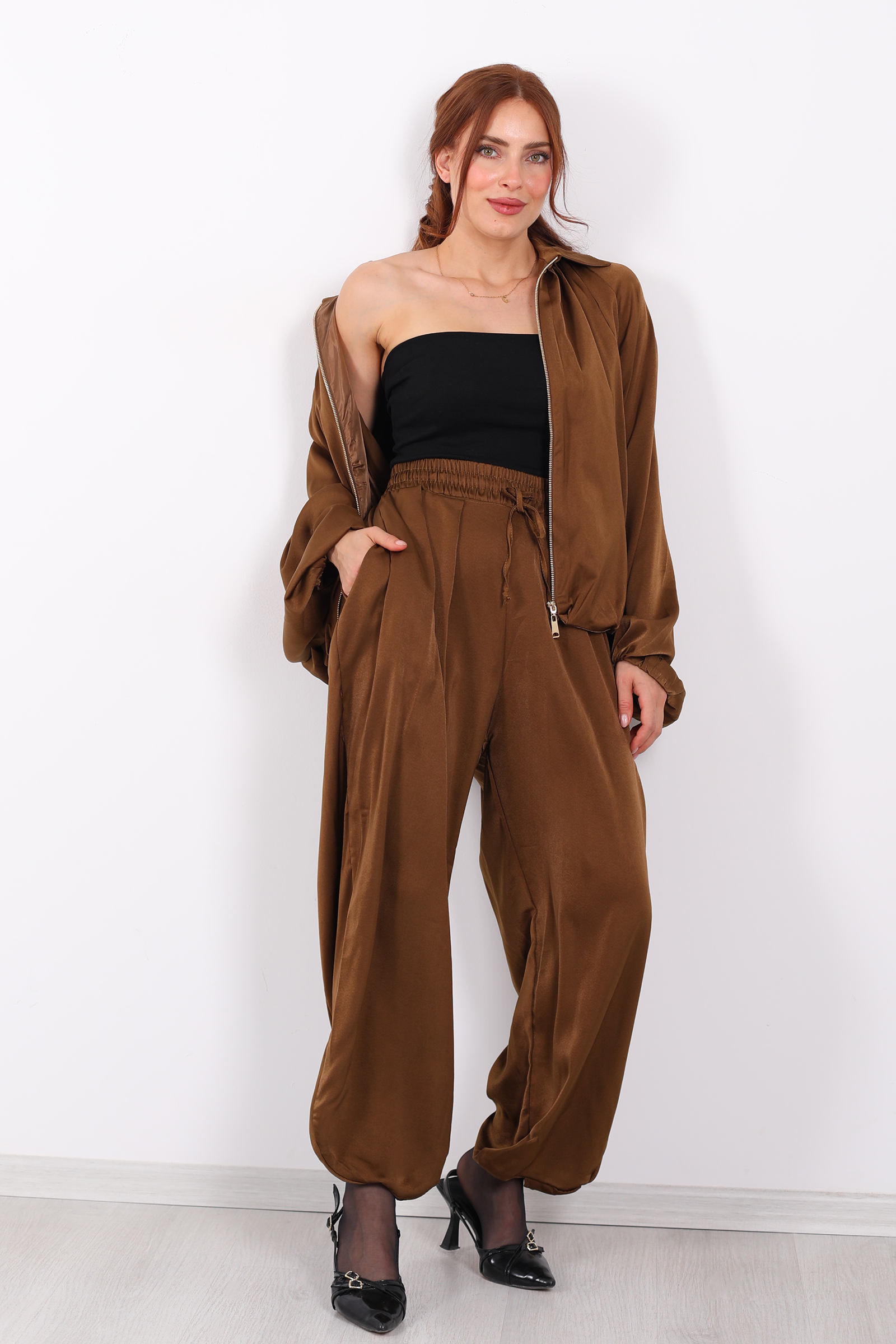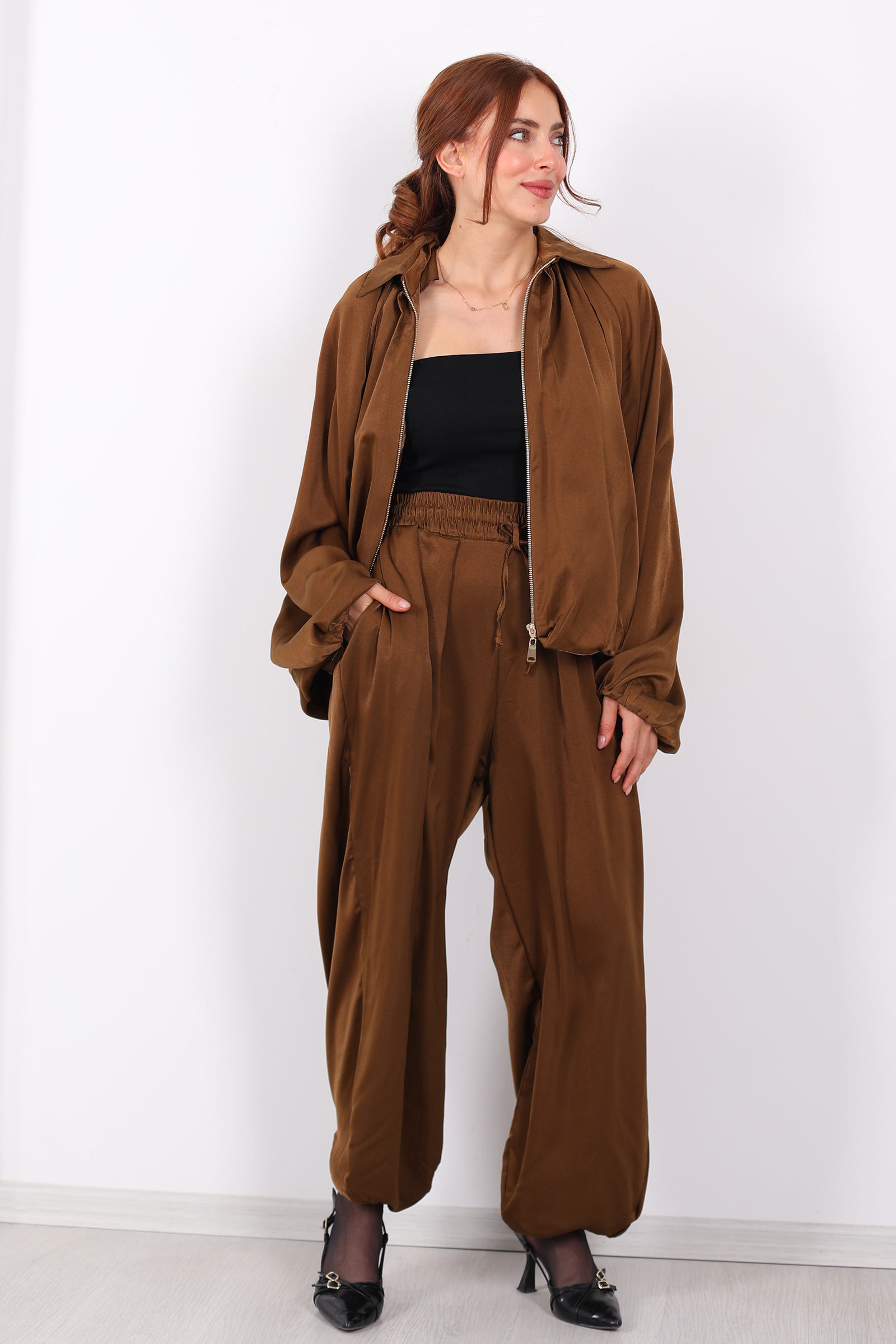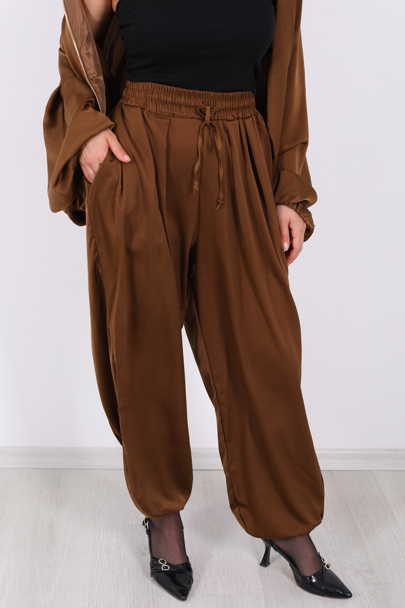 Bu Beli Lastikli Saten Taba Kadın Şalvar, zarafeti ve rahatlığı bir araya getiren sofistike bir parça. Taba rengi sıcak ve doğal bir ton sunarken, saten kumaş parlak ve akıcı dokusuyla lüks bir his verir. Belinde yer alan lastik detayı sayesinde yüksek konfor sağlar, kolayca giyilip çıkarılabilir ve beden uyumunu artırır.