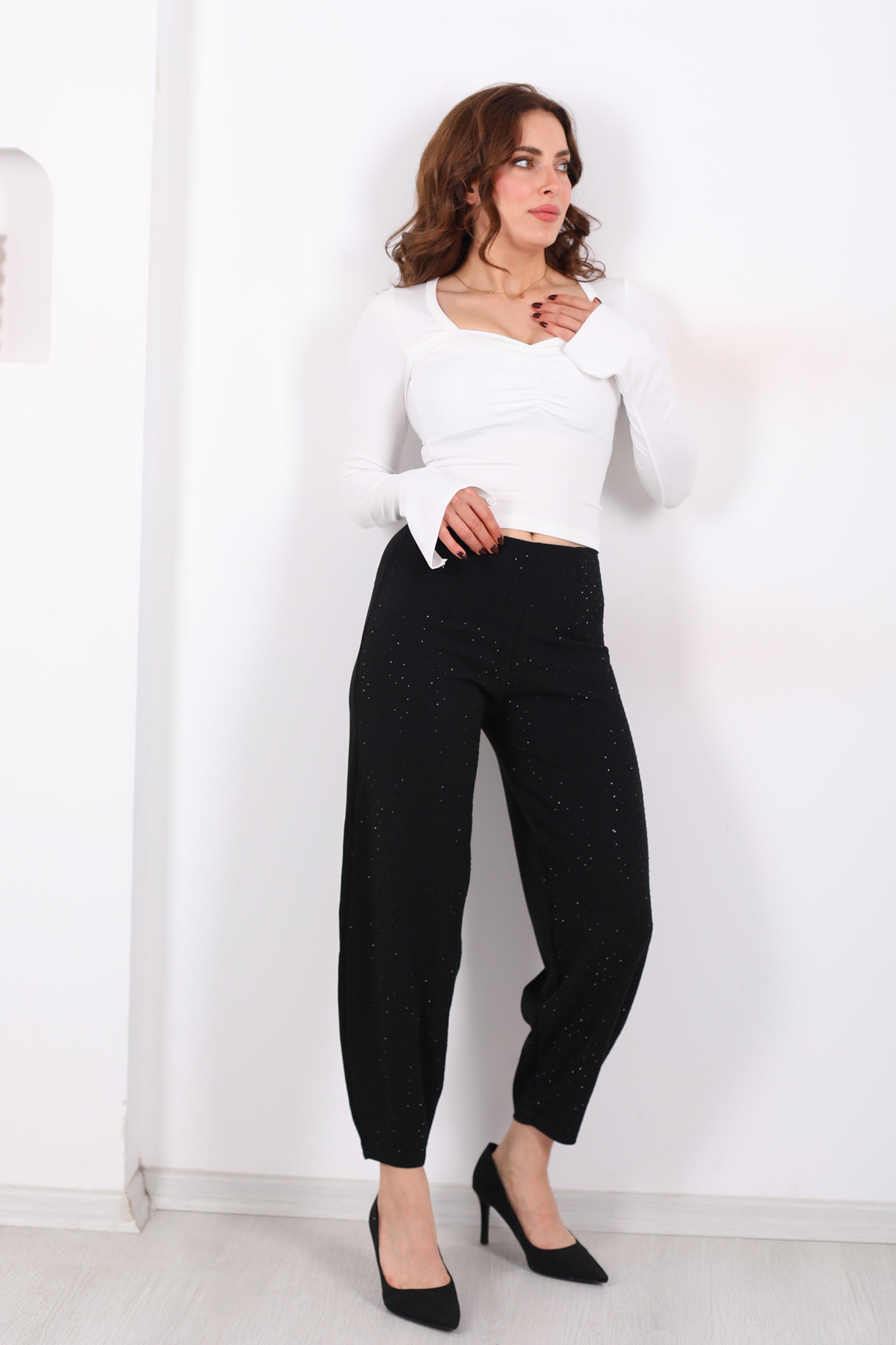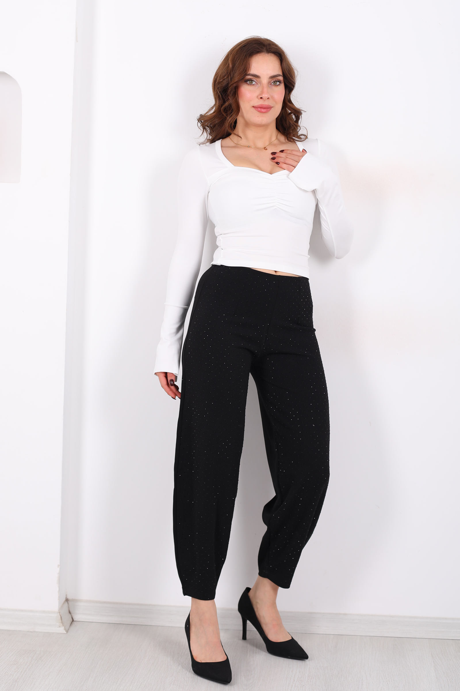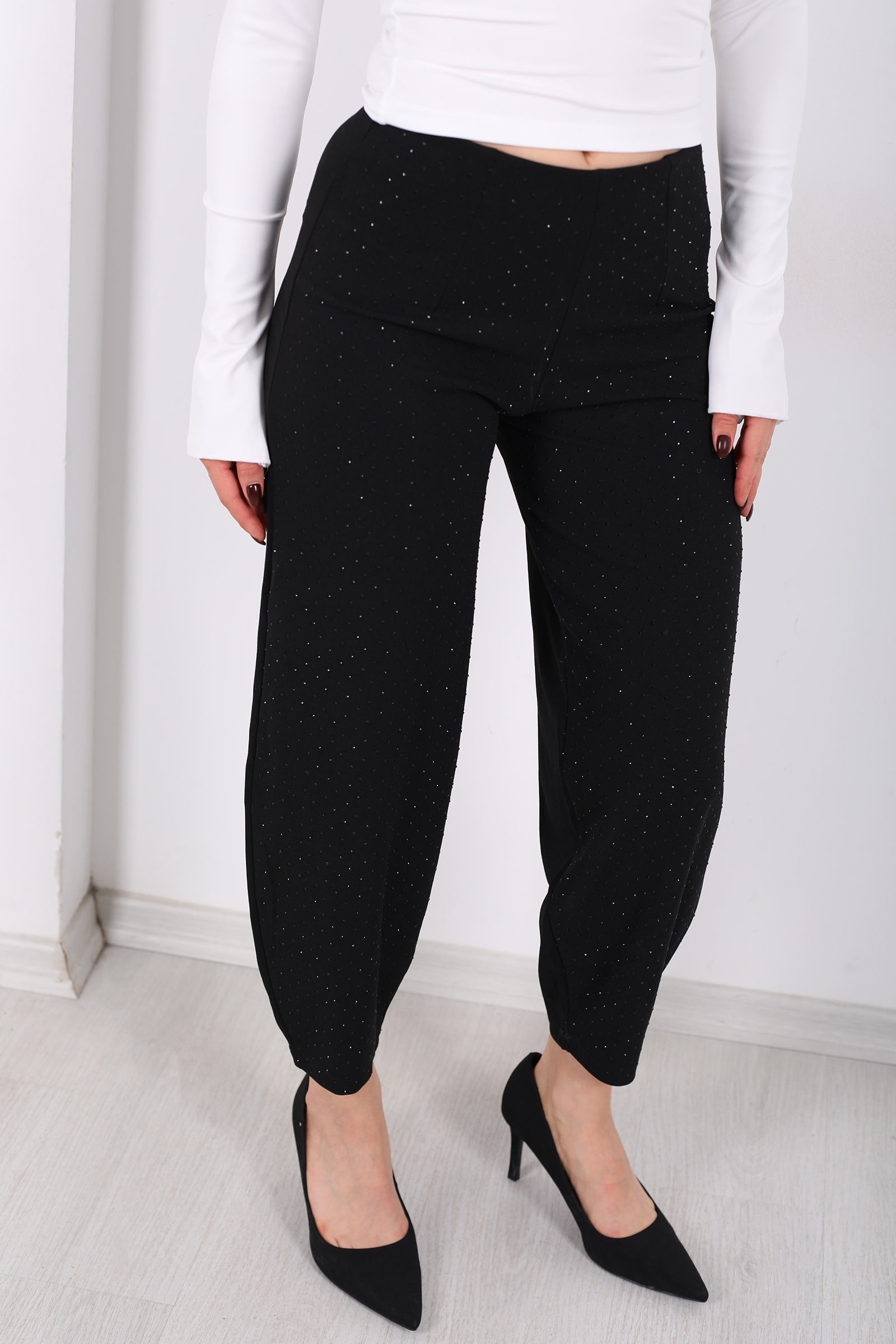 Beli Lastikli Serpme Taşlı Kadın Siyah Krep Şalvar