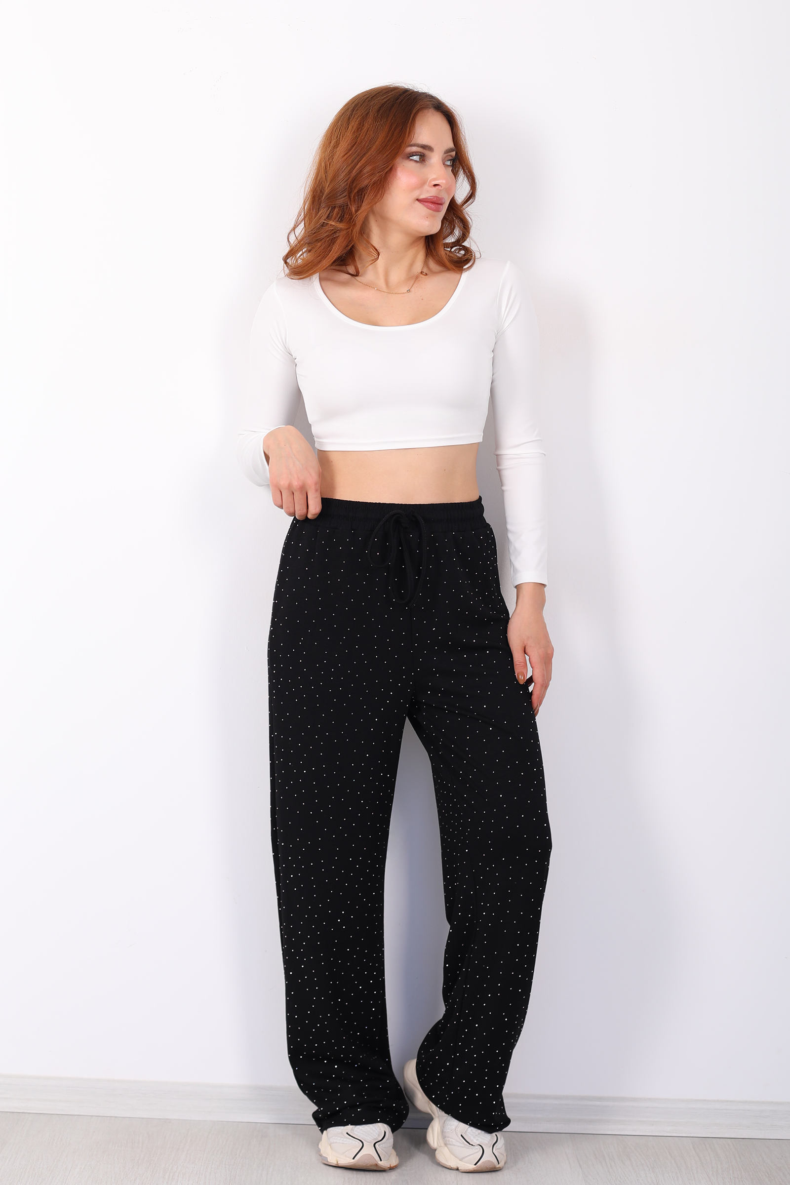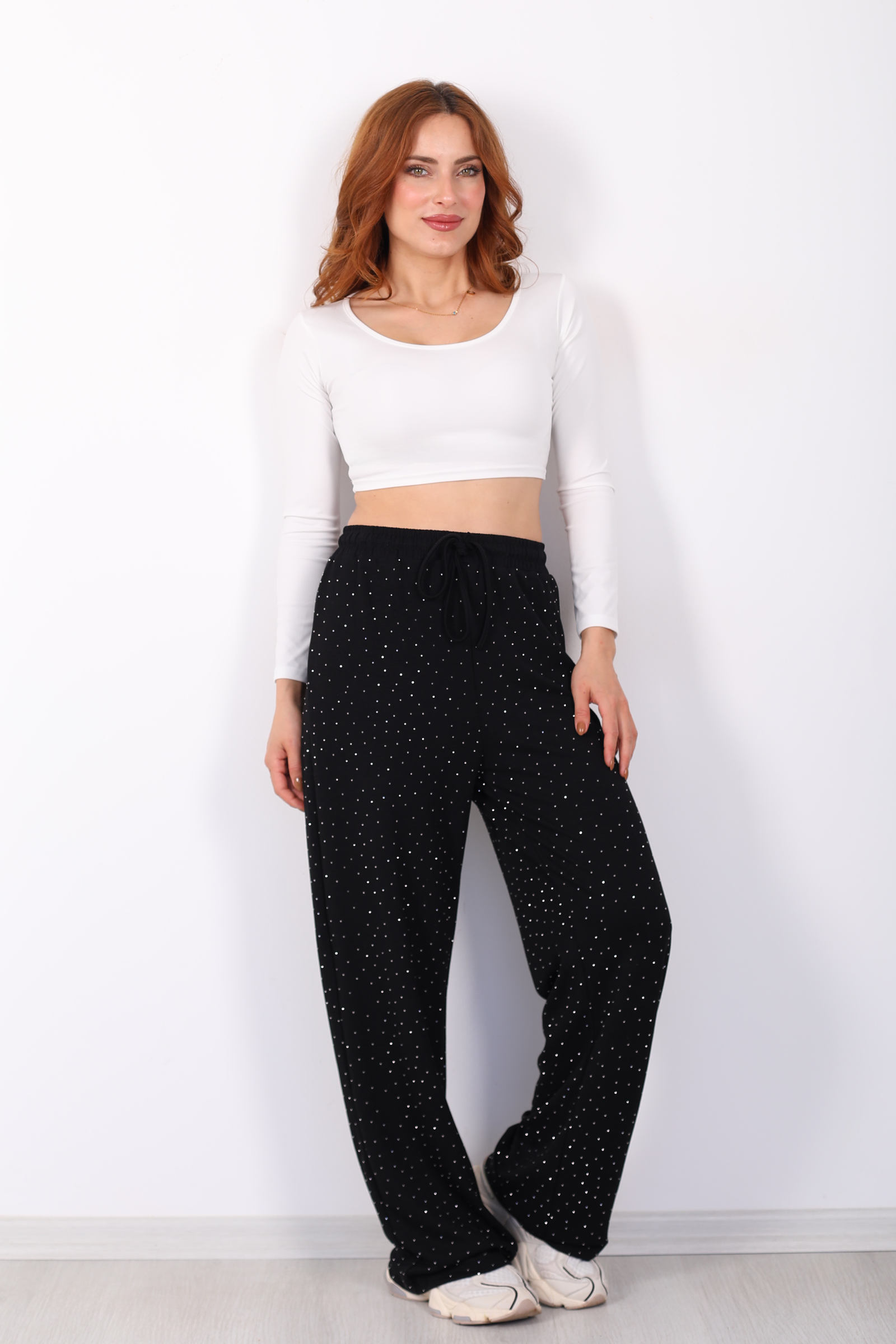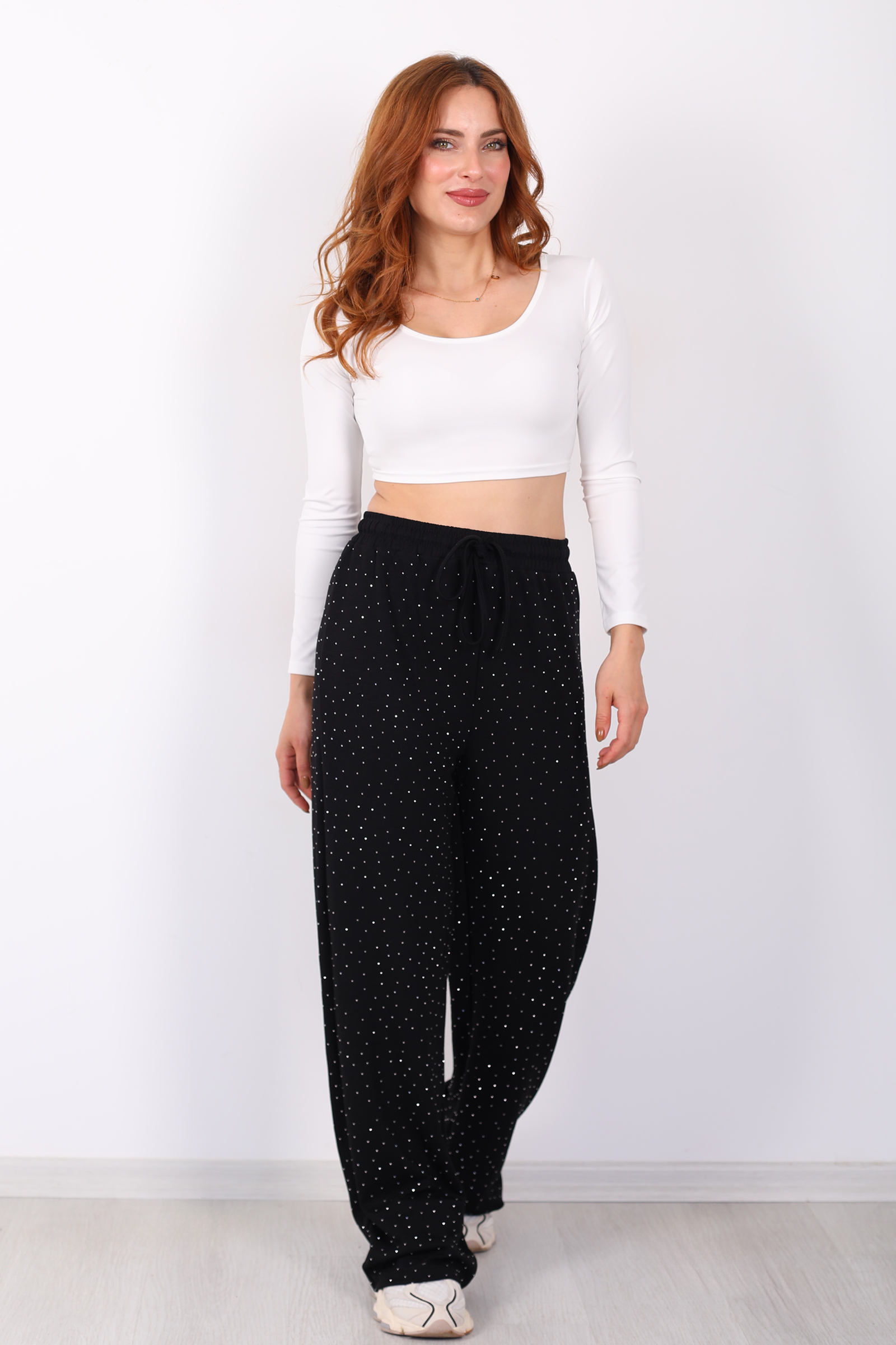 Beli Lastikli Siyah Kadın Taşlı Pantolon