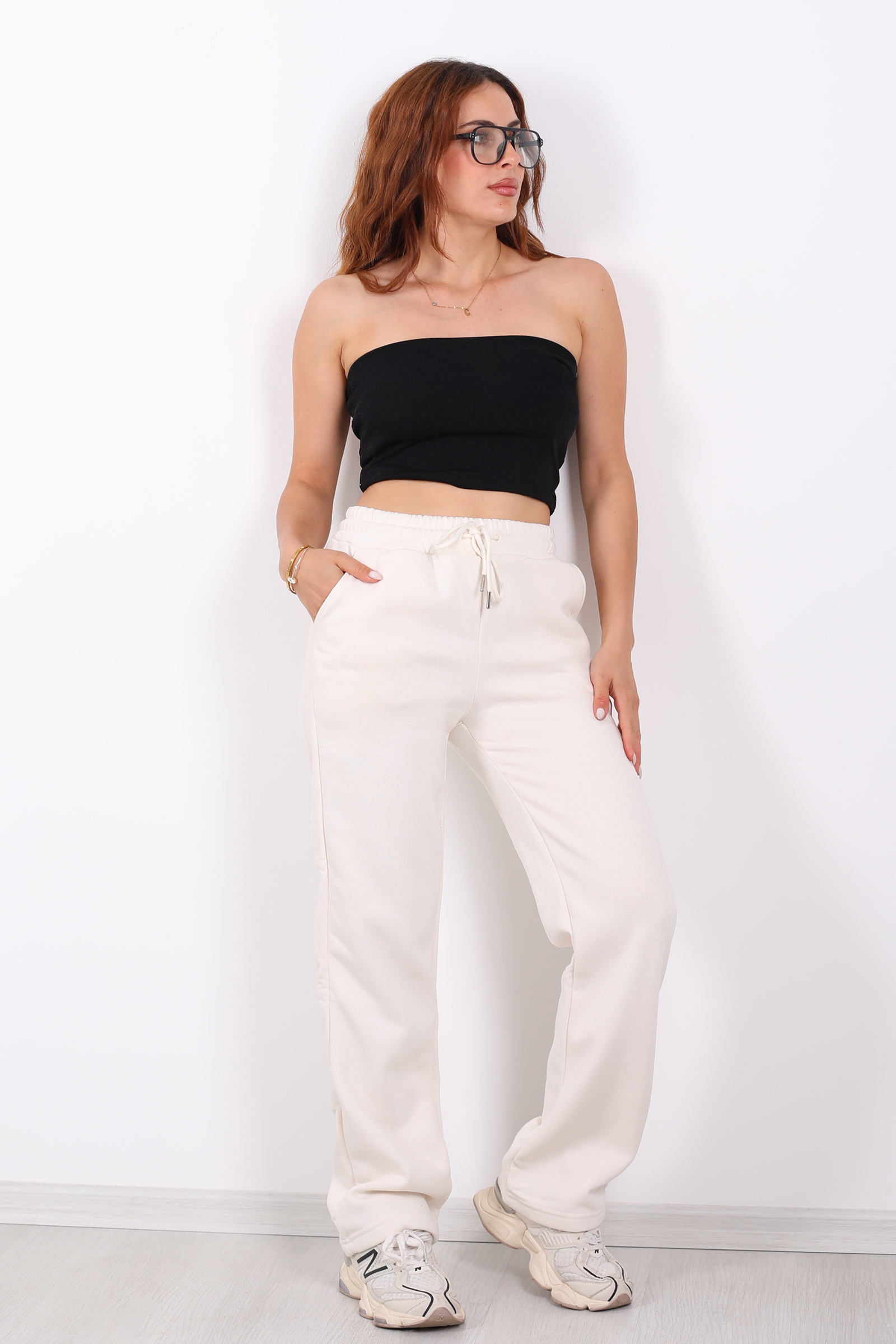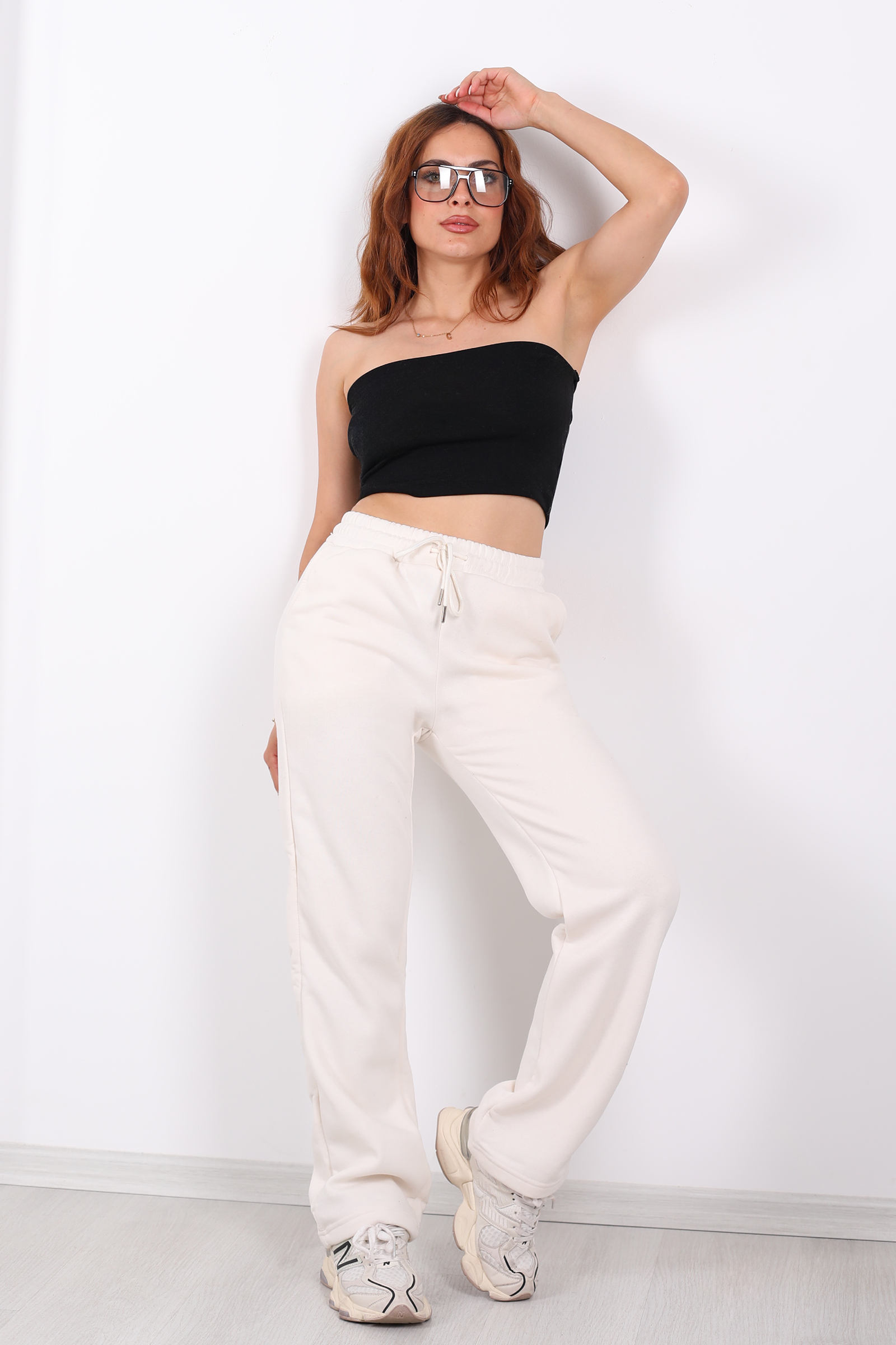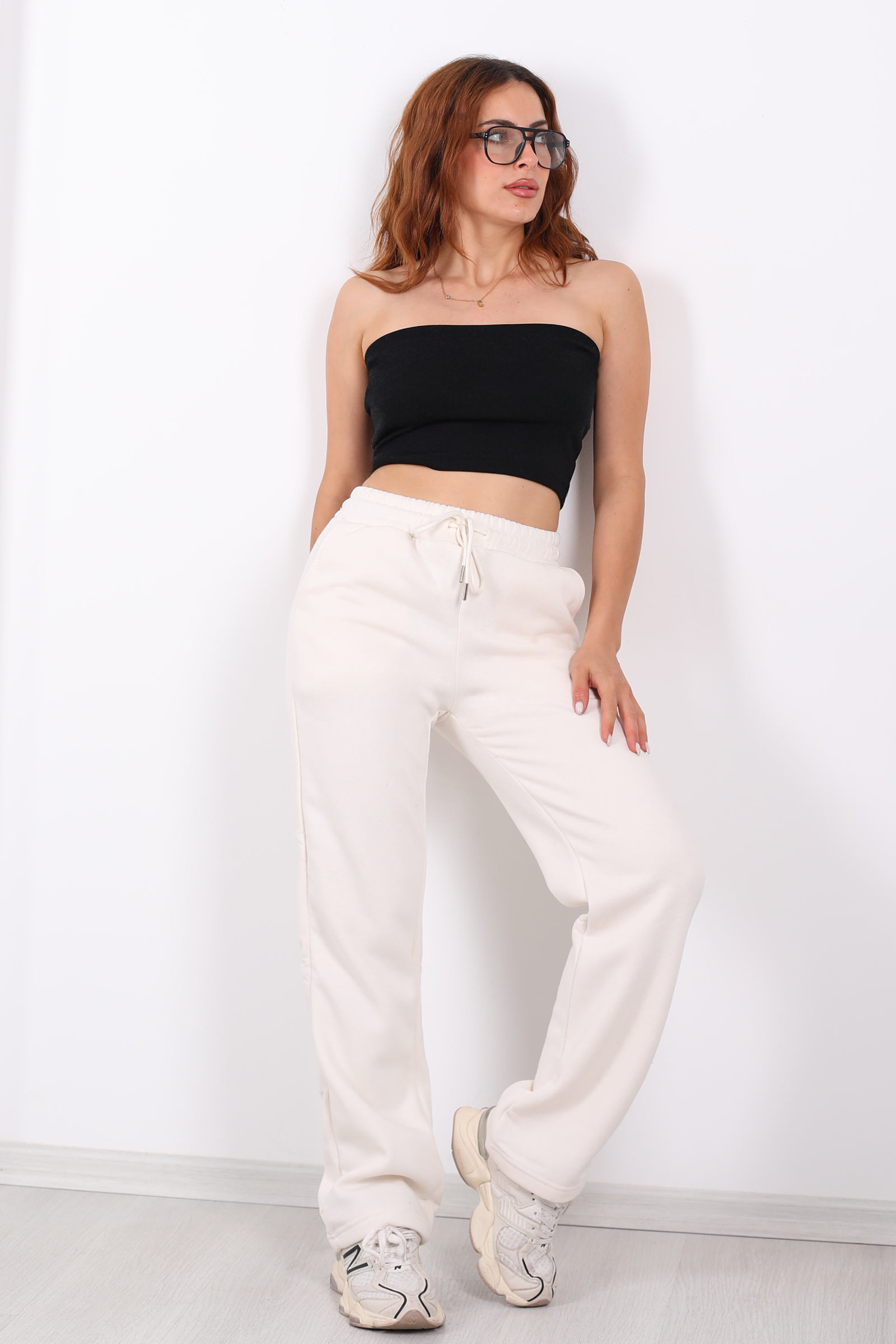 Beli Lastikli Üç İplik Boru Paça Ekru Kadın Eşofman Altı, zarif detayları ve modern tasarımıyla gardırobunuzun vazgeçilmez parçalarından biri olmaya aday. Ekru rengi, her mevsime uyum sağlayan sofistike bir ton sunar. Üç iplik kumaş yapısı, sıcak tutarken nefes alabilirlik sağlar. Boru paça kesimi, modern bir görünüm sunar ve rahat hareket imkânı tanır. Bel kısmındaki lastik detayları, esnek bir oturuş sağlar ve konforu artırır.