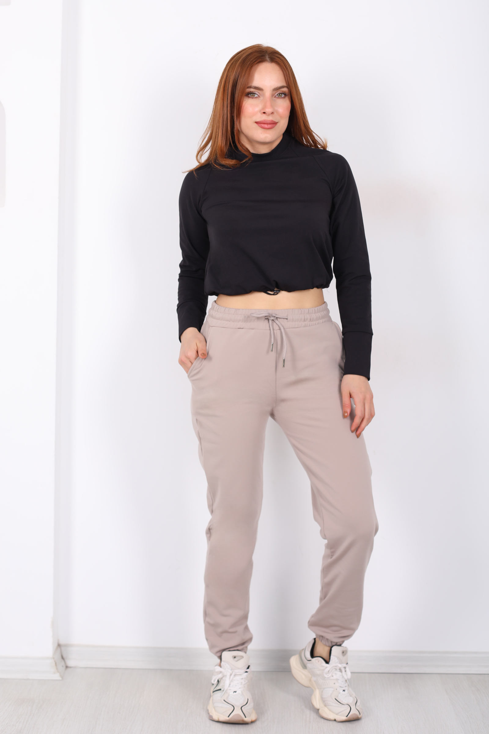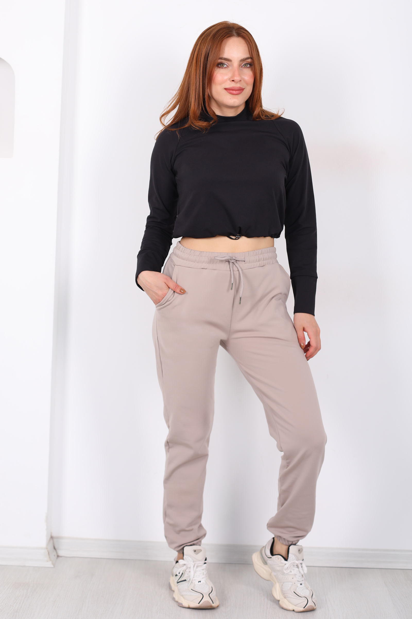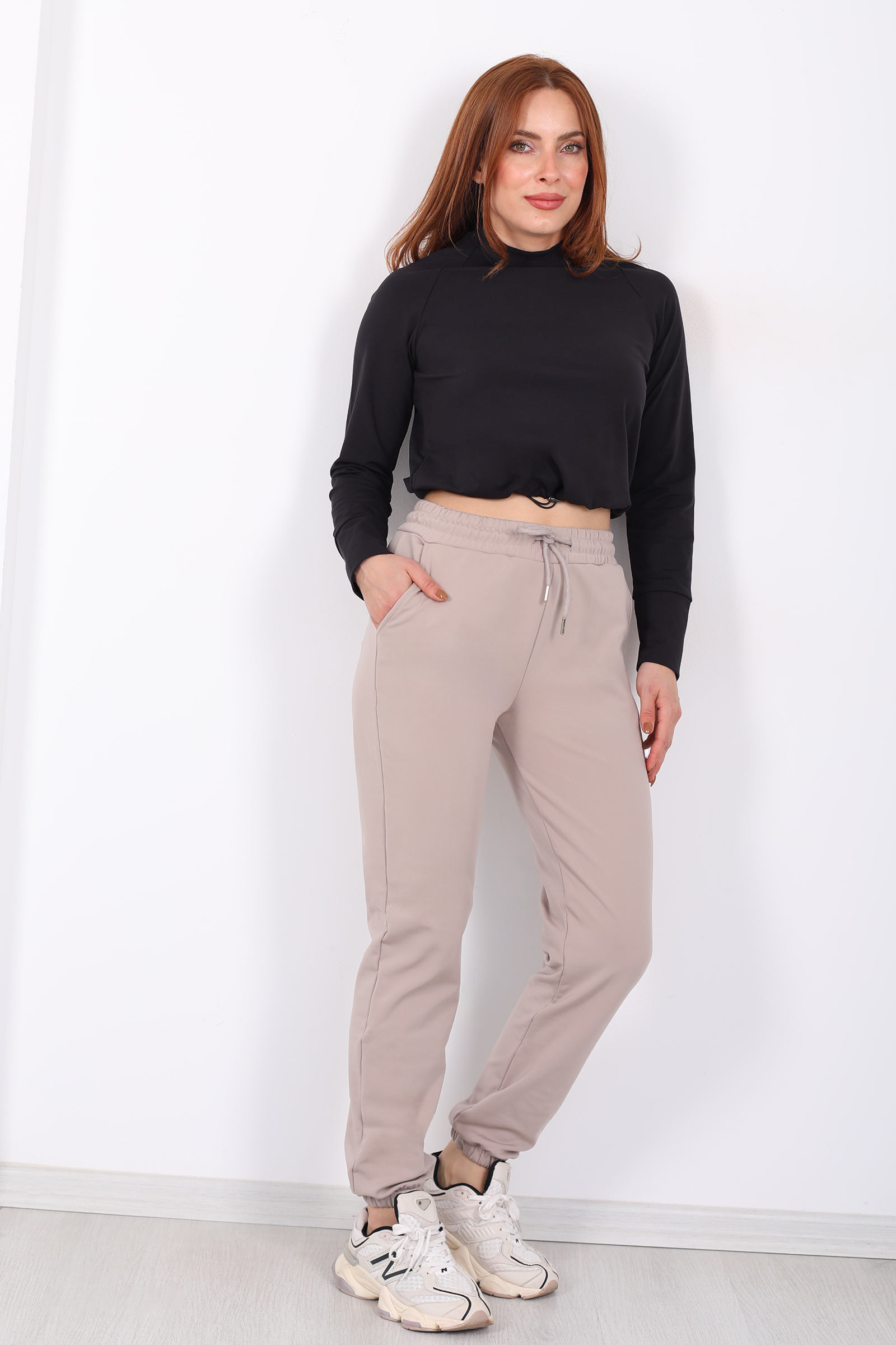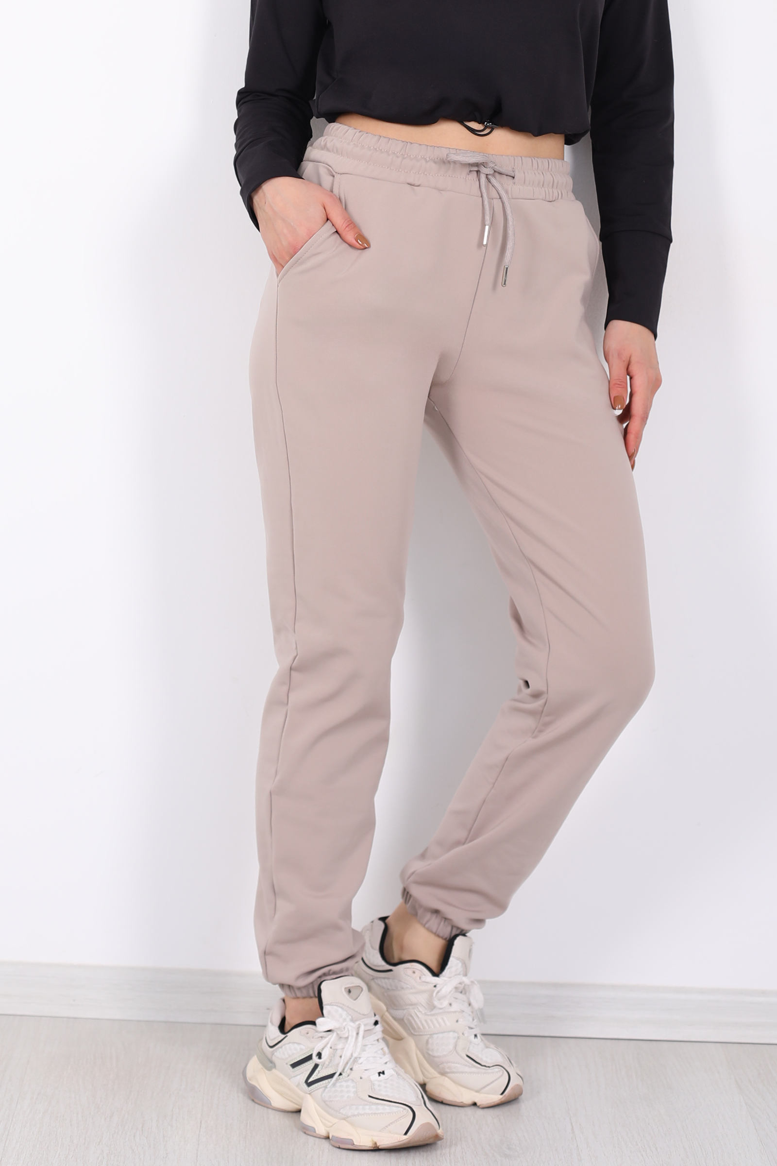 Beli Lastikli Üç İplik Bej Kadın Jogger Eşofman Altı