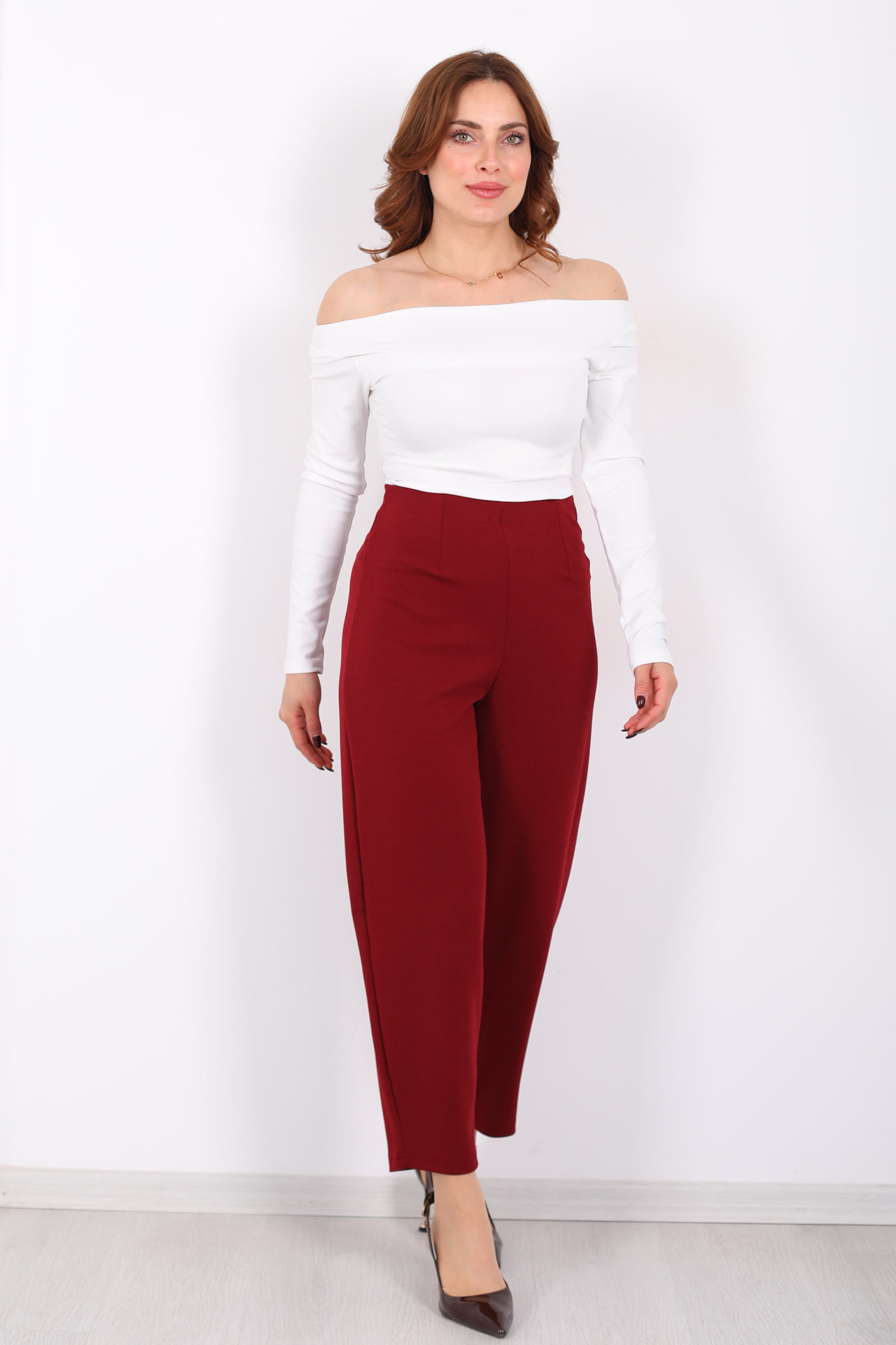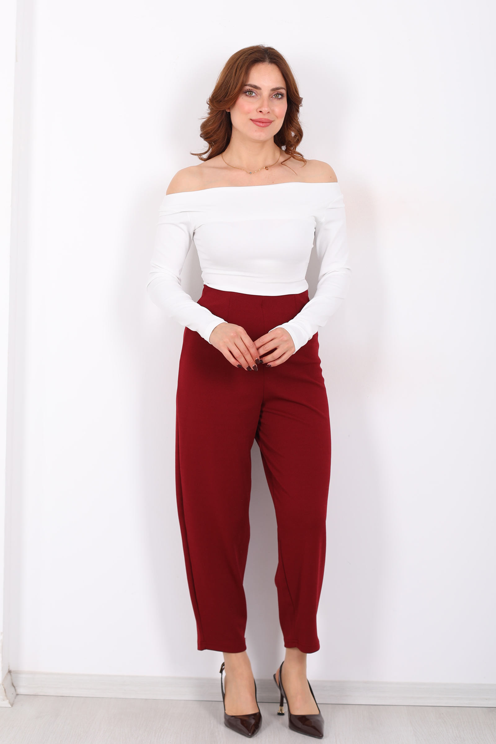 Zengin bordo tonuyla dikkat çeken balon pantolon, beldeki pens detaylarıyla hacmi dengeler ve akıcı bir siluet yaratır. Krep kumaş, zarif dokusuyla konforu hissettirirken hareket özgürlüğünü korur. Koyu bordo rengi, sade üstlerle bile stilinizin enerjisini yükseltir; jean, basic tişört ya da şık bluzlarla uyumlu kontrastlar kurar. Volümlü formuyla klasik pantolonlardan ayrışan bu model, görünümünüze sofistike ama canlı bir hava ekler.