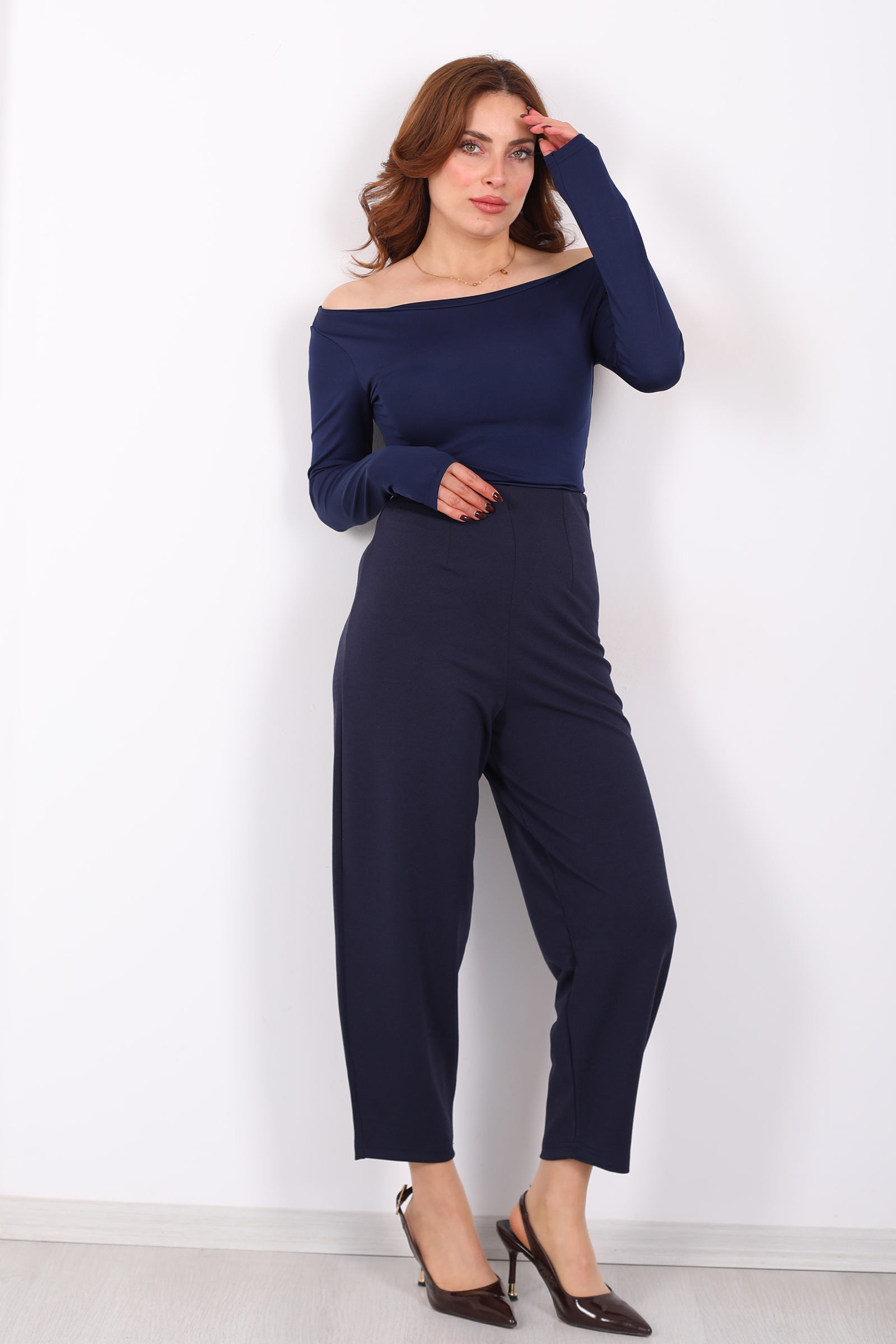 Bu lacivert krep pantolon, balon kesimiyle klasik siluetlere farklı bir ritim kazandırıyor. Beldeki pensler, alt beden hattına yumuşak bir hacim vererek hareket sırasında akıcı bir görünüm sağlar. Yüksek kaliteli krep kumaş, dokusuyla konforlu bir his yaratırken lacivert tonu kombinlerinize derinlik ve dinginlik katar. Günlük şehir stilinden modern iş kombinlerine kadar pek çok stil arayışına uyum sağlayan yapısı sayesinde sade parçalarla bile etkileyici bir görünüm yaratabilirsiniz. Pantolonun dengeli volümü, farklı üstlerle özgün kontrastlar kurmanıza olanak tanır.