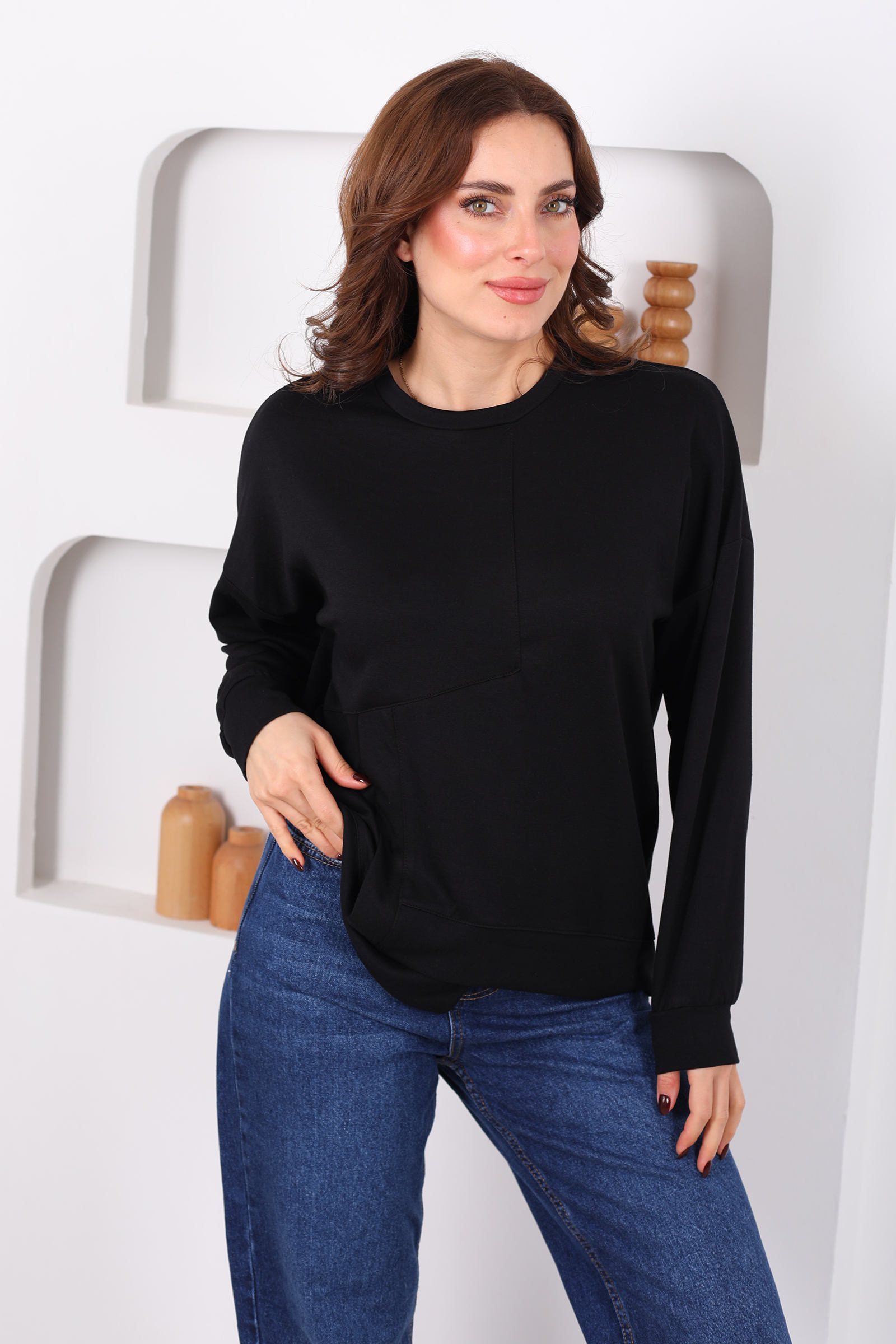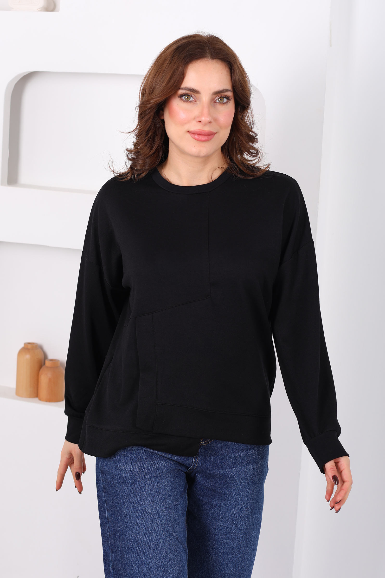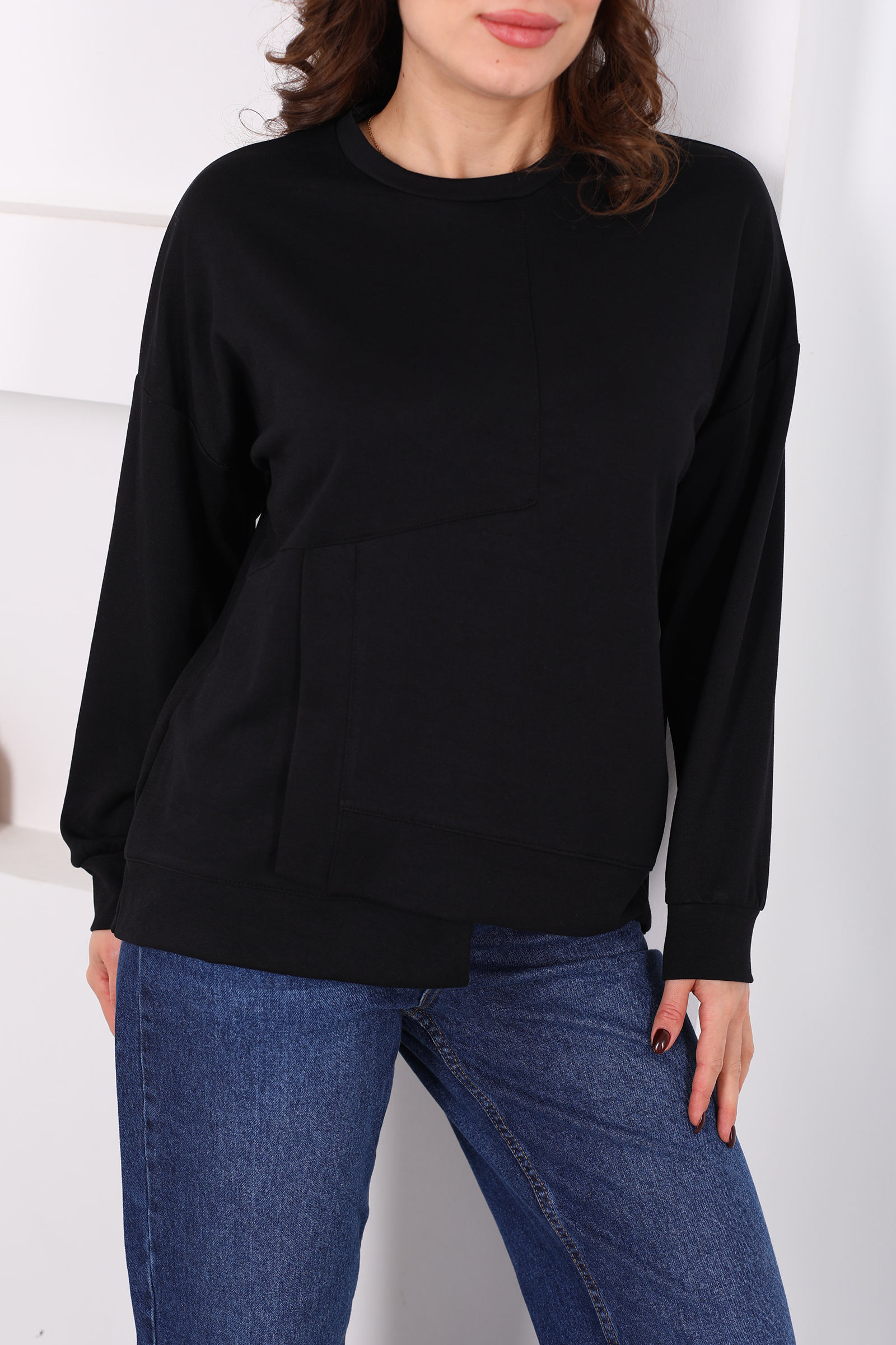 Bisiklet Yaka Asimetrik Parçalı Siyah Kadın Sweat