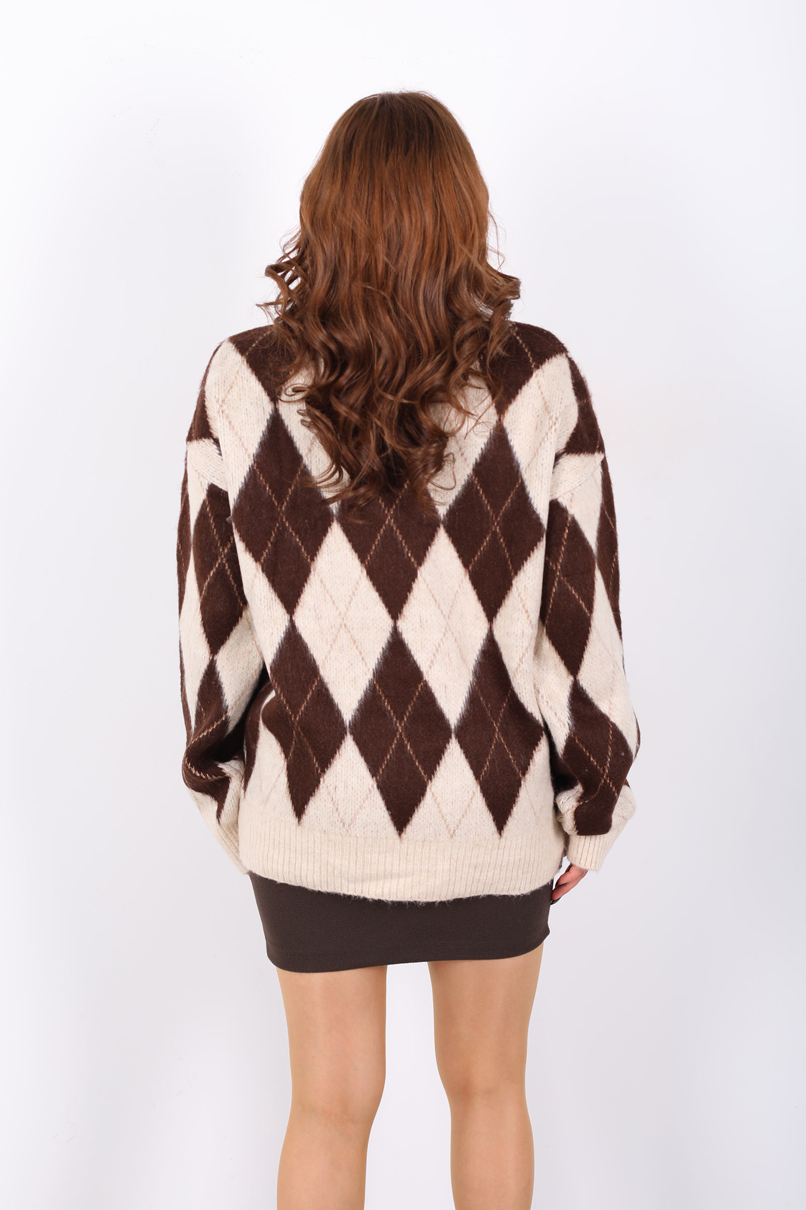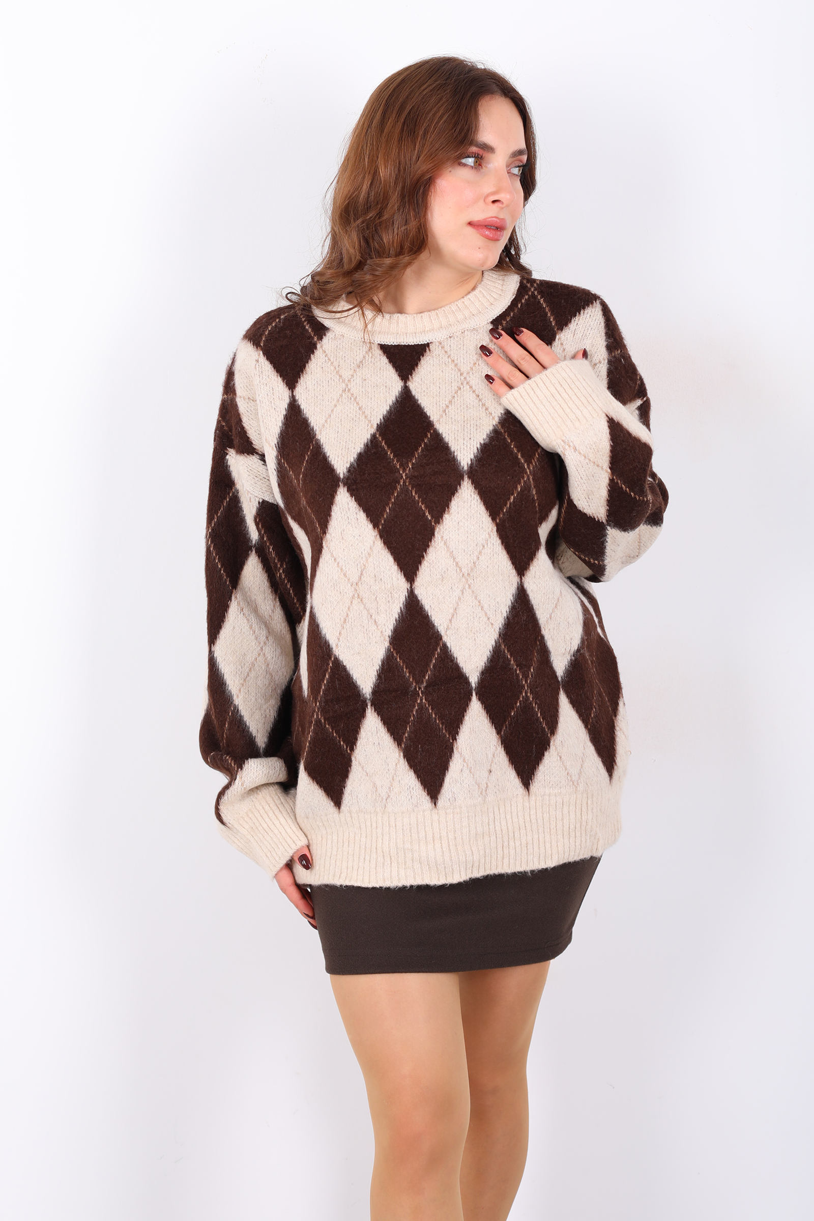 Bisiklet Yaka Baklava Desenli Oversize Bej Kadın Triko Kazak