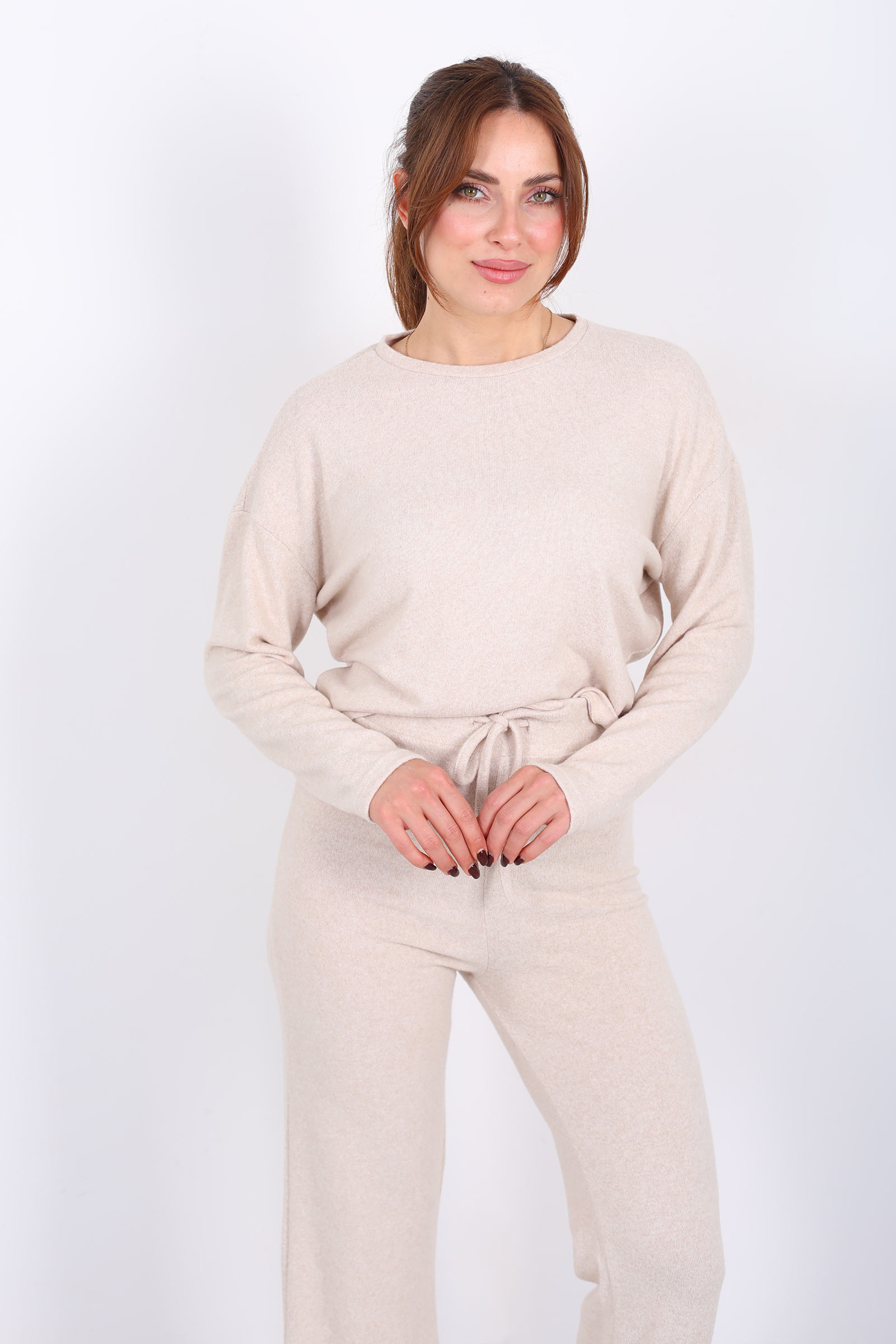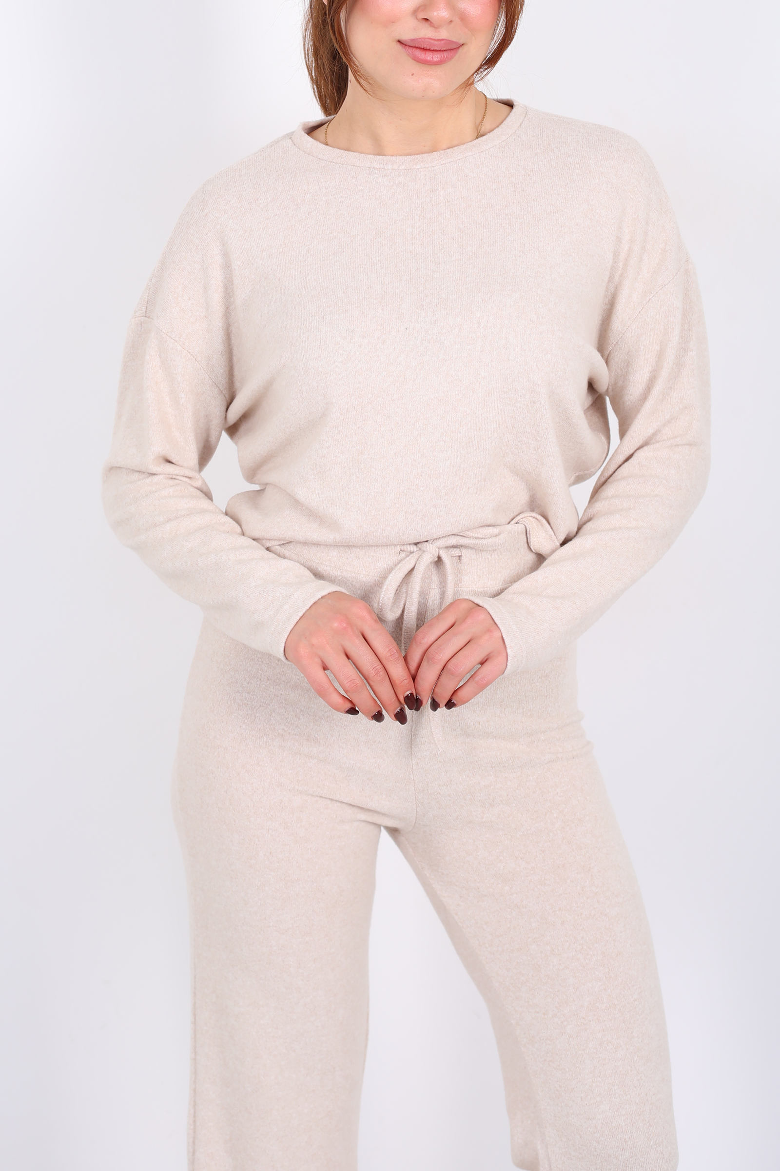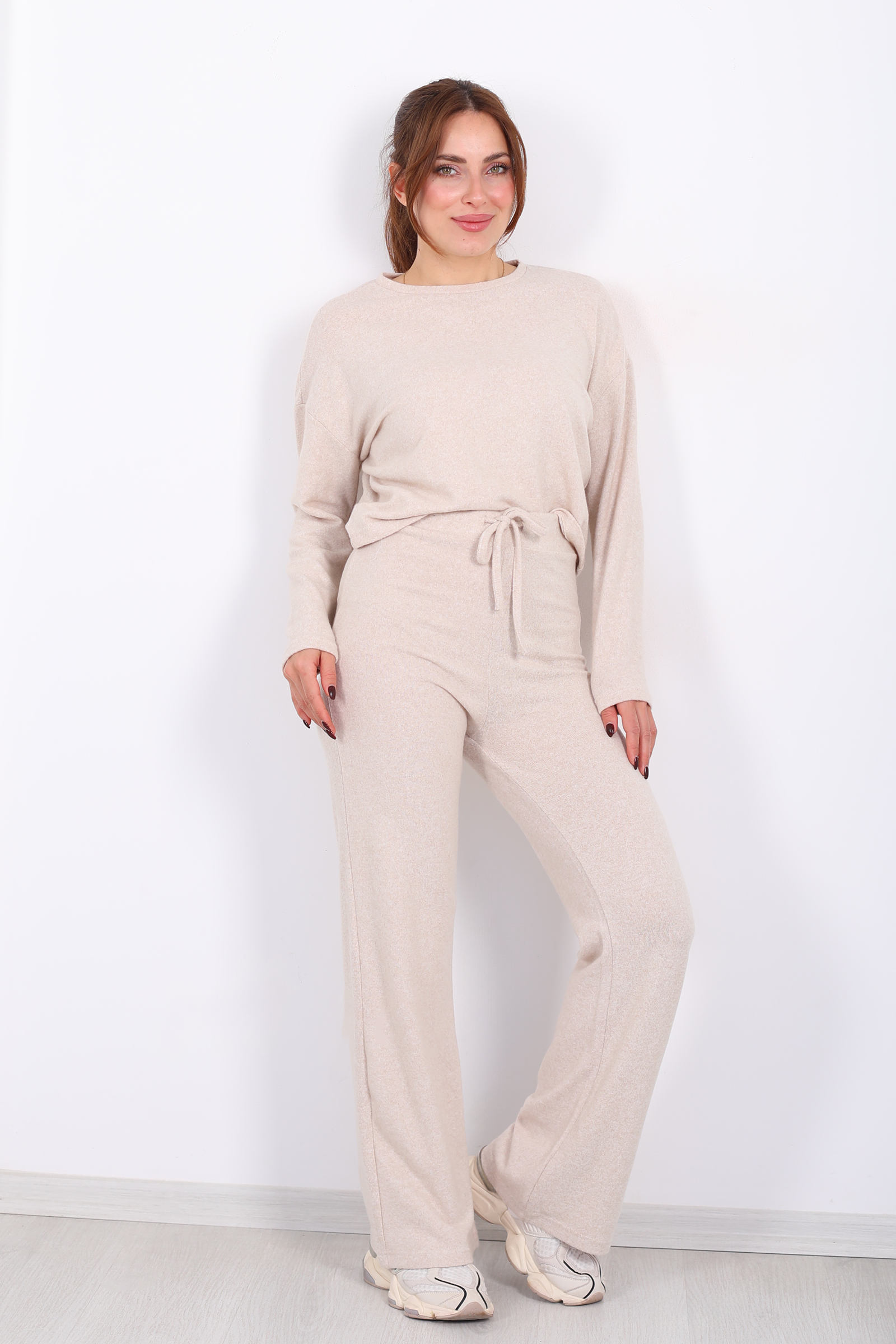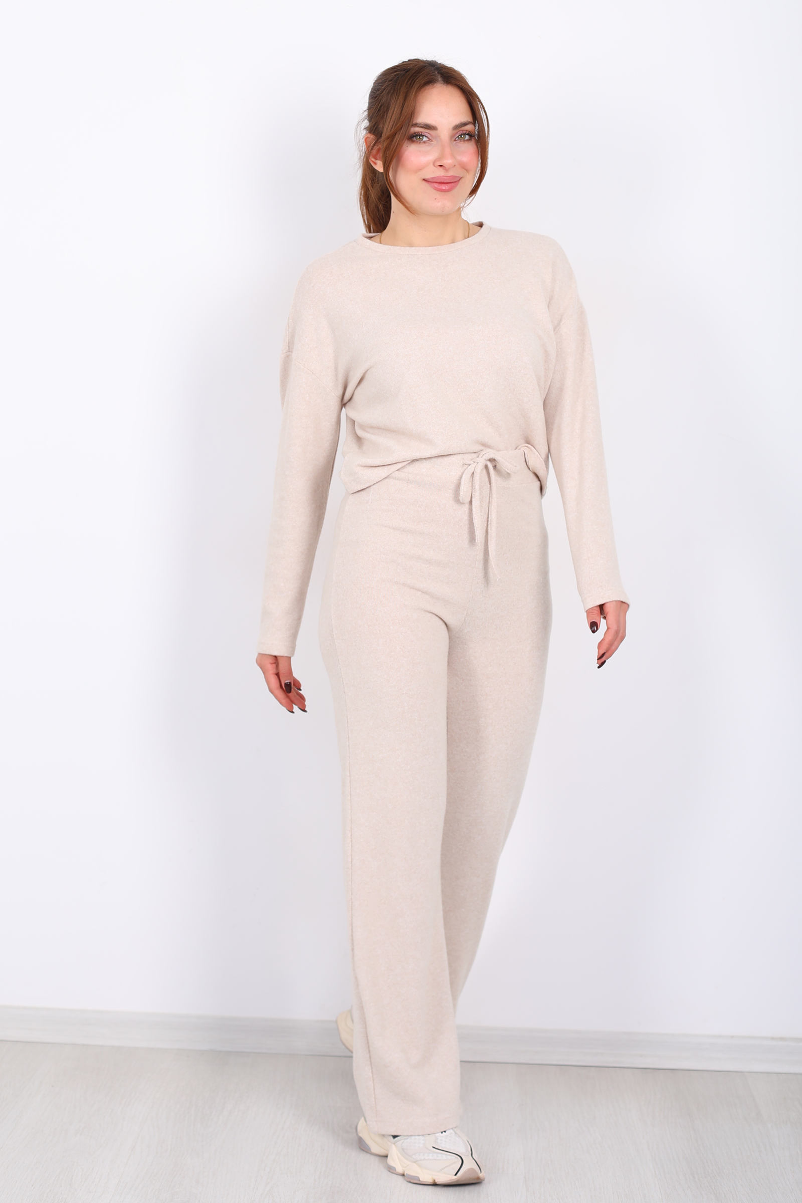 Taş rengi yumoş takım, bisiklet yaka üst ve beli bağlamalı detay ile sofistike bir rahatlık sunar. Yumuşak yumoş kumaşı gün boyu nazik bir dokunuş sağlar; beldeki bağlama detayı ise görünümde sportif ama feminen bir ayrıntı oluşturur. Takım halinde tasarlanmış olmasıyla pratik kombin sunan bu set, nötr tonu sayesinde farklı stil parçalarıyla kolay eşleşir. Günlük şehir stilinden hafta sonu buluşmalarına kadar farklı ortamlarda enerjik ama sade bir ifade yaratmak isteyenlerin tercih edebileceği bir seçenektir.