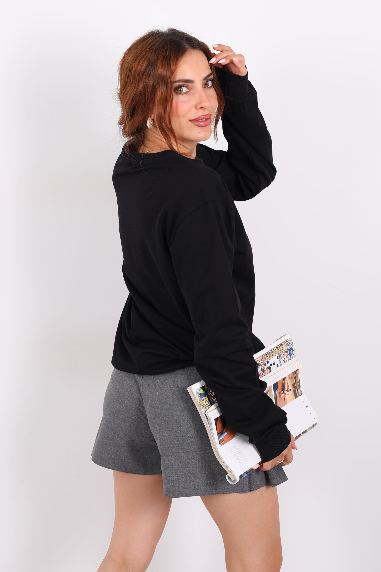 Gölgelerin diliyle konuşan; siyahın sade zarafetini BRX baskısıyla birleştiren bu iki iplik bisiklet yaka kadın kazak, stilinize sokak ruhunu taşır. Oversize kalıbı ve %100 pamuk kumaşı sayesinde hem sıcak tutar hem de nefes aldırır; kol boyu uzunluğu ve rahat kesimi ile hareket özgürlüğünü kısıtlamaz.