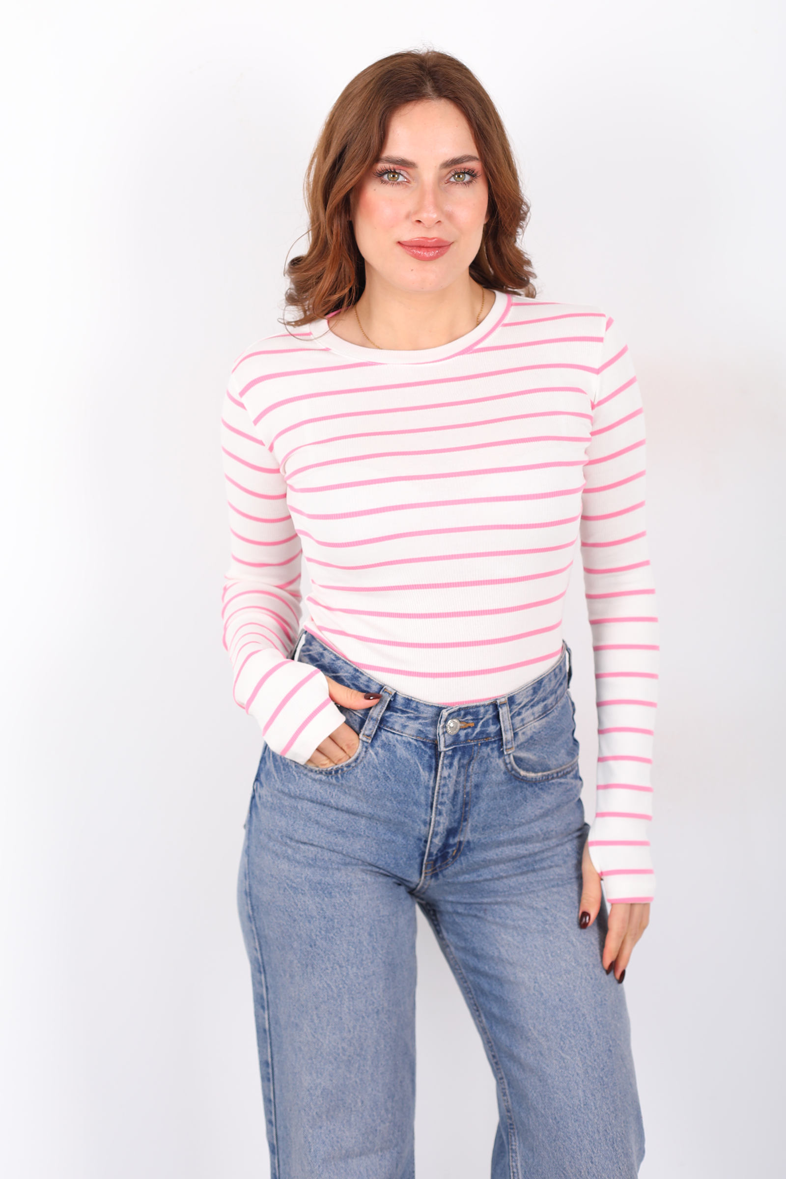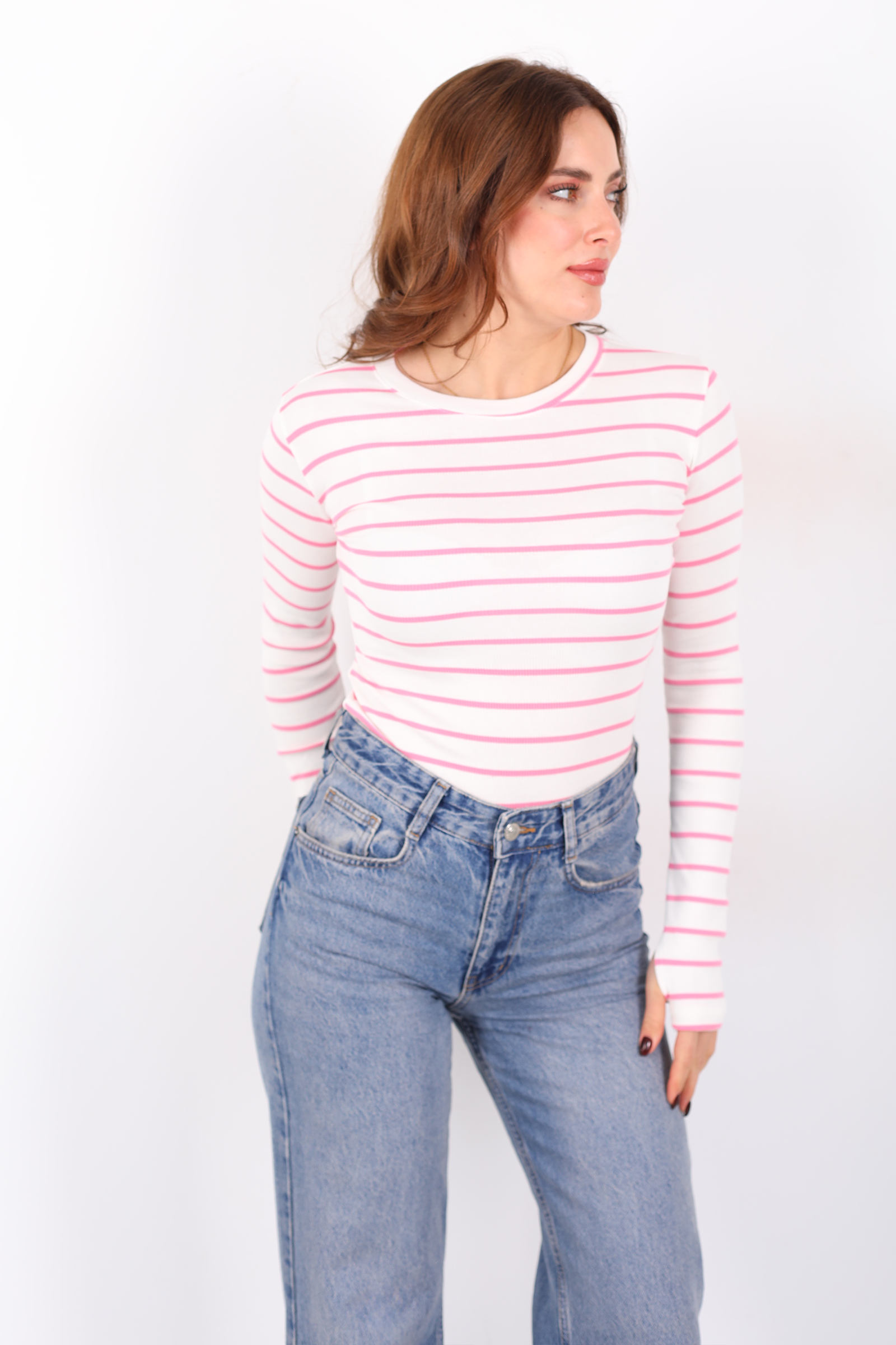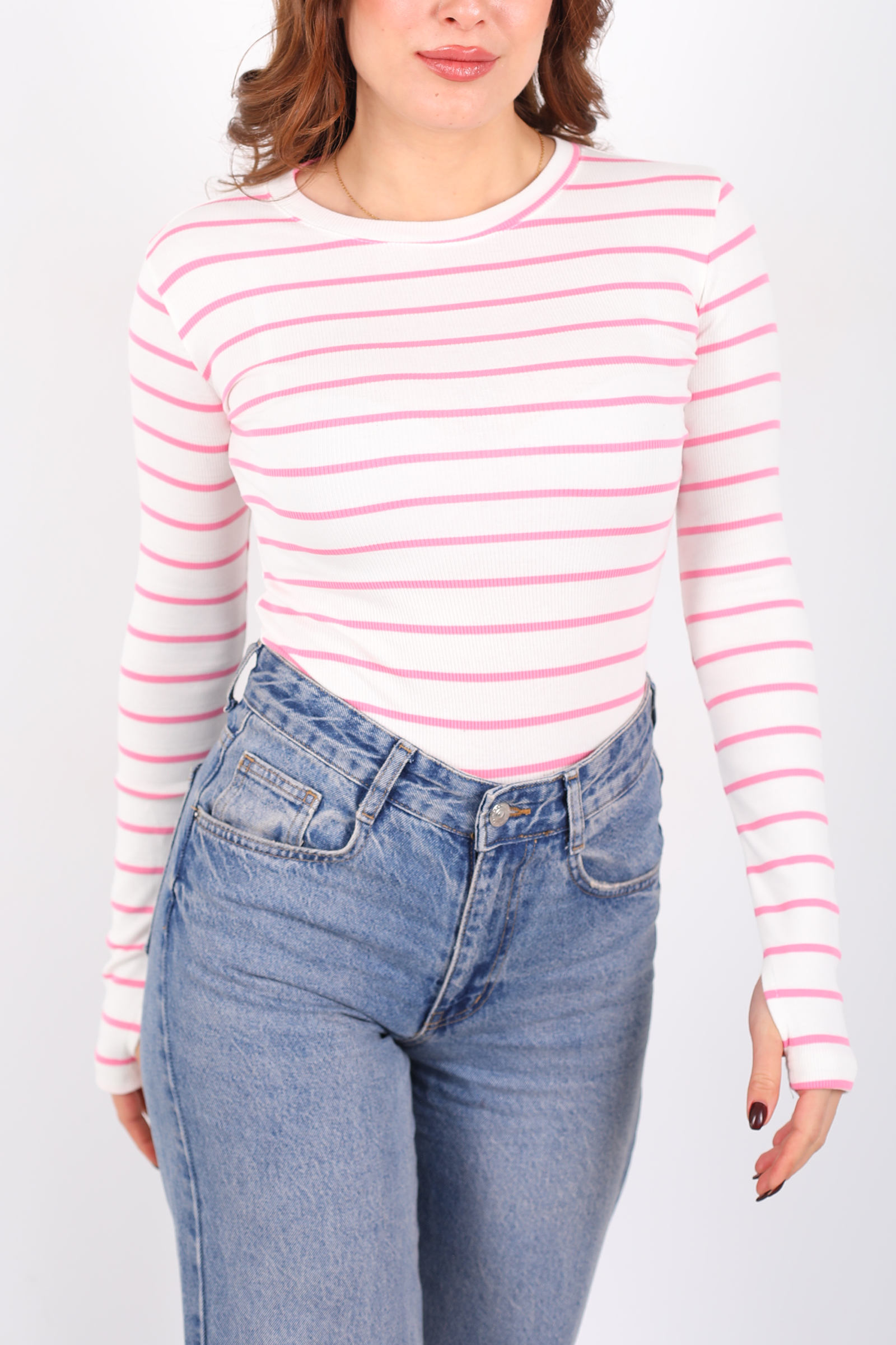 Bisiklet Yaka Çizgili Pembe Kadın Parmak Geçirmeli Bluz