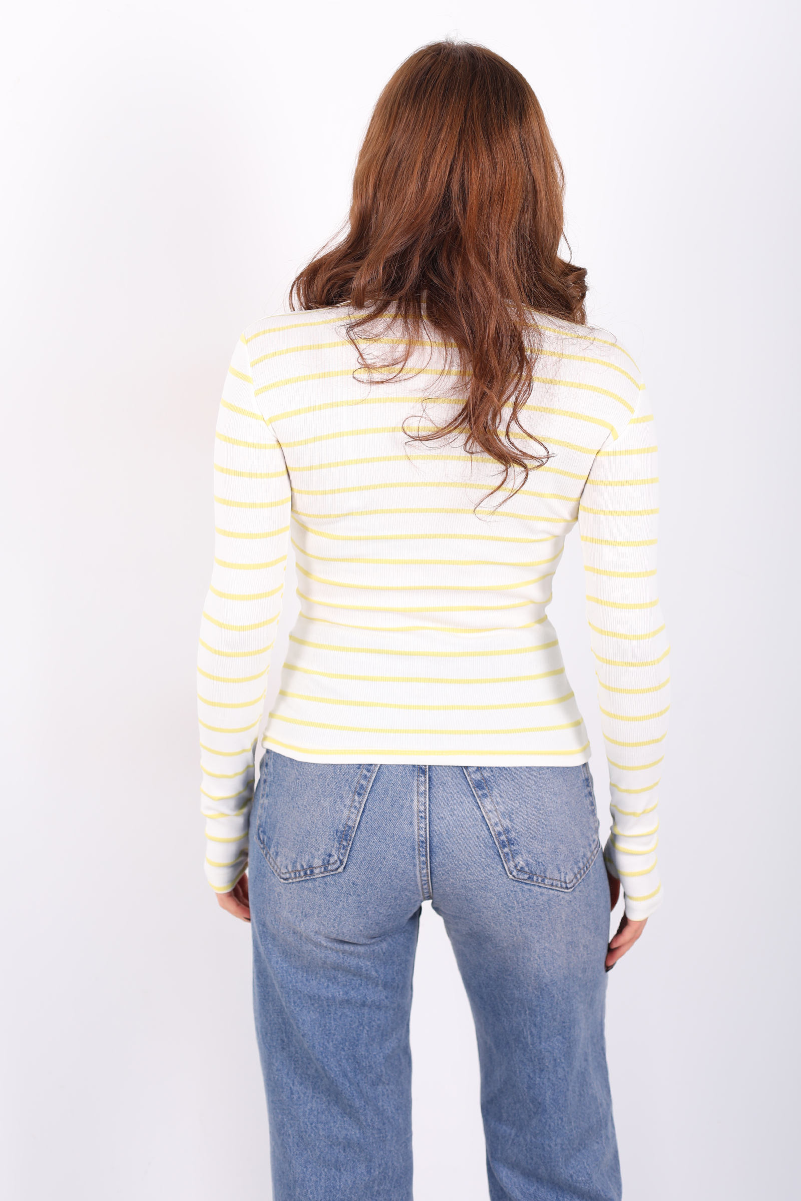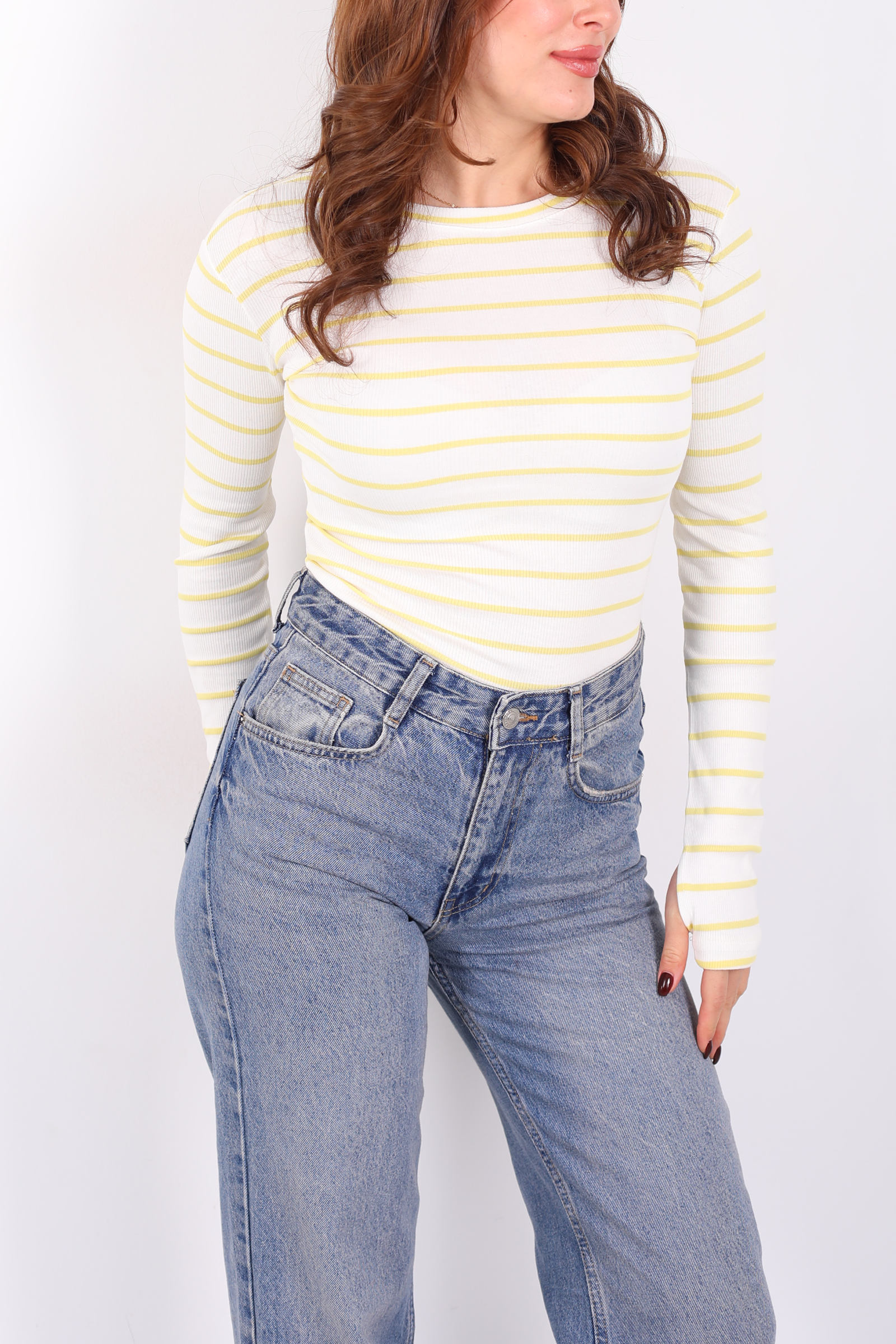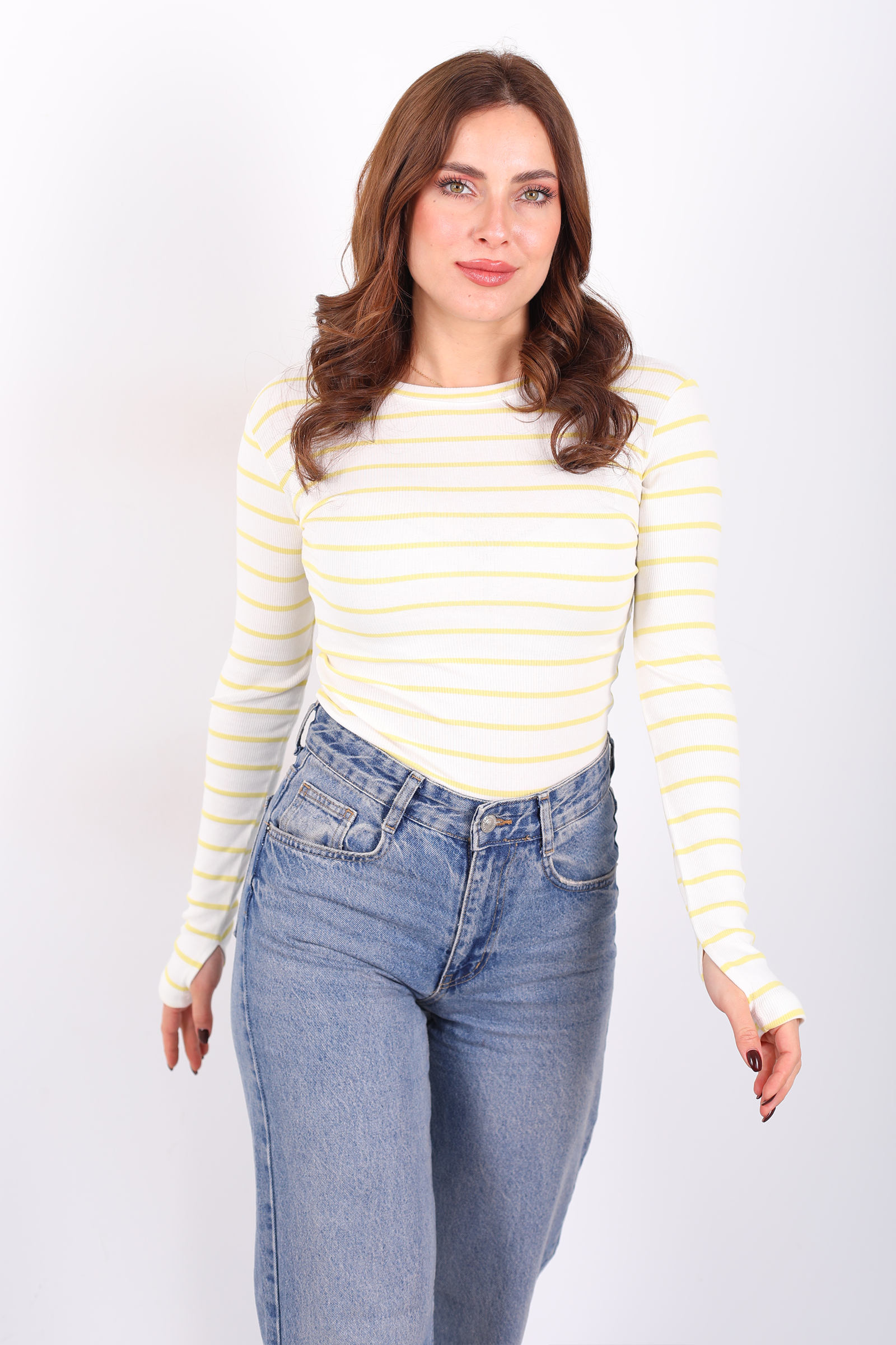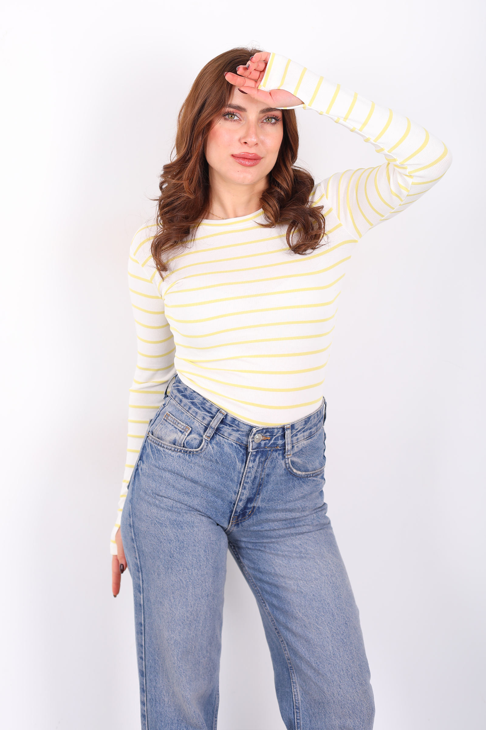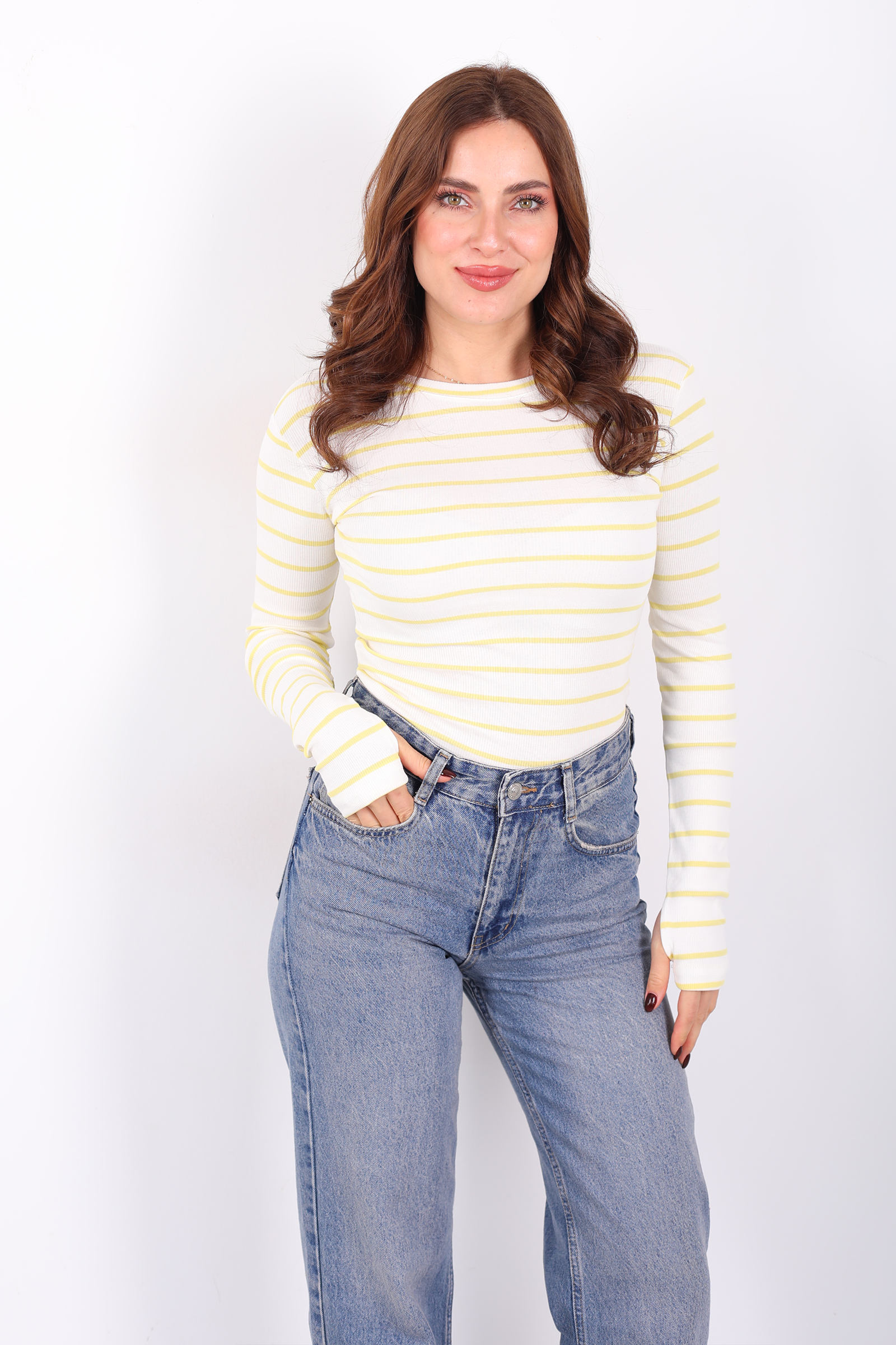 Bisiklet Yaka Çizgili Sarı Kadın Parmak Geçirmeli Bluz
