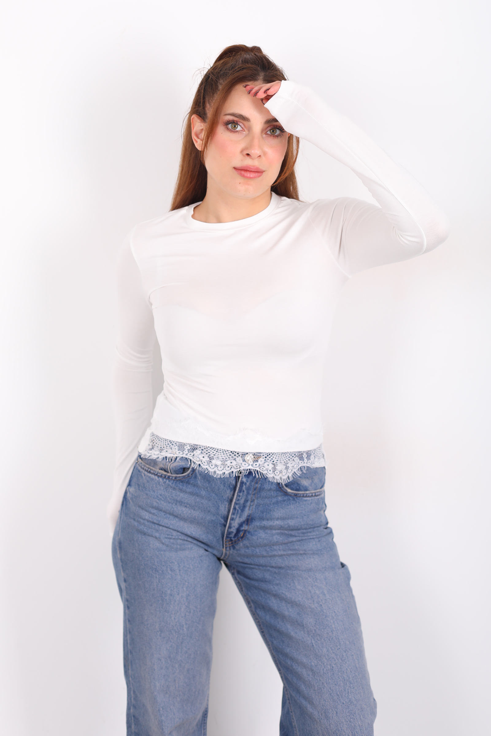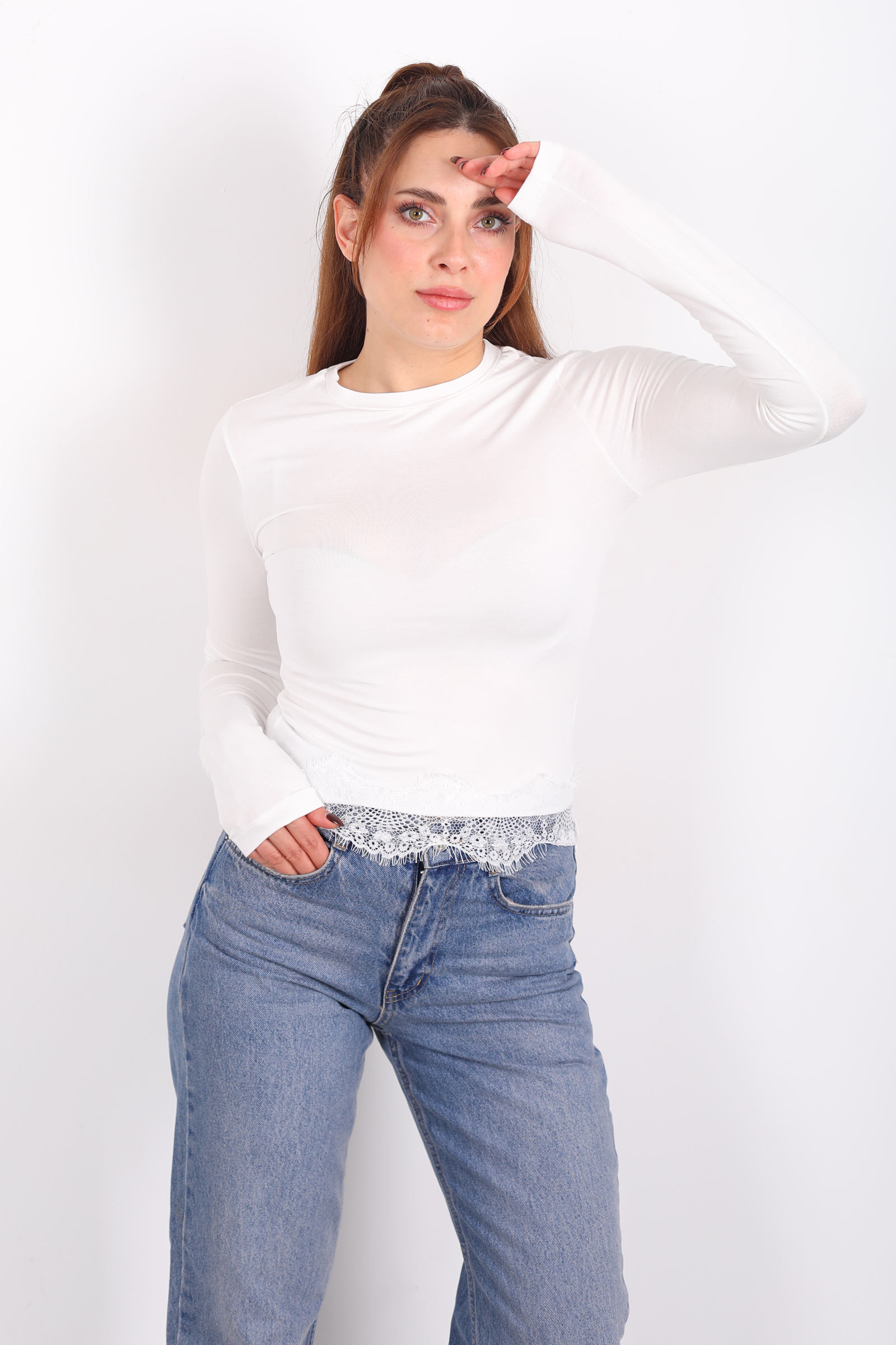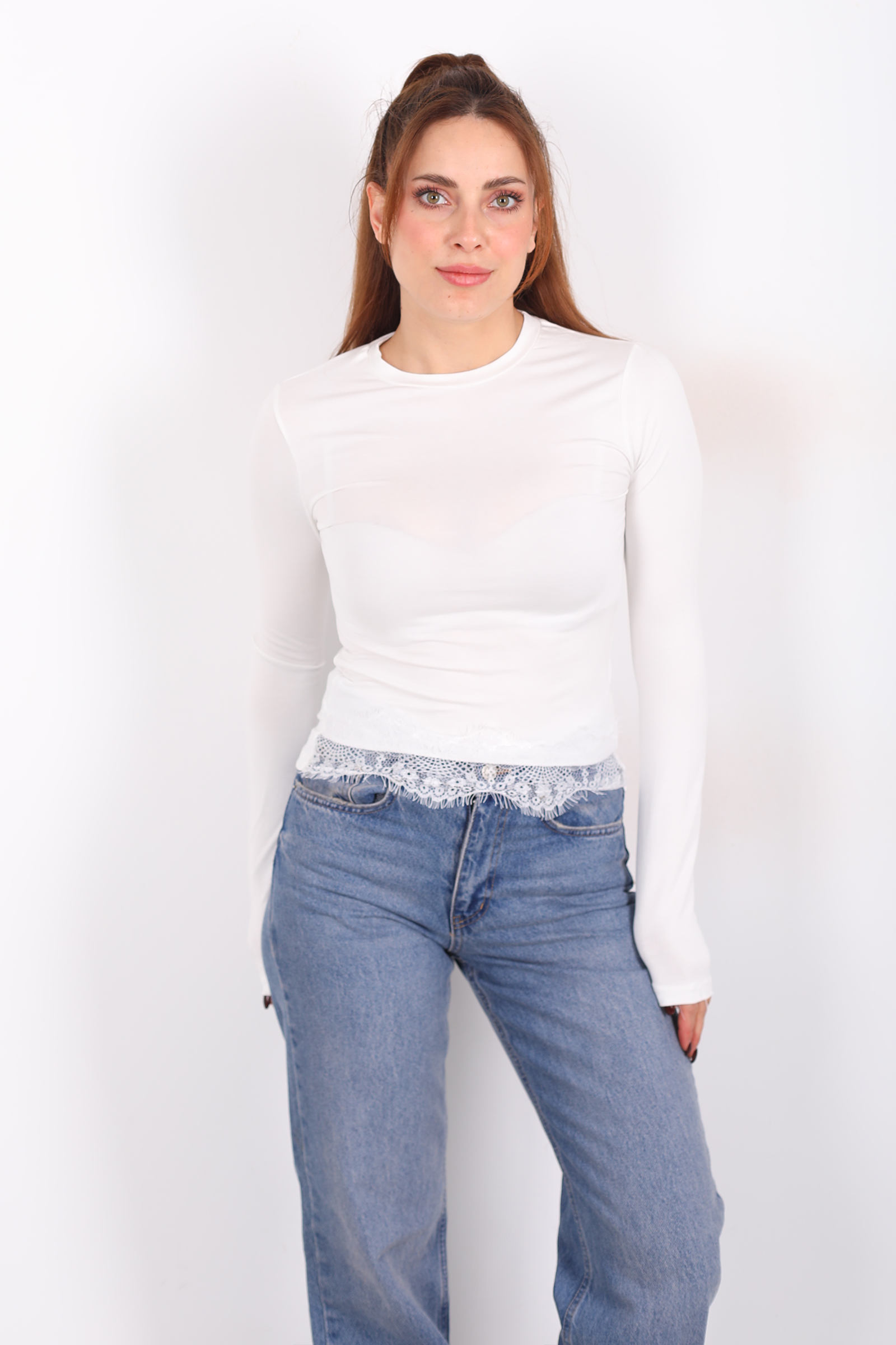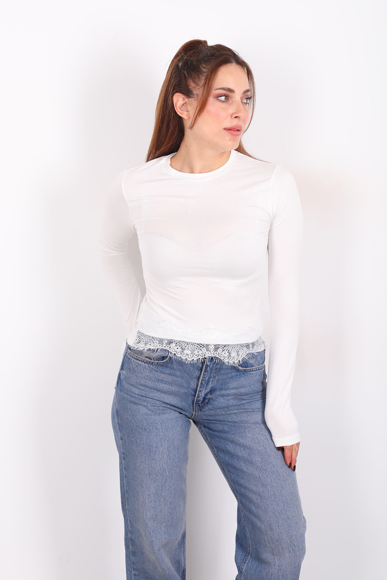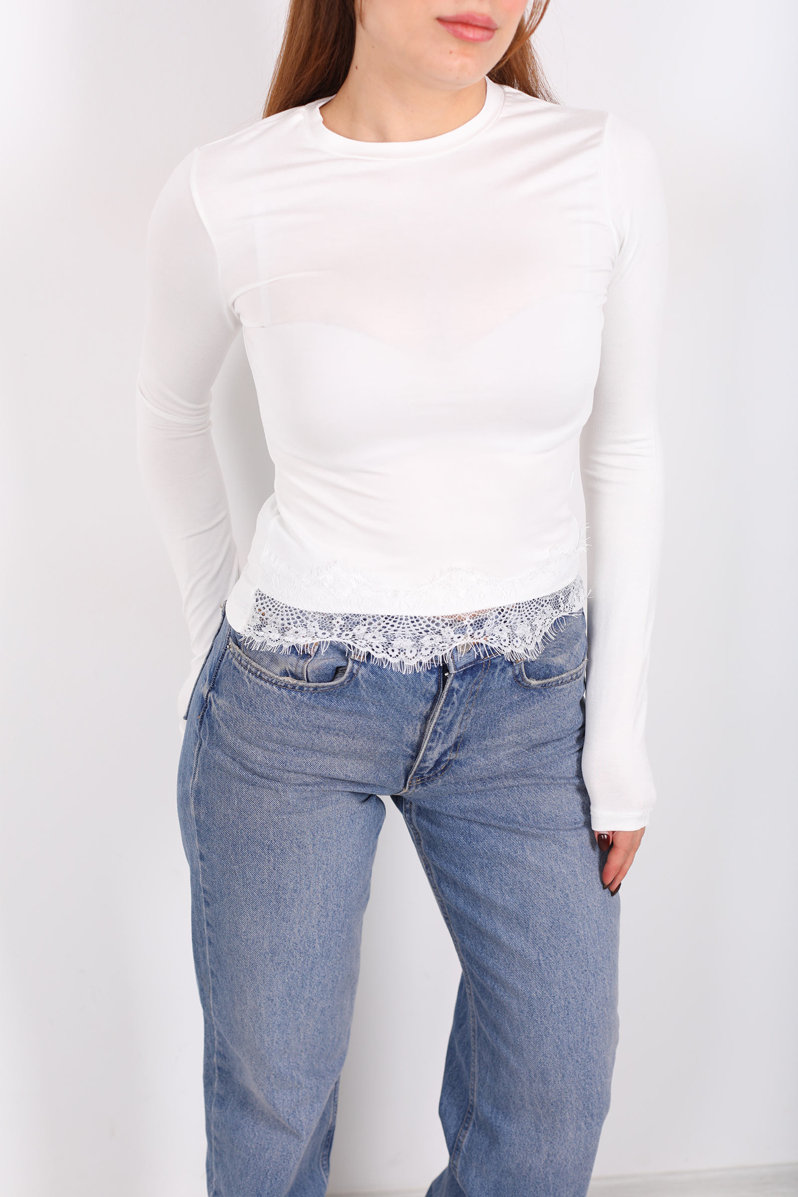 Beyazın nötr parlaklığı, doğallığı vurgularken diğer parçalarla kombinlendiğinde anında ferah ve taze bir duruş sağlar. Bu bluzu jean pantolonla gündelik bir sokak stiline taşıyabilir, kumaş etek veya pantolonla modern bir akşam kombini oluşturabilirsin. Dantel detayları, minimal çizgiyi zarif bir dokunuşla süsler ve bu basit bluzu gardırobunun özel anlatımlı bir parçasına dönüştürür.