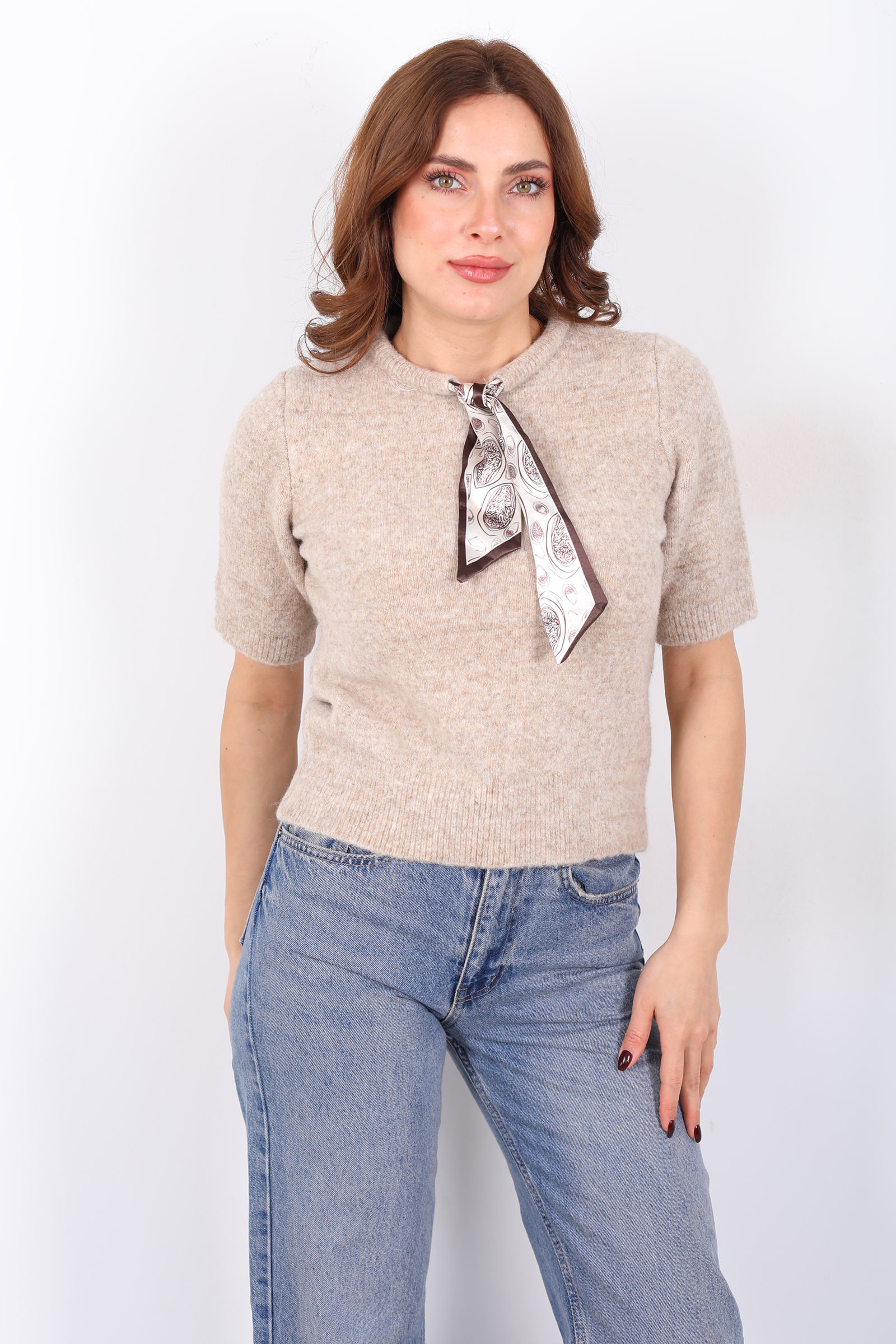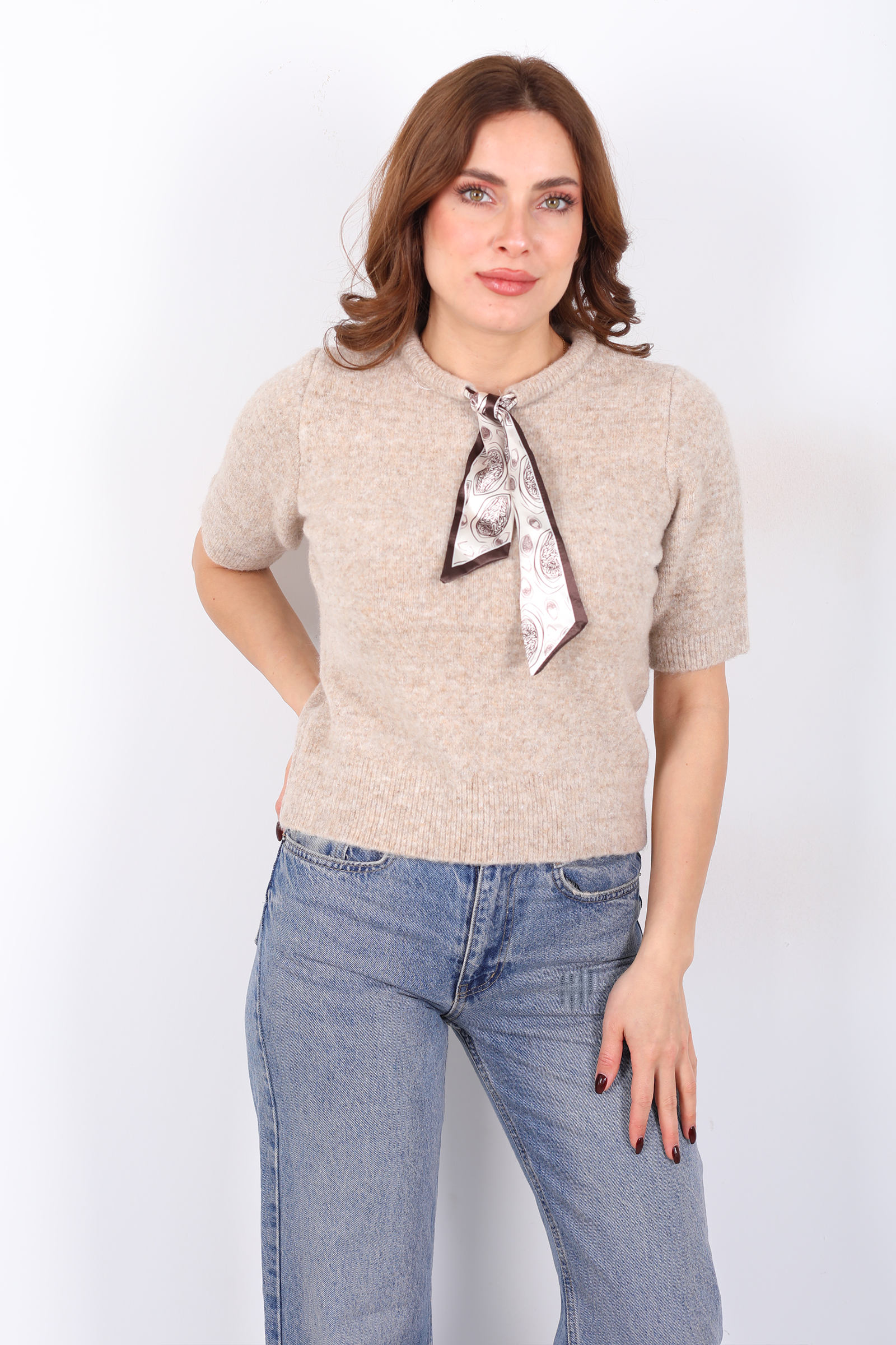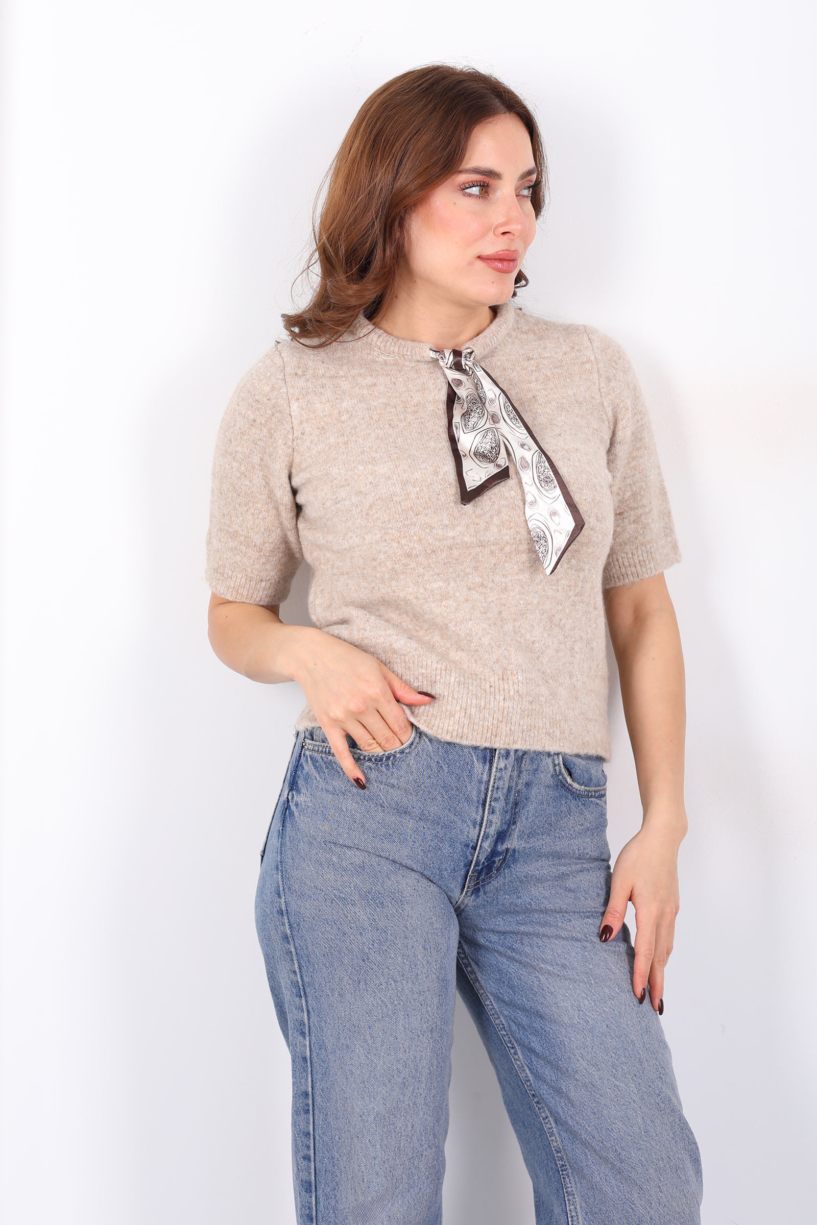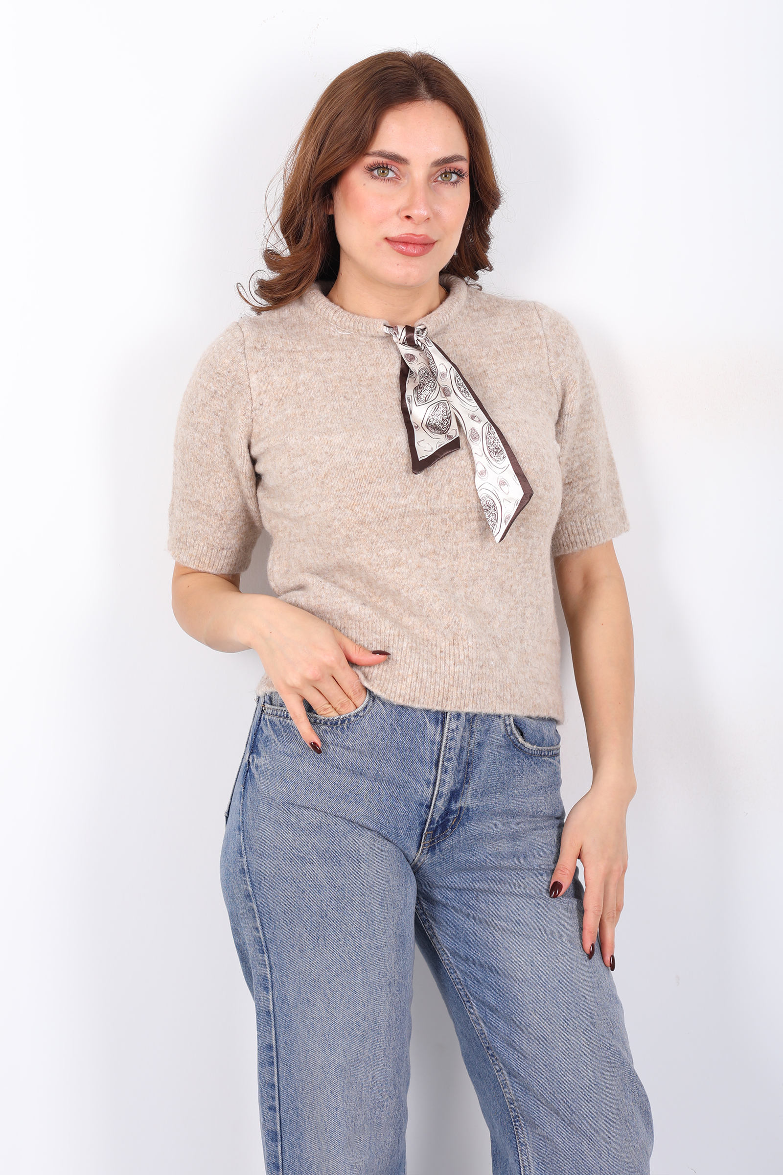 Bisiklet Yaka Fular Detaylı Kısa Kol Taş Rengi Kadın Triko Kazak