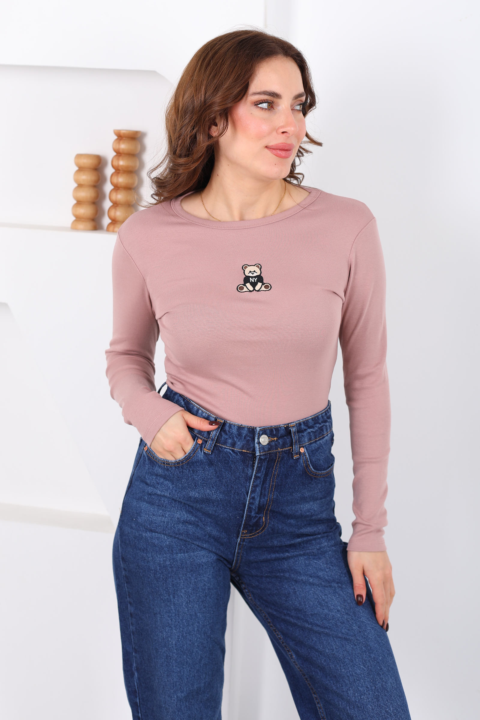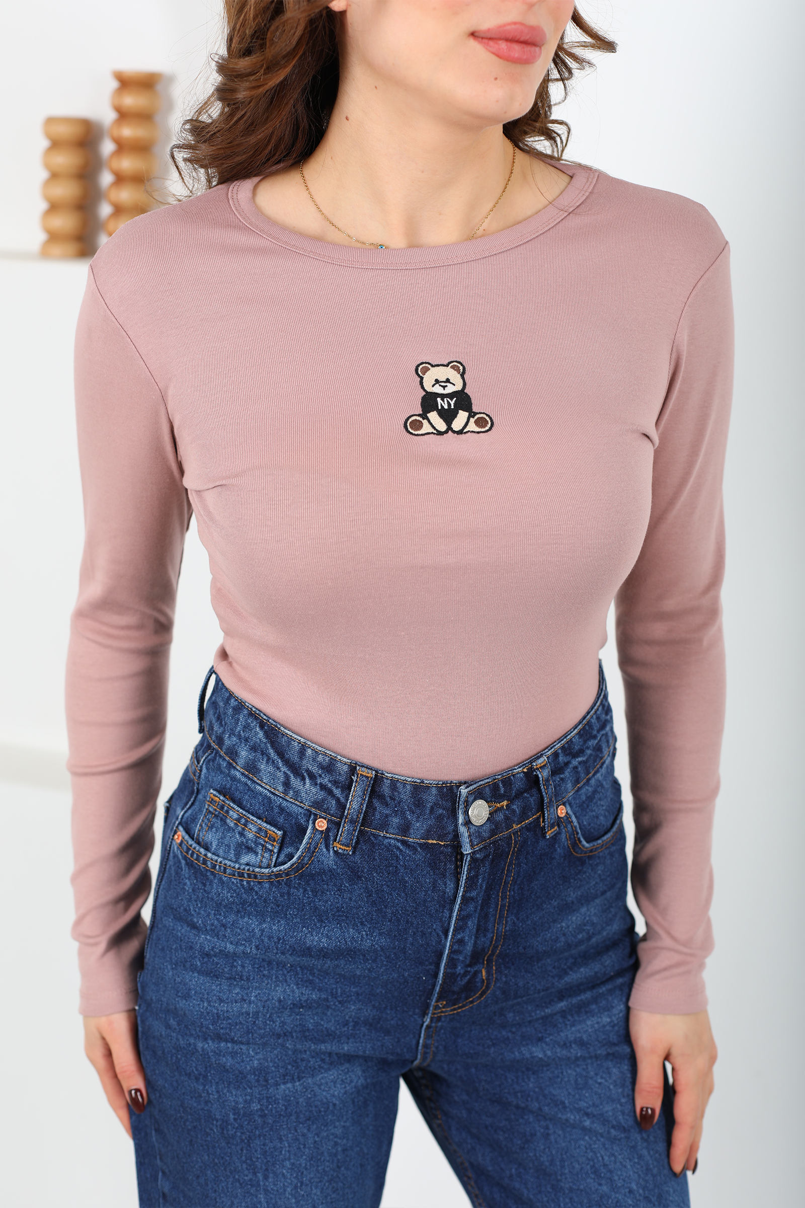 Bisiklet Yaka Gül Kurusu Kadın Ayıcık Nakışlı Body