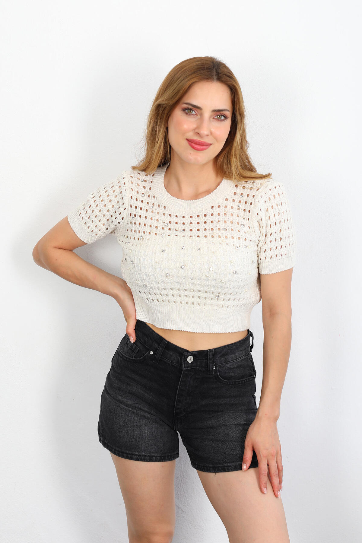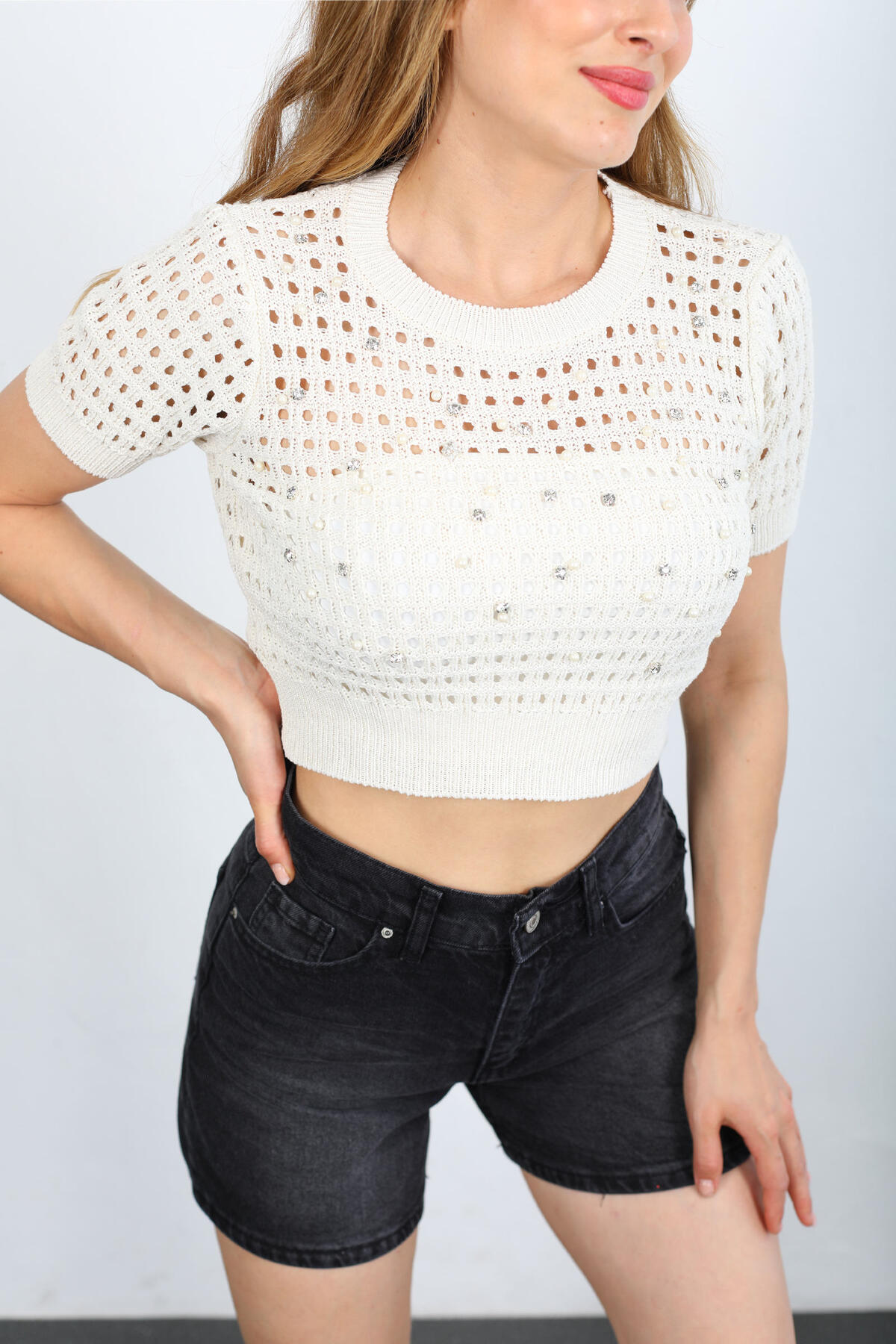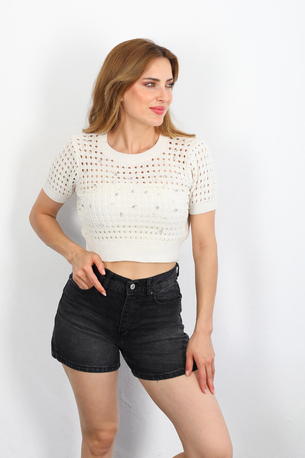 Şıklığı ve zarafeti bir arada sunan taş rengi triko crop, bisiklet yaka tasarımı ve inci taş detaylarıyla dikkat çekiyor. İnce işçiliği ve yumuşak dokusuyla konforlu bir kullanım sağlayan bu parça, günlük kombinlerinize feminen ve modern bir dokunuş katıyor. Crop kesimi sayesinde farklı alt giyimlerle rahatlıkla kombinlenebilen bu triko, mevsim geçişlerinde gardırobunuzun vazgeçilmez parçalarından biri olacak. İnci taş süslemeleri, sade tasarıma zarif bir hareket katarak stilinizi bir üst seviyeye taşıyor. Hem casual hem de daha şık kombinlerde kullanabileceğiniz bu ürün, kaliteli ve özgün tasarımıyla fark yaratmak isteyenler için ideal.