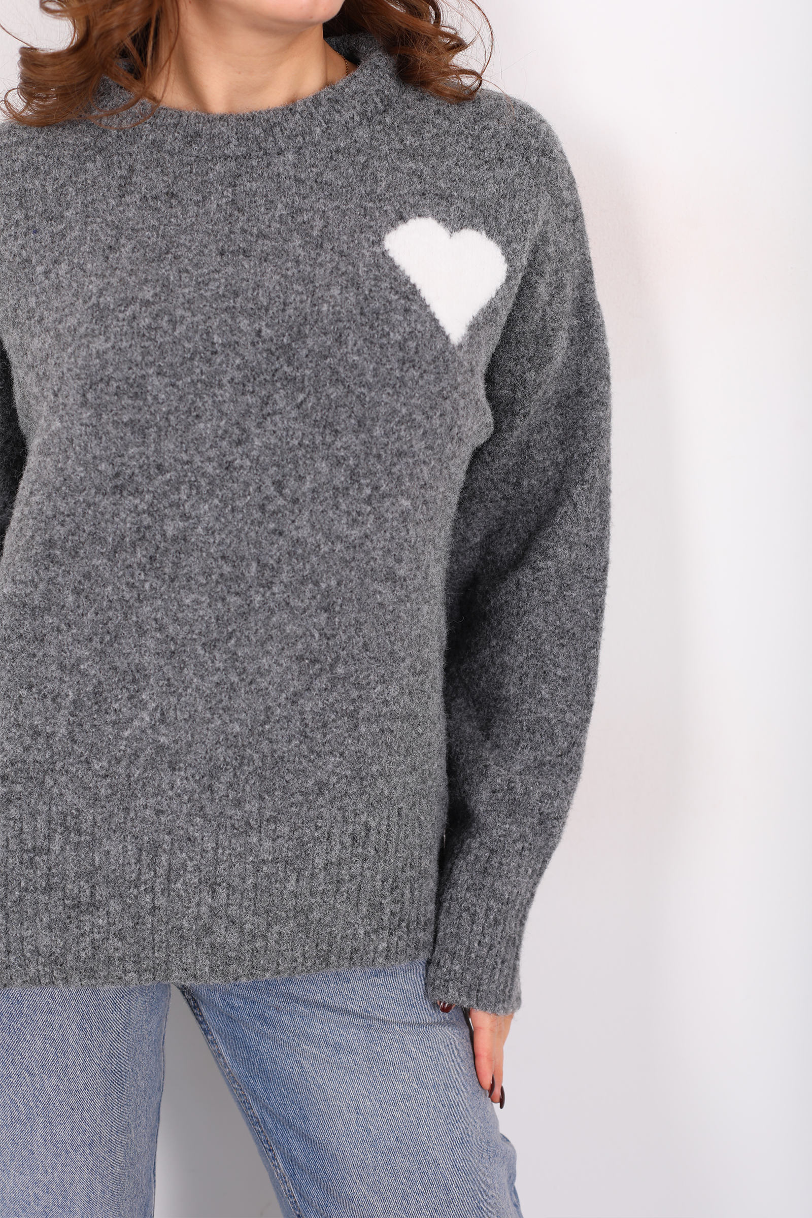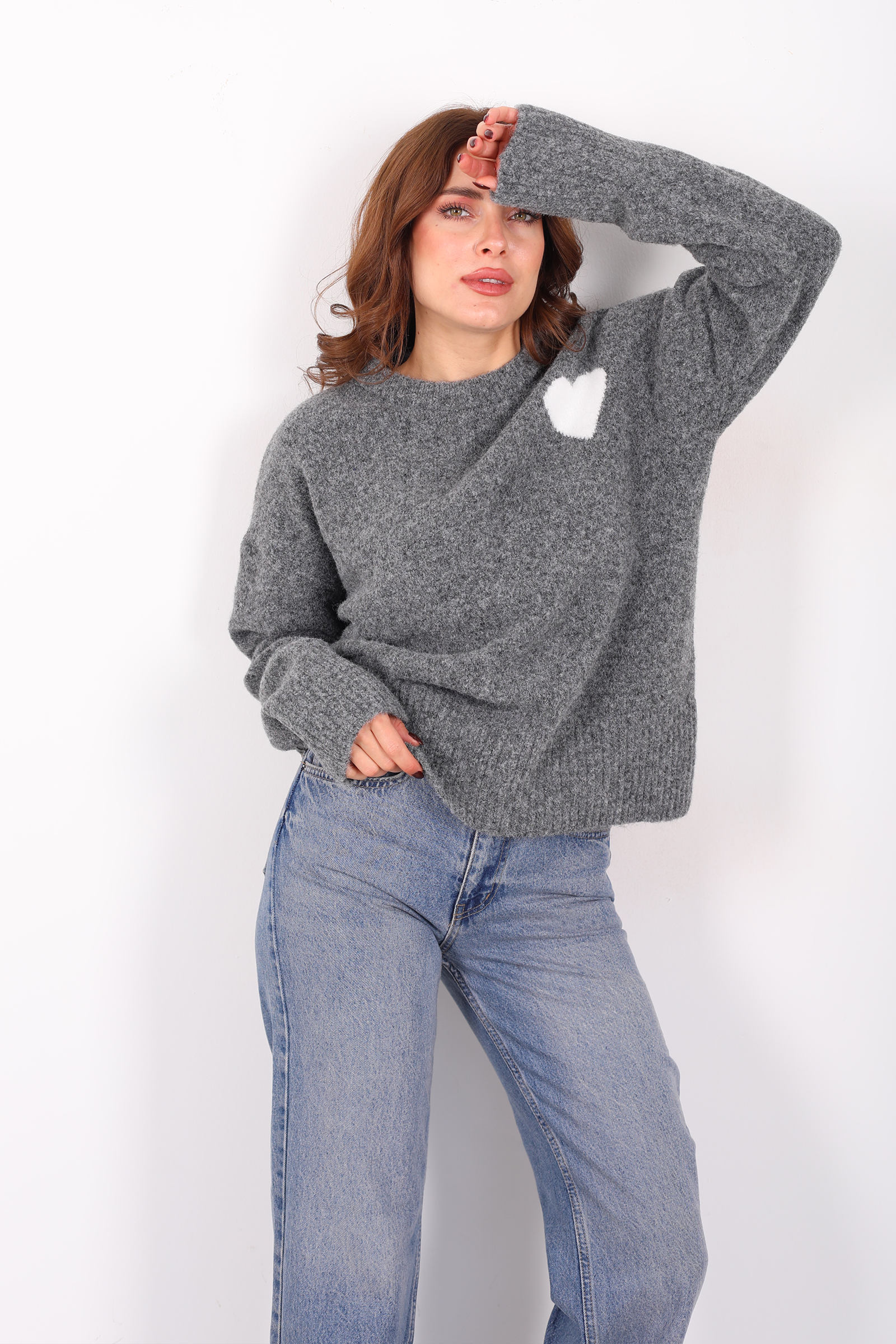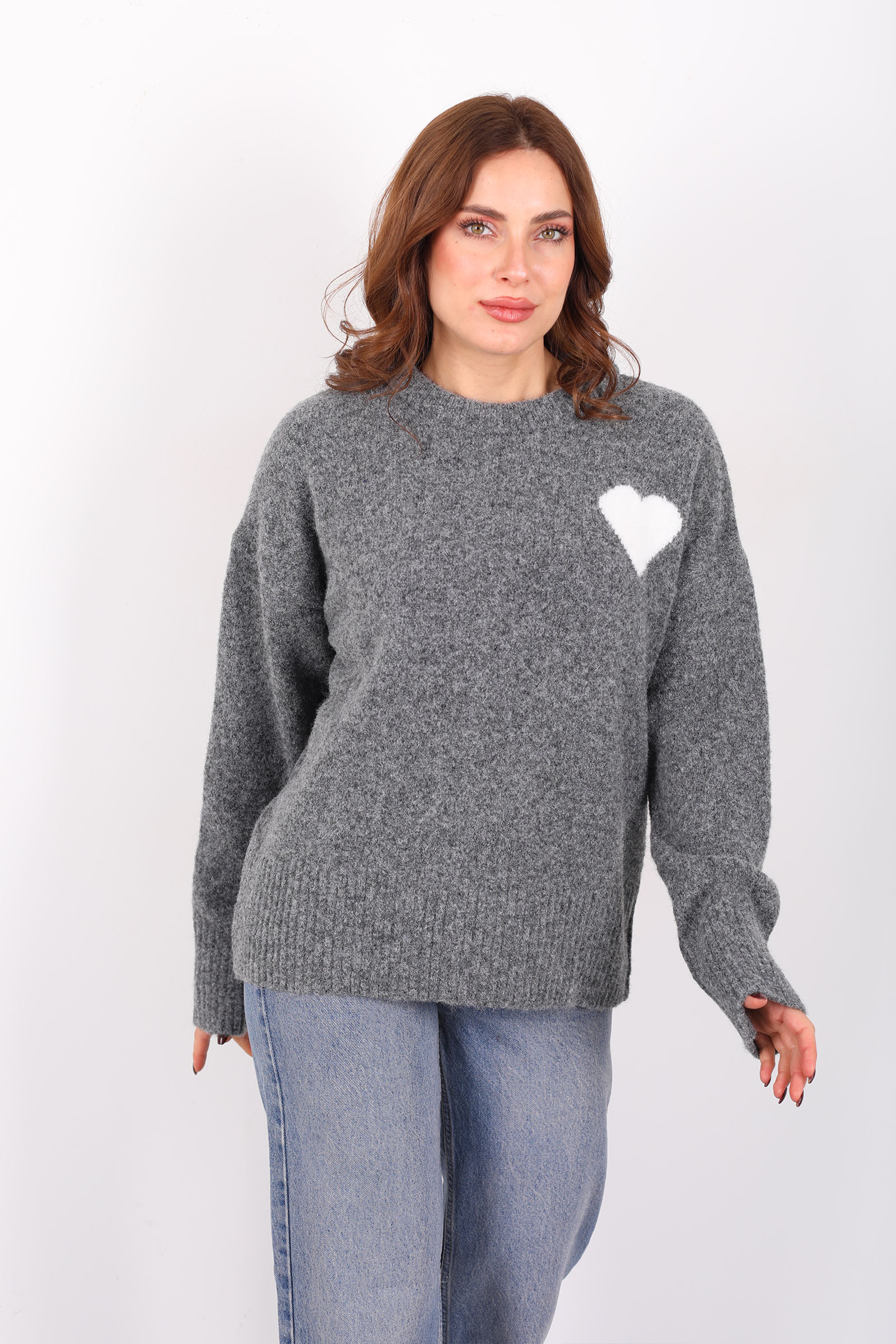 Bisiklet Yaka Kalp Detaylı Füme Kadın Triko Kazak