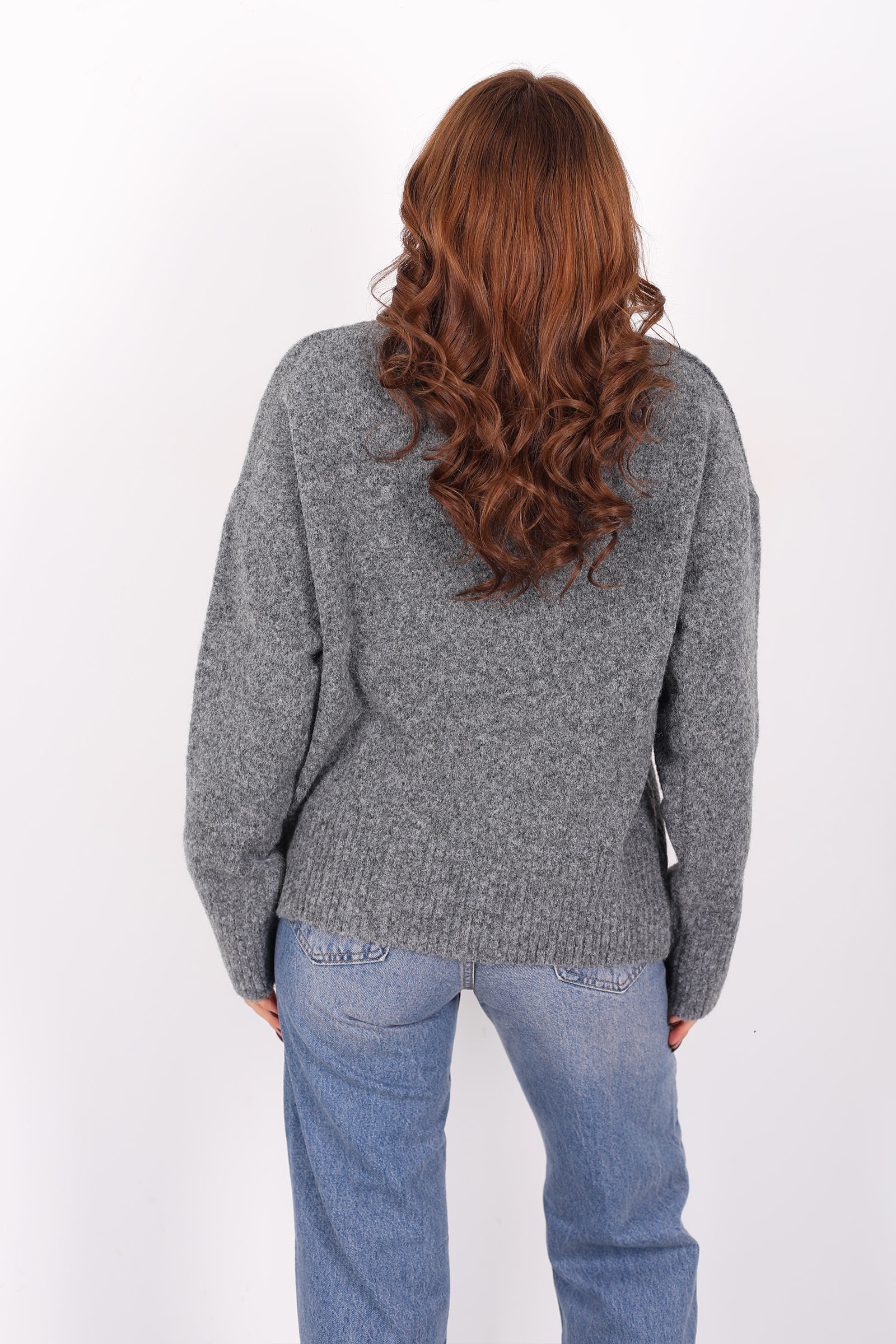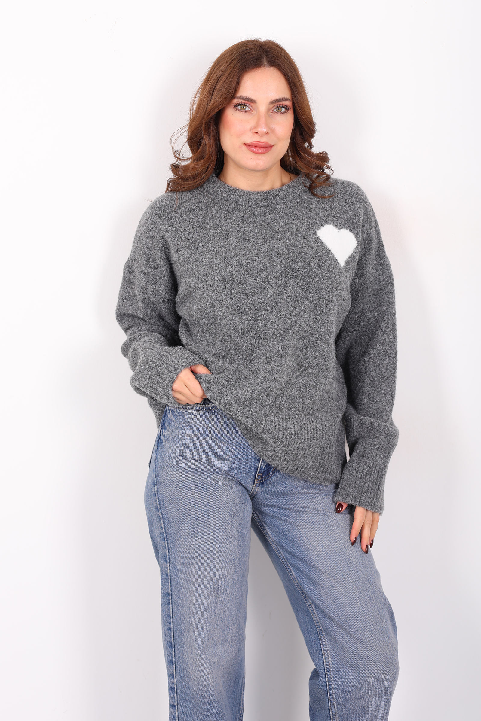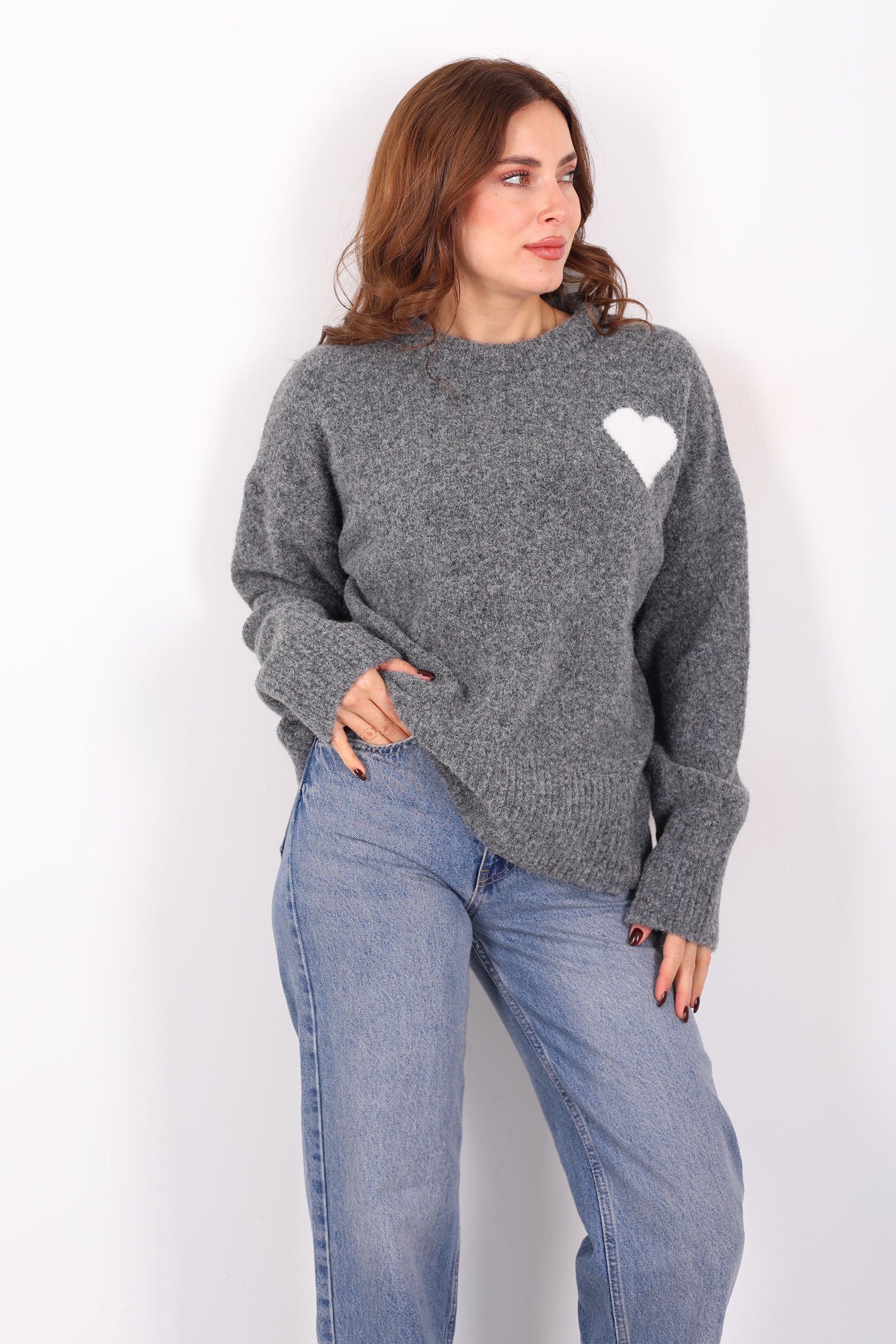 Bisiklet Yaka Kalp Detaylı Füme Kadın Triko Kazak