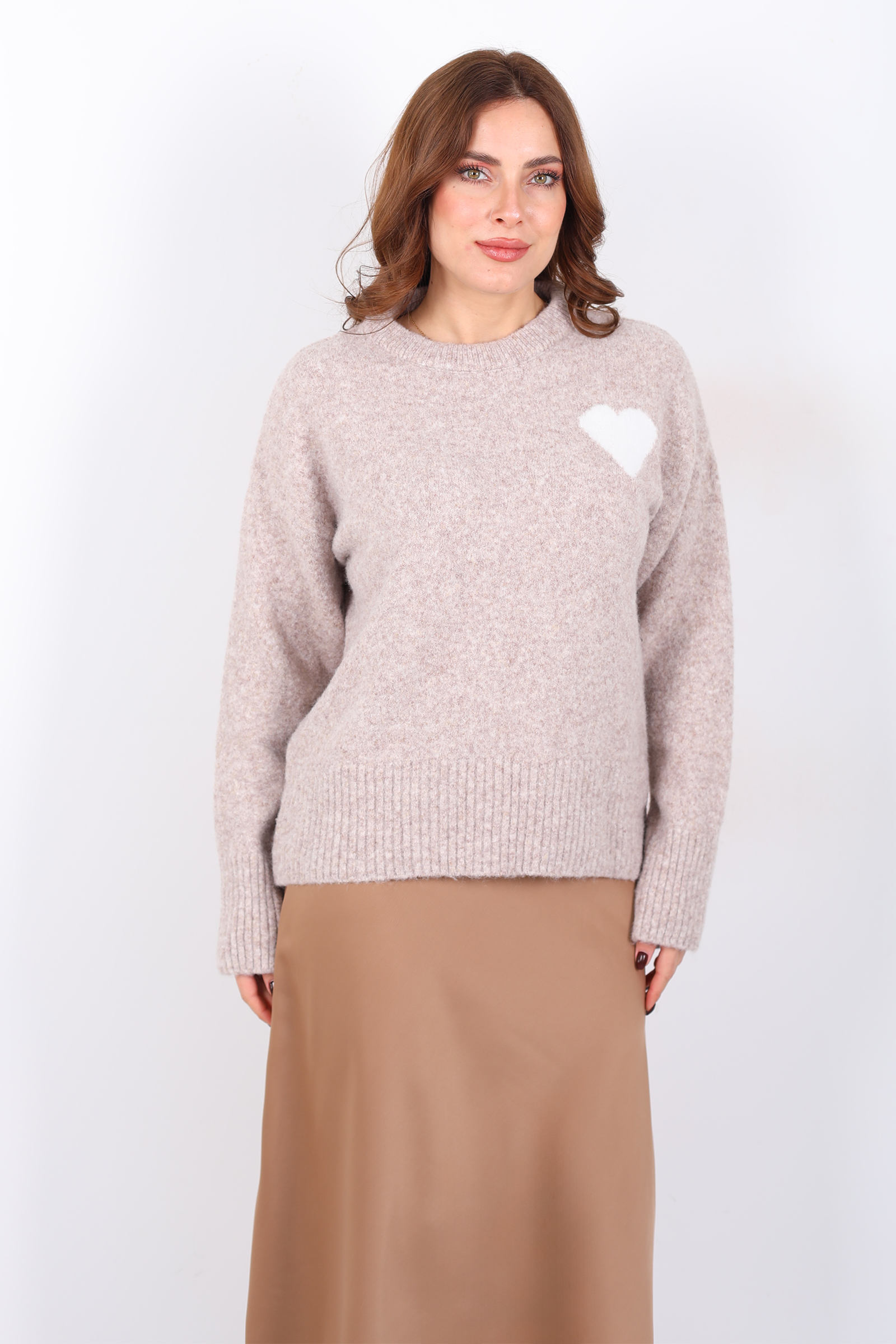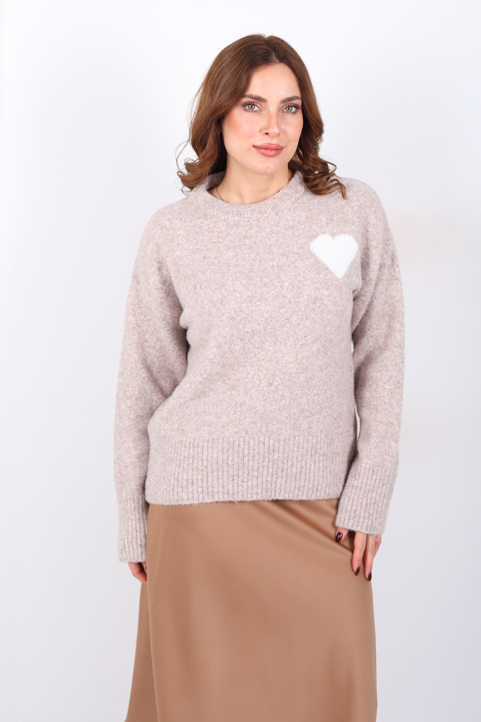 Bisiklet Yaka Kalp Detaylı Taş Rengi Kadın Triko Kazak