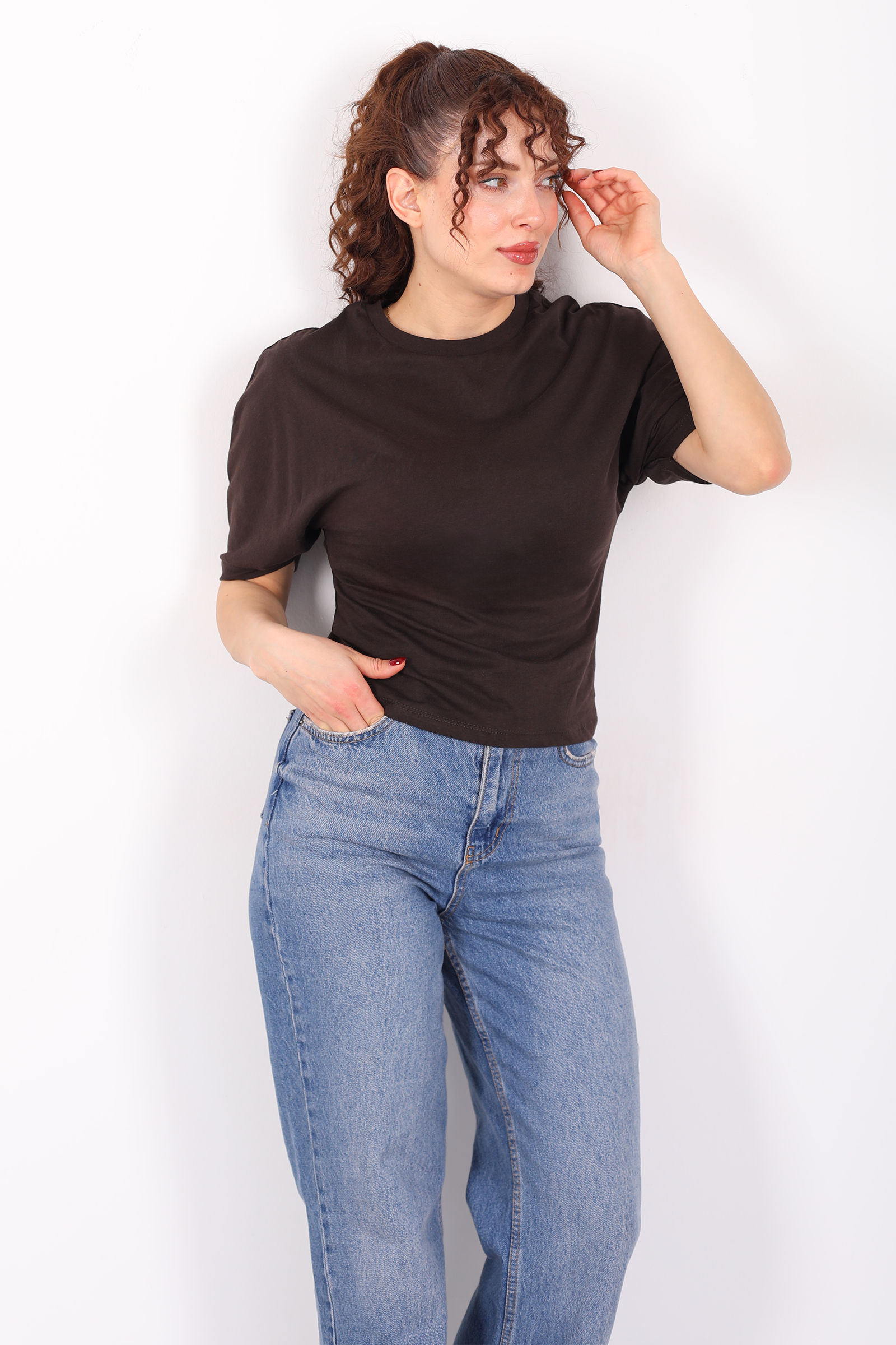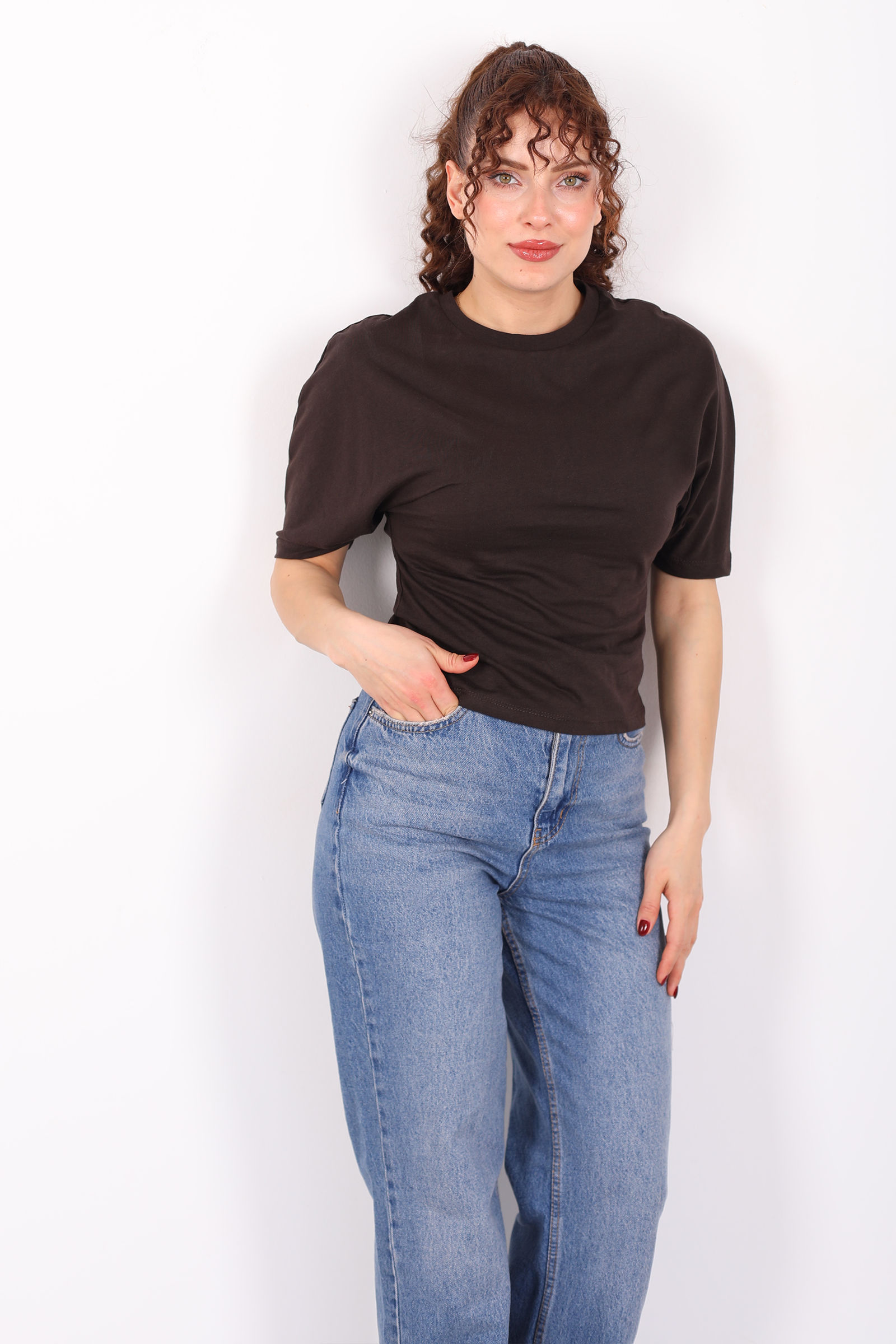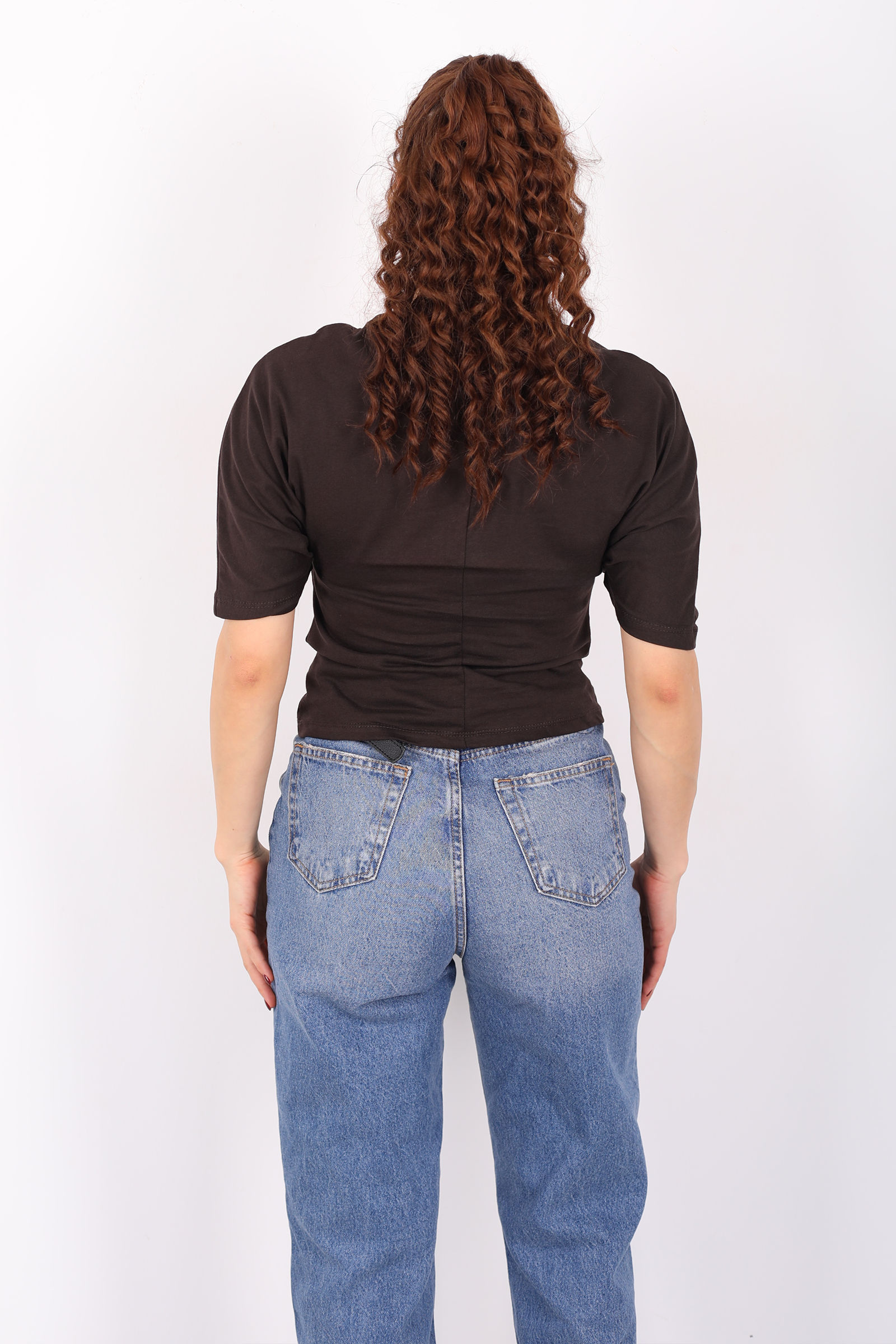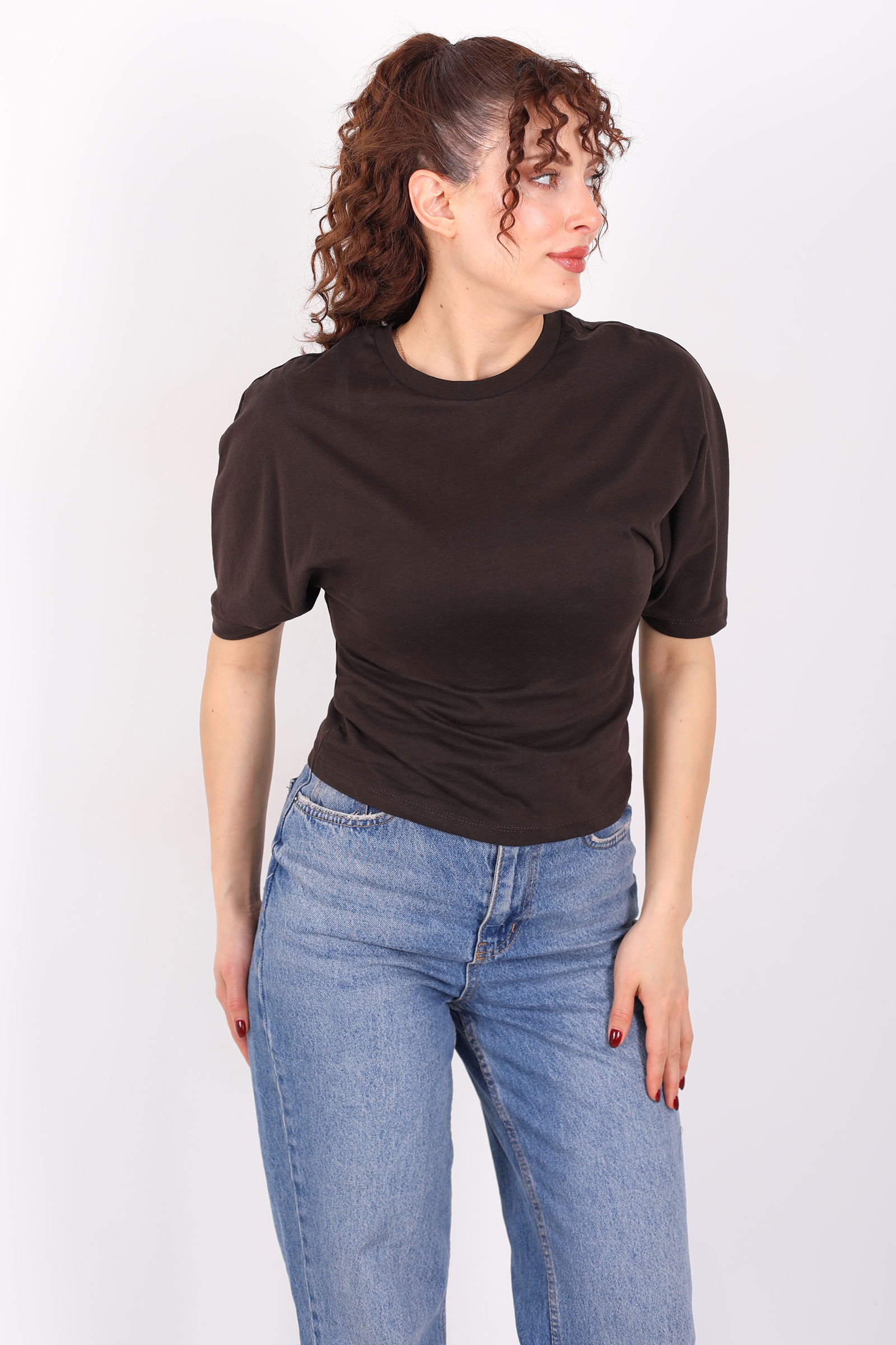 Bisiklet Yaka Kol Altı Drapeli Kısa Kol Kahverengi Kadın T-Shirt