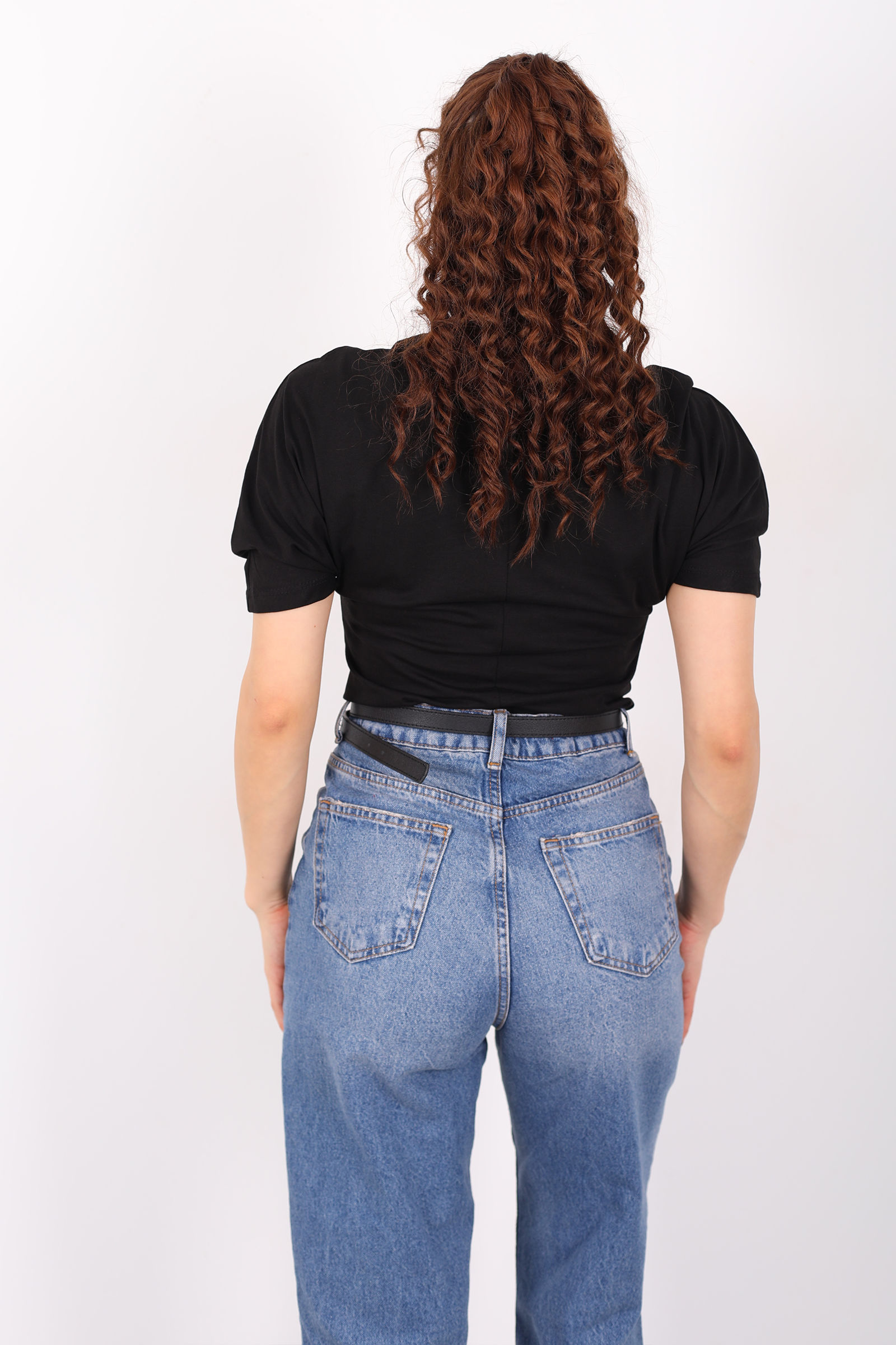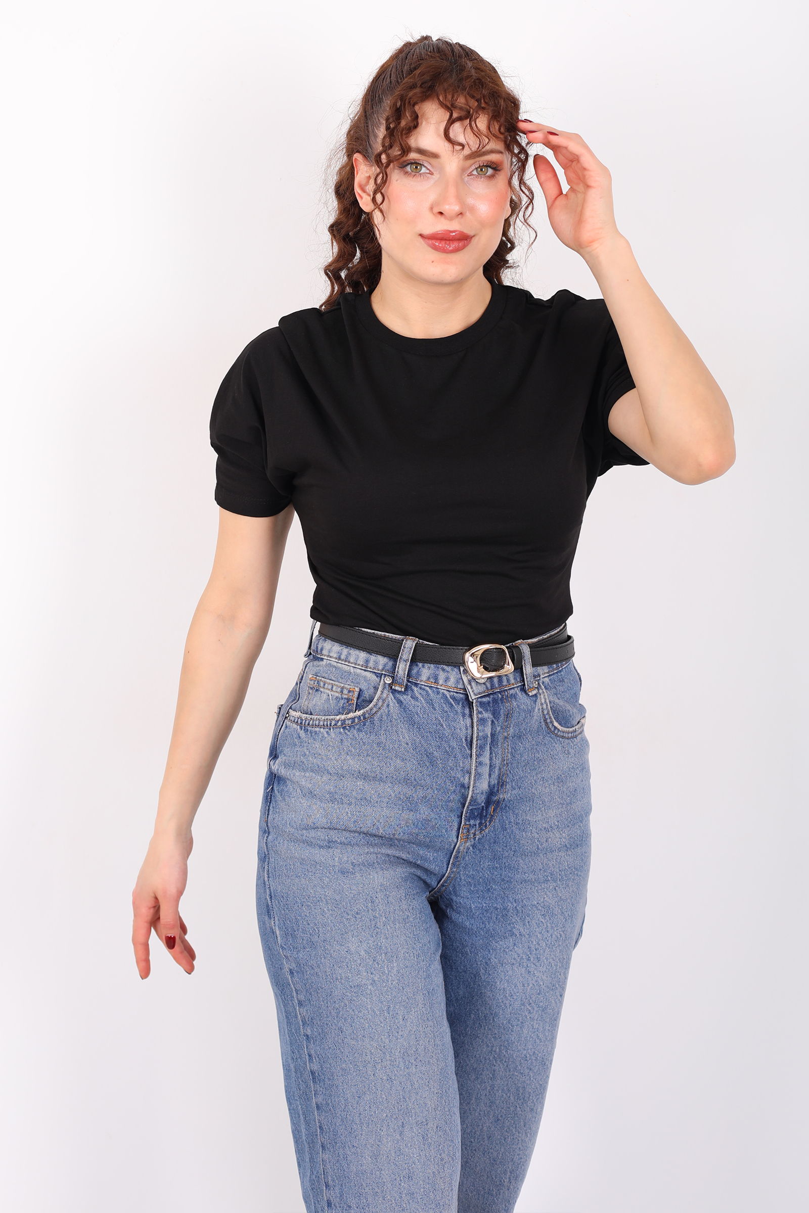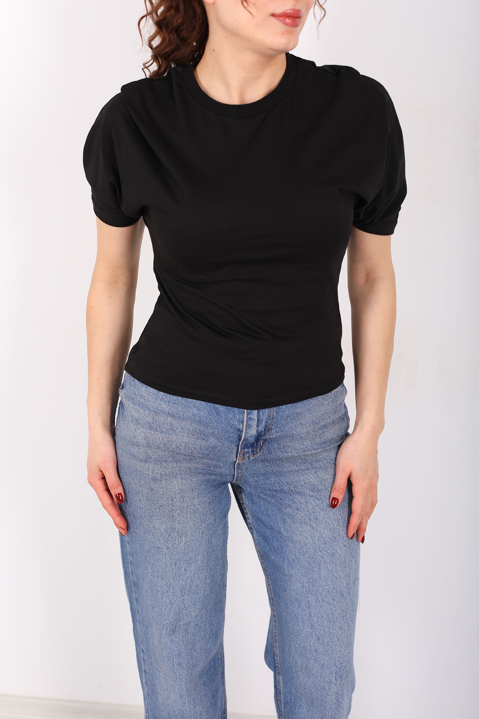 Bisiklet Yaka Kol Altı Drapeli Kısa Kol Siyah Kadın T-Shirt