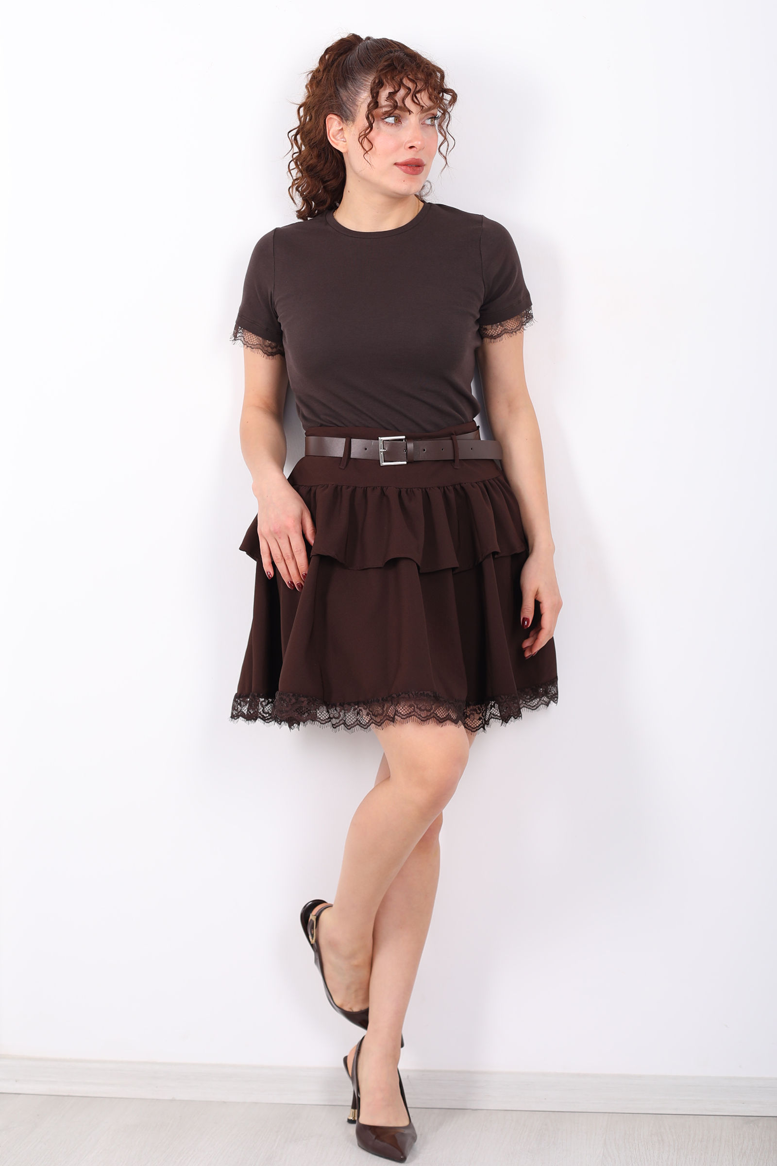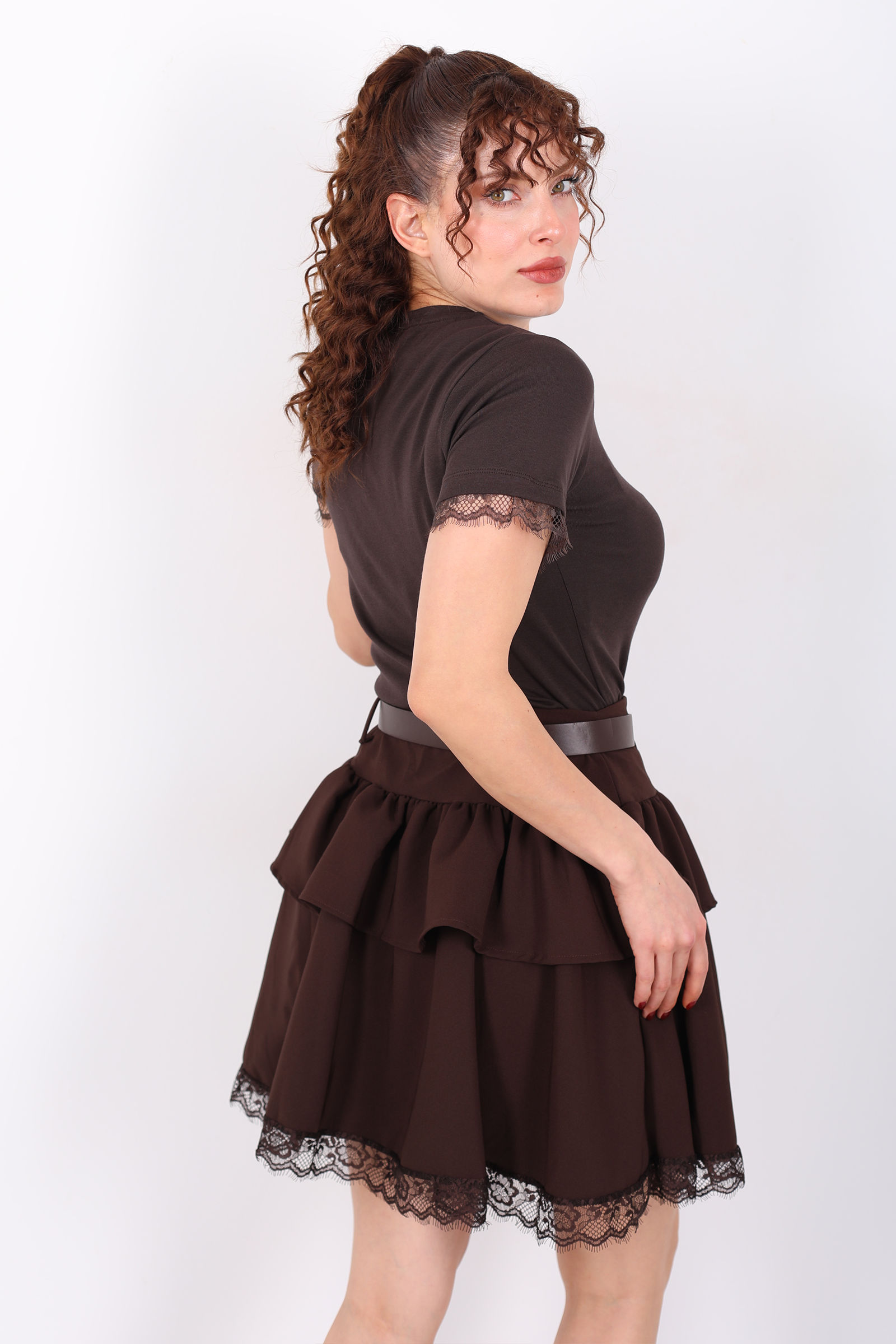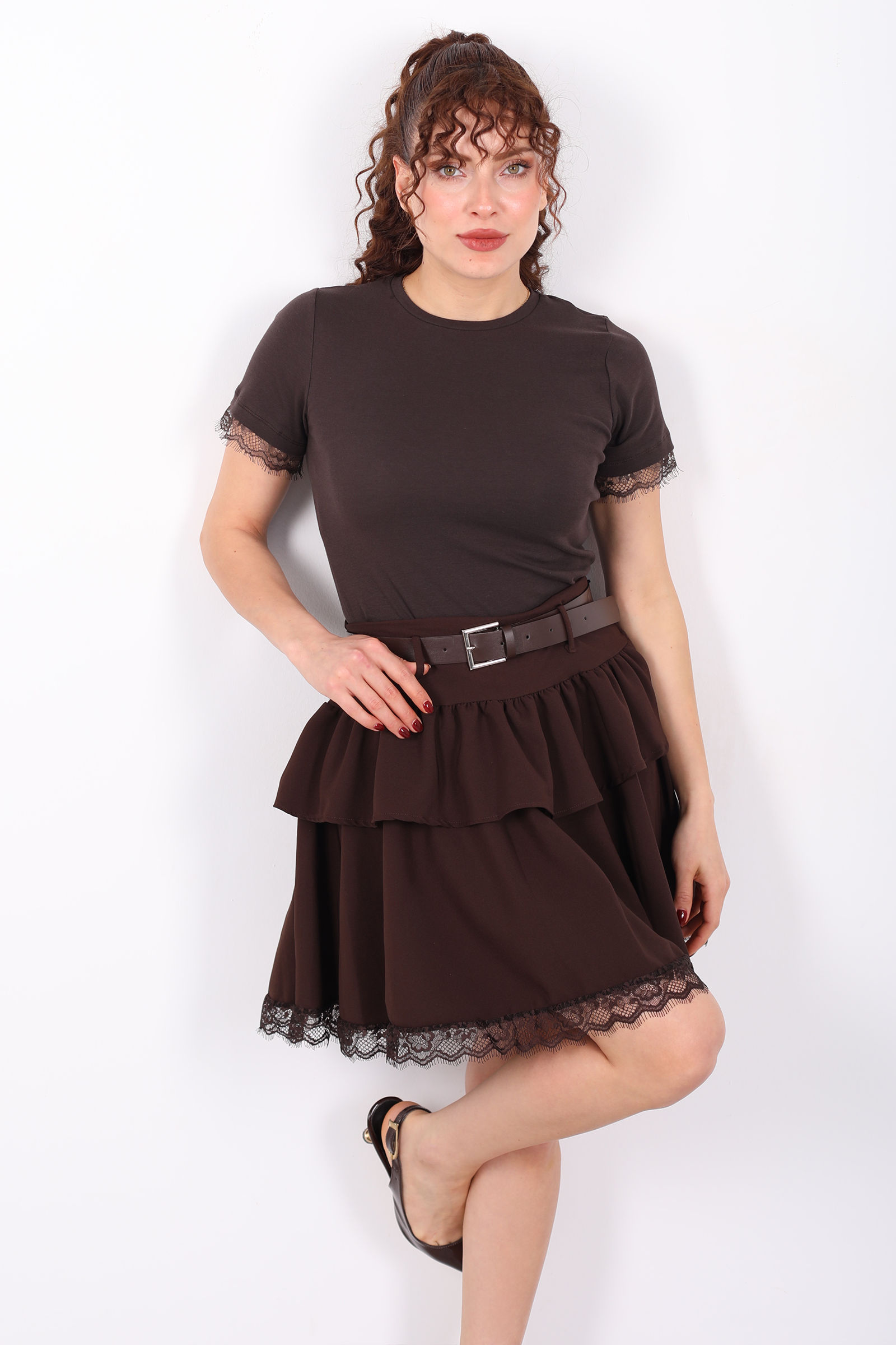 Bisiklet Yaka Kol Güpür Detaylı Kahverengi Kadın Basic T-Shirt