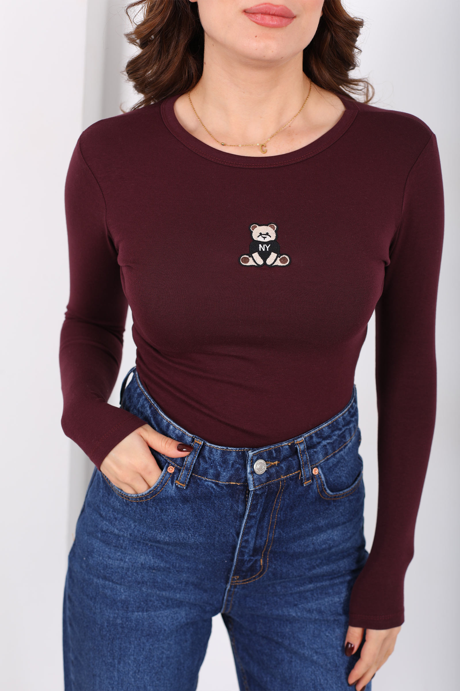 Bisiklet Yaka Mürdüm Kadın Ayıcık Nakışlı Body