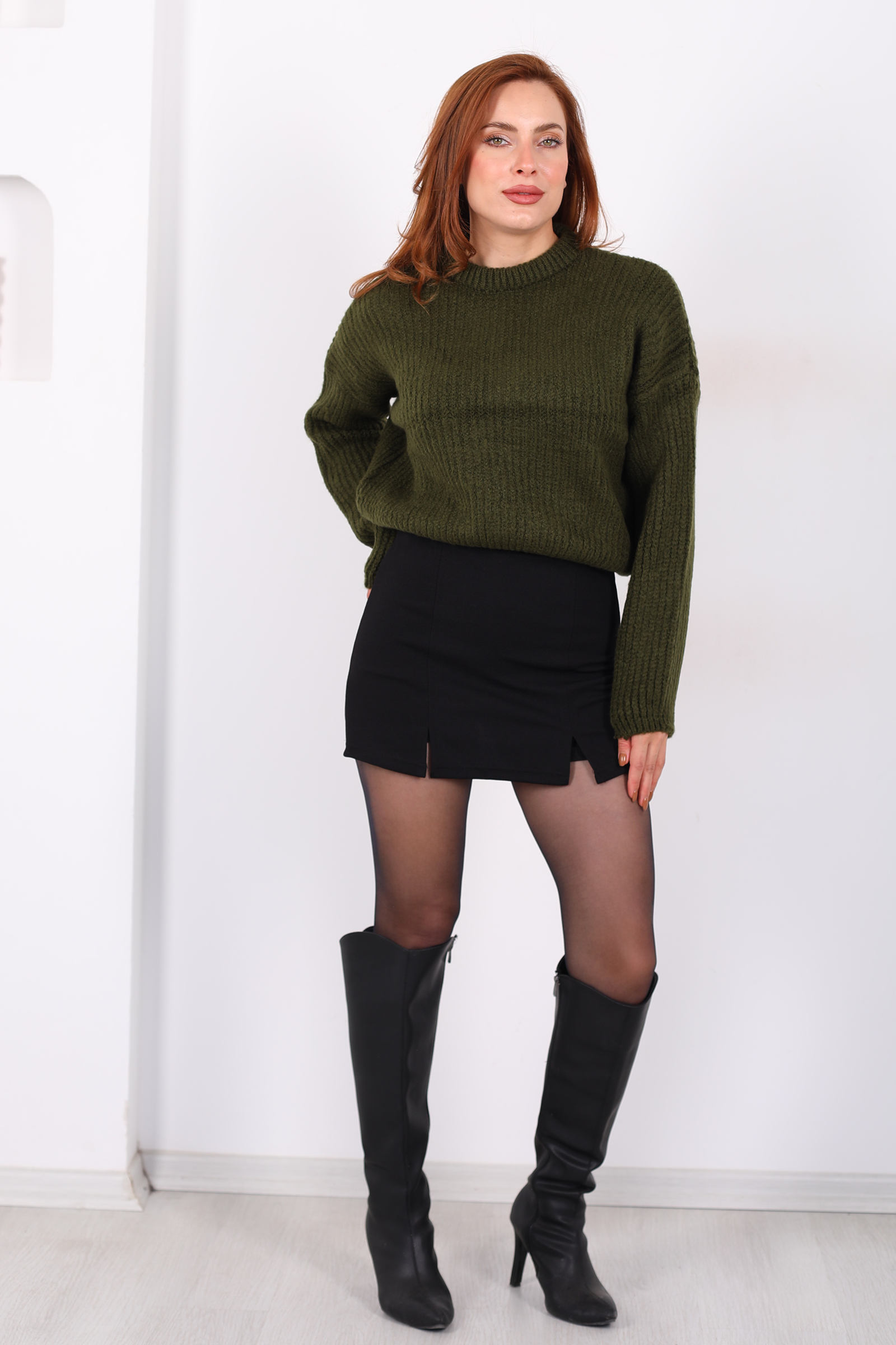 Bisiklet Yaka Oversize Haki Kadın Triko Crop
