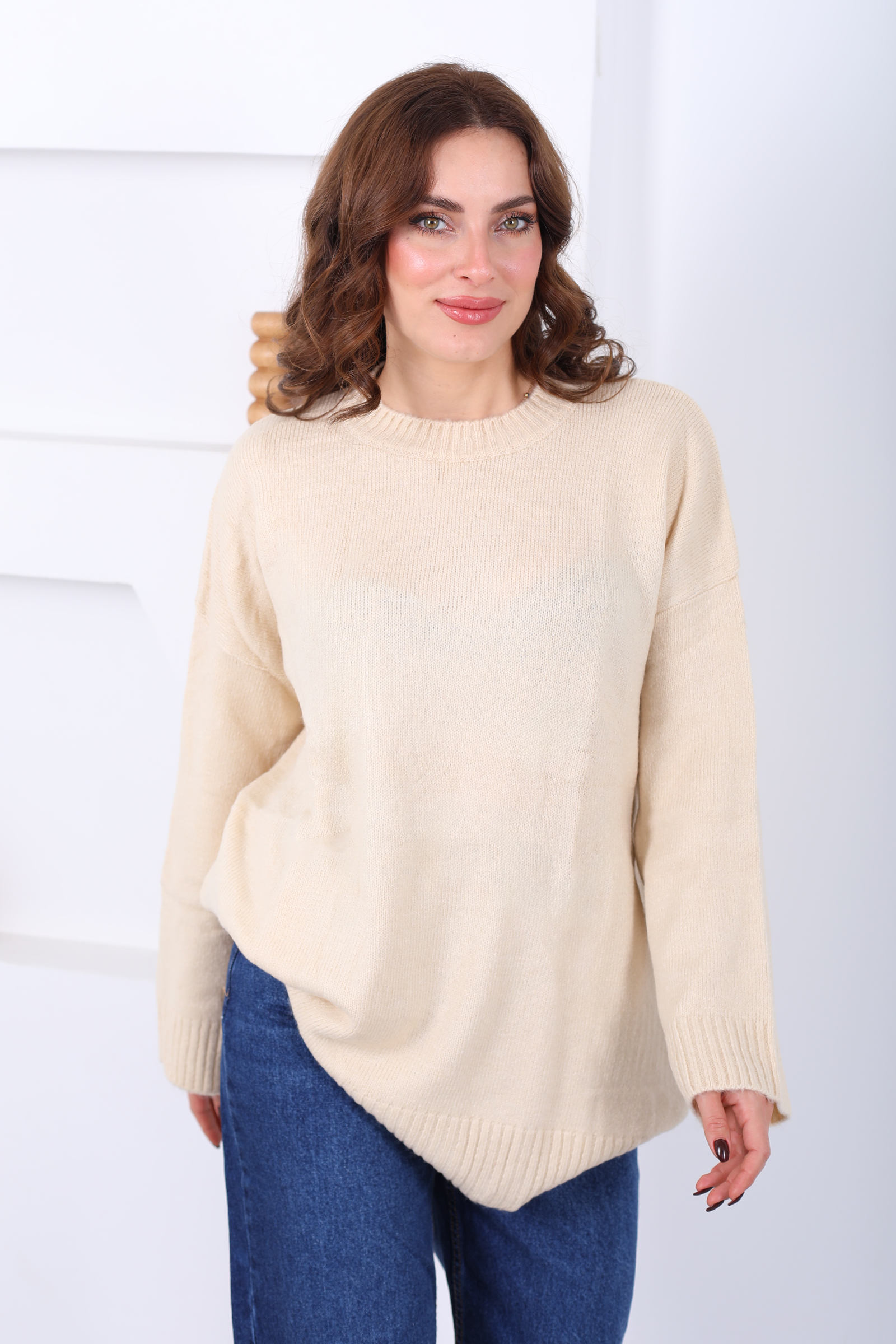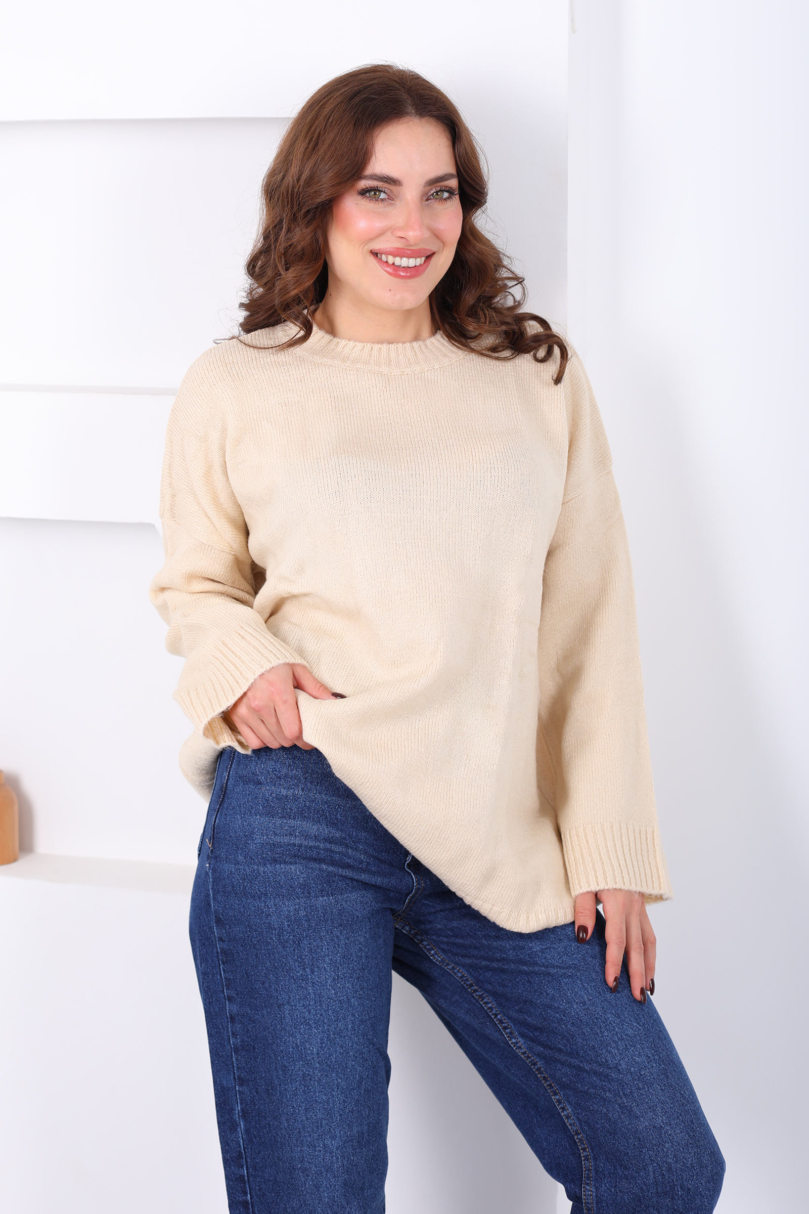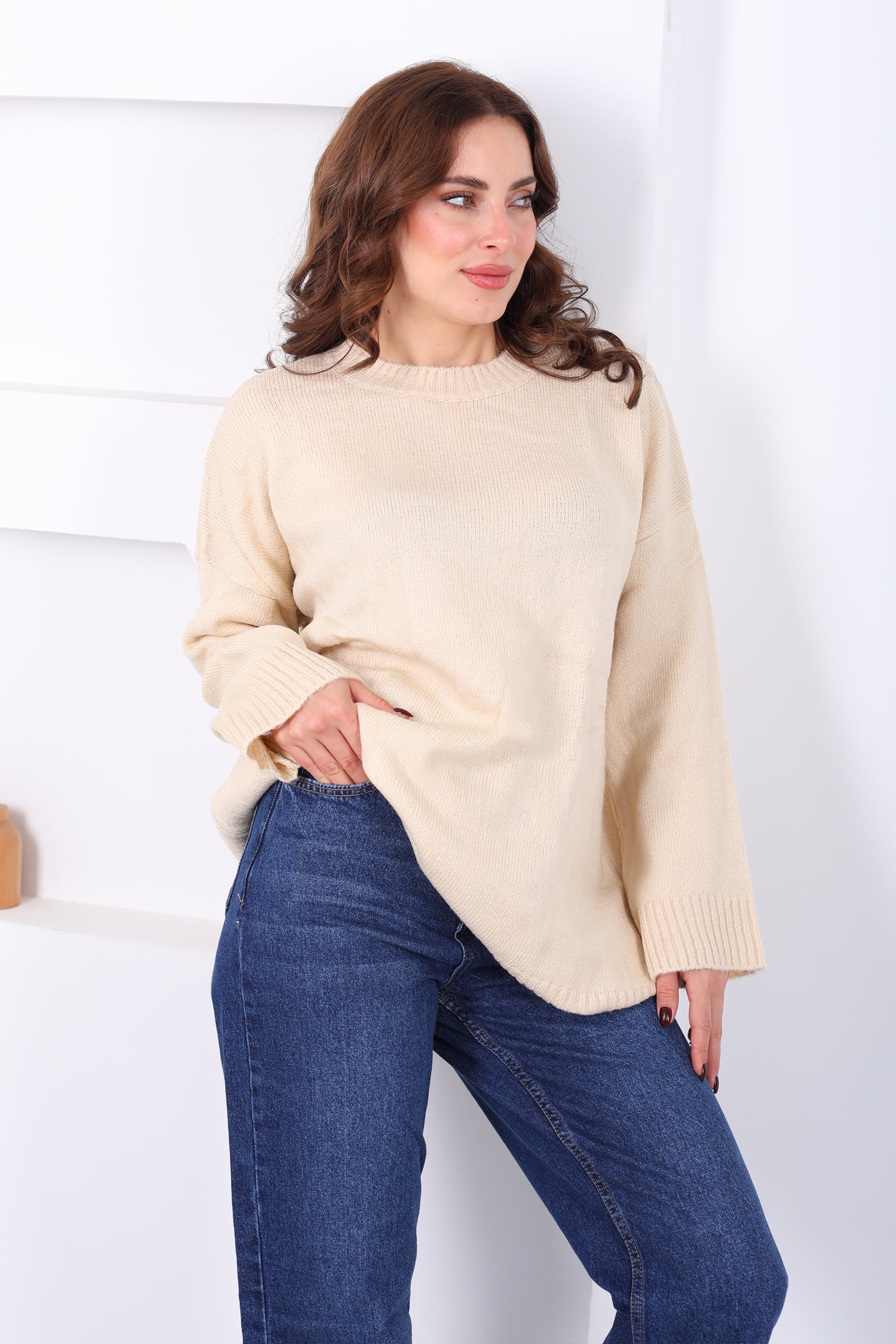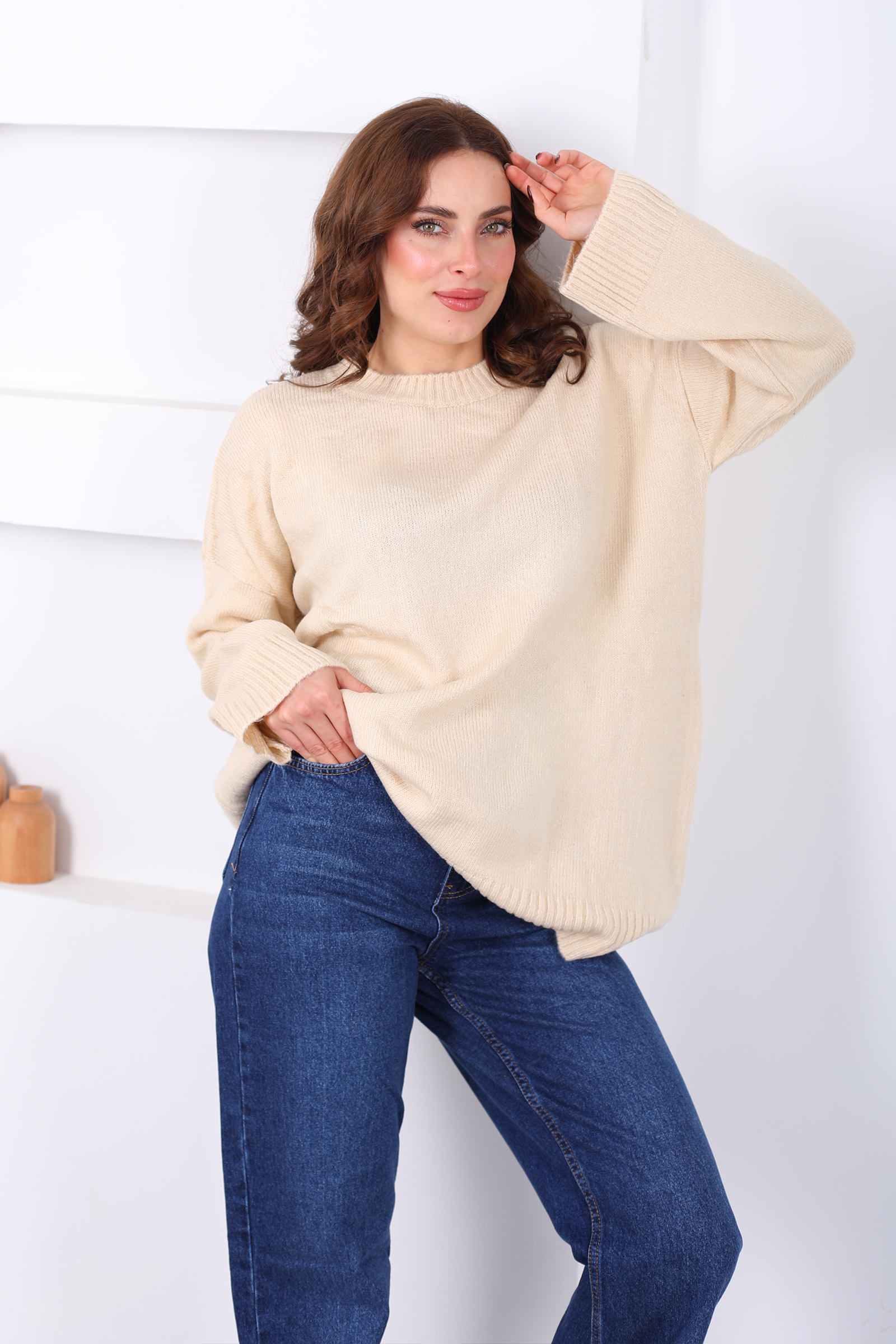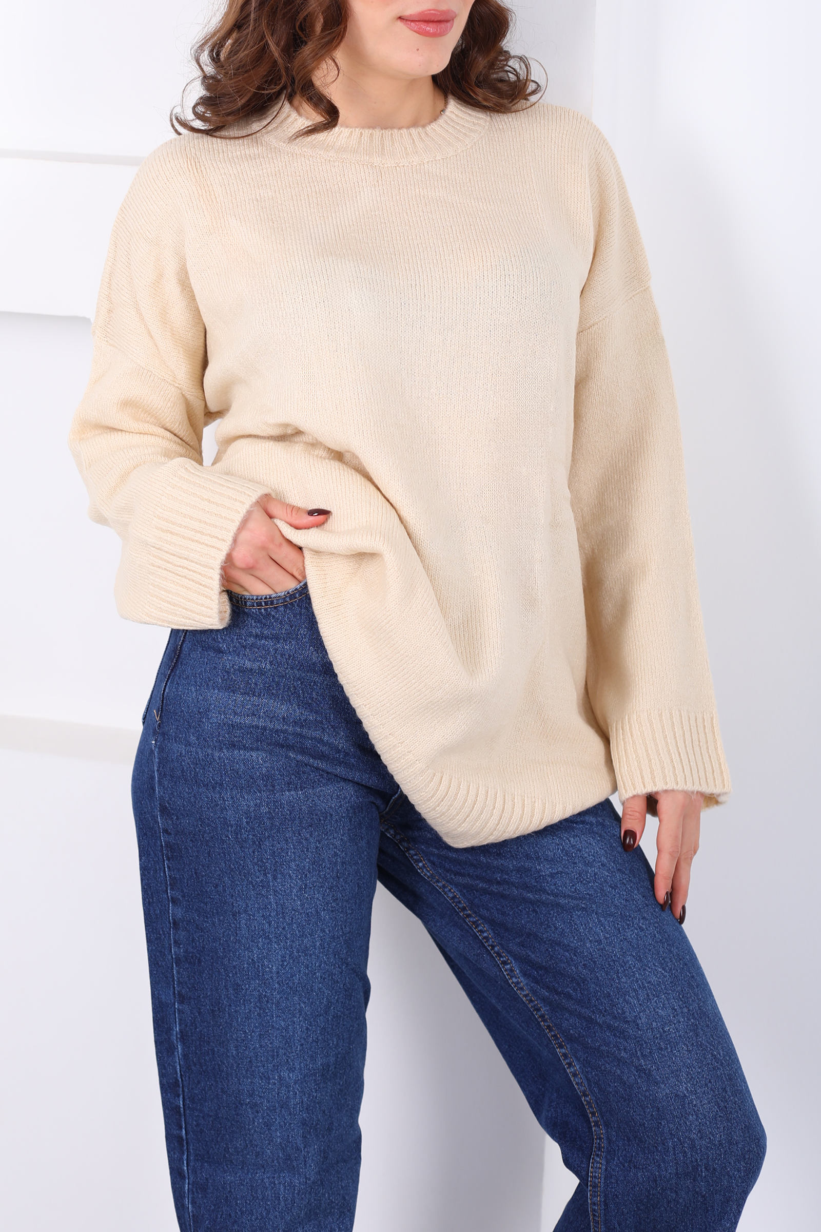 Bisiklet Yaka Oversize Yünlü Bej Kadın Triko Kazak
