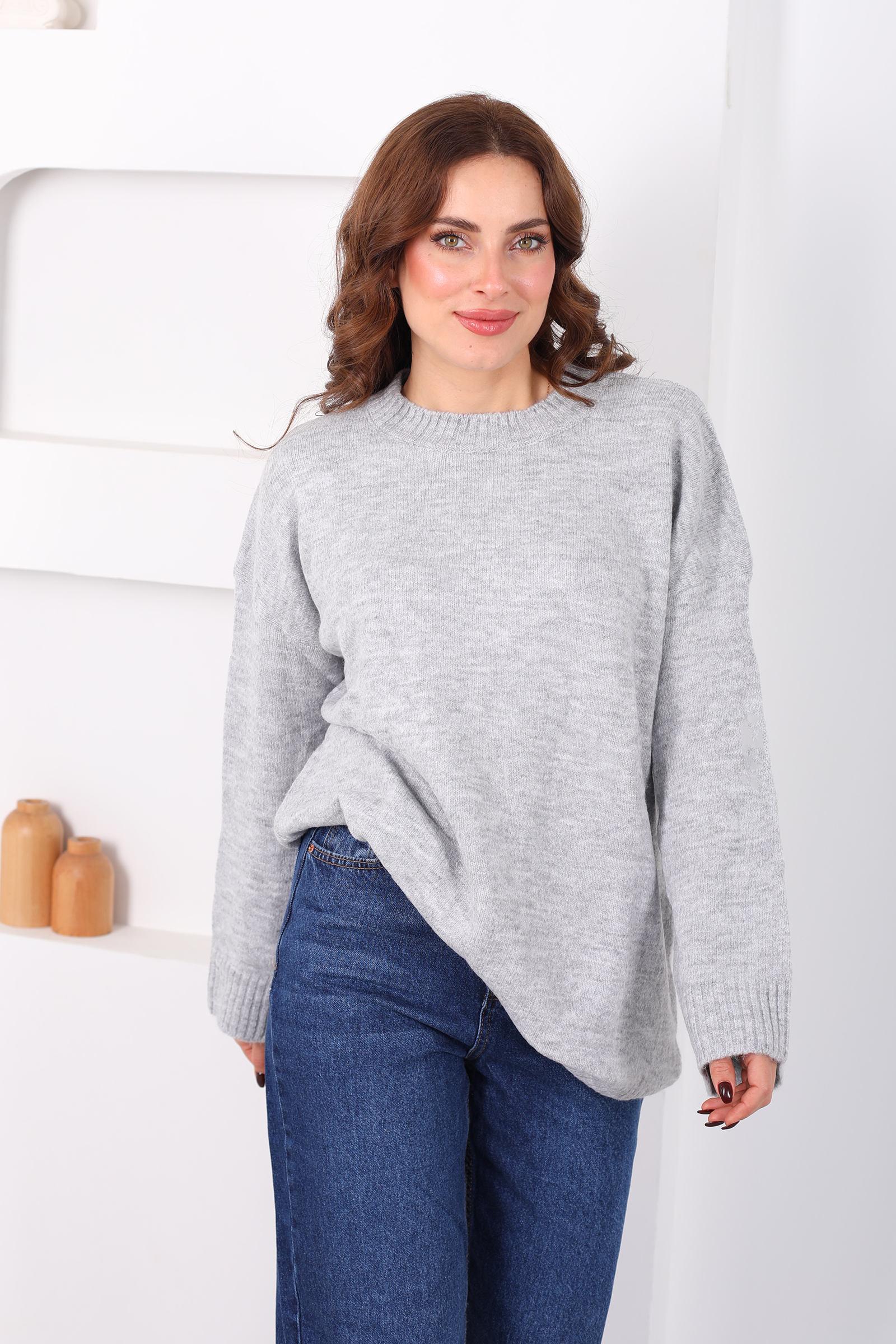 Bisiklet Yaka Oversize Yünlü Gri Kadın Triko Kazak
