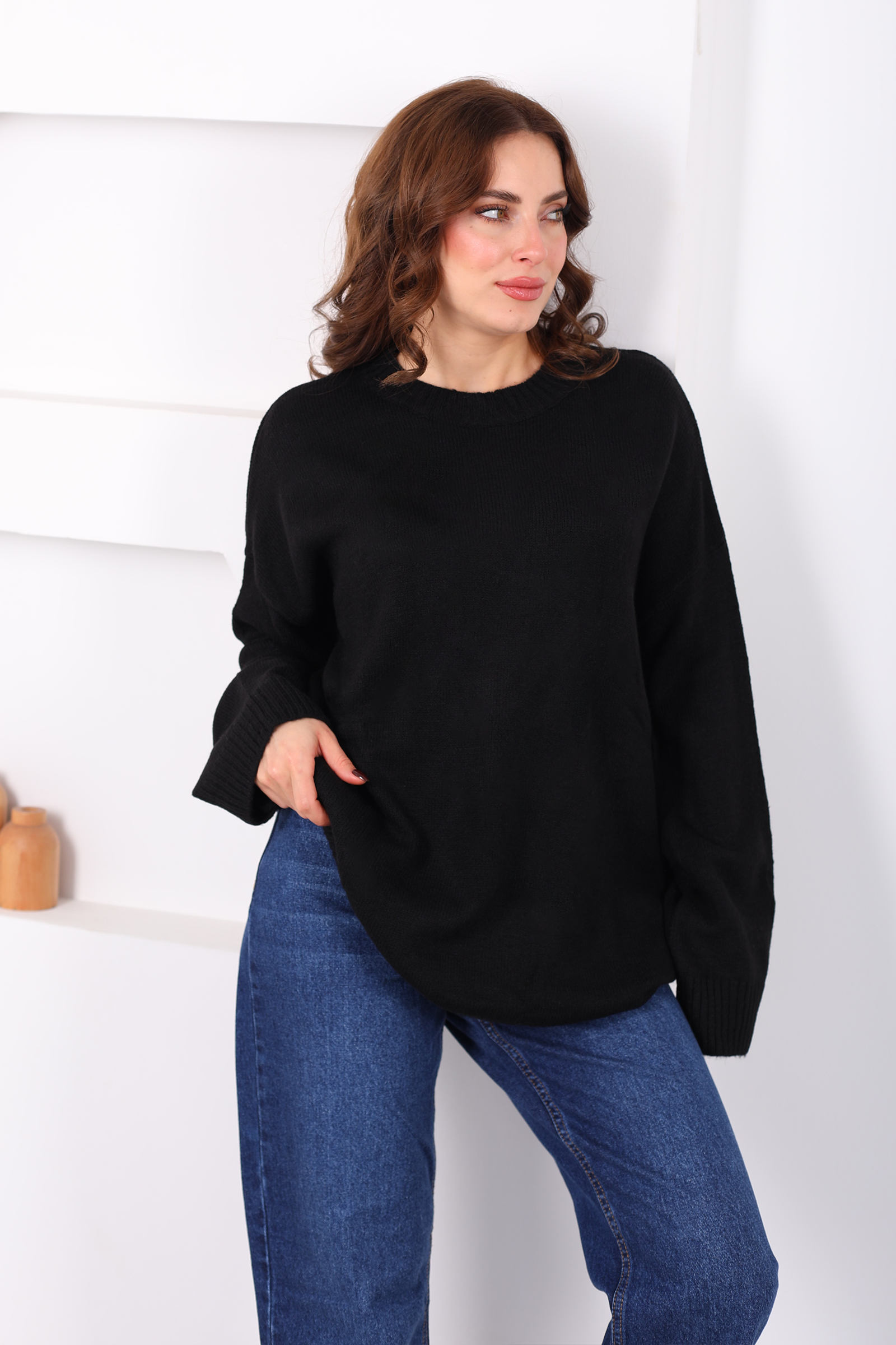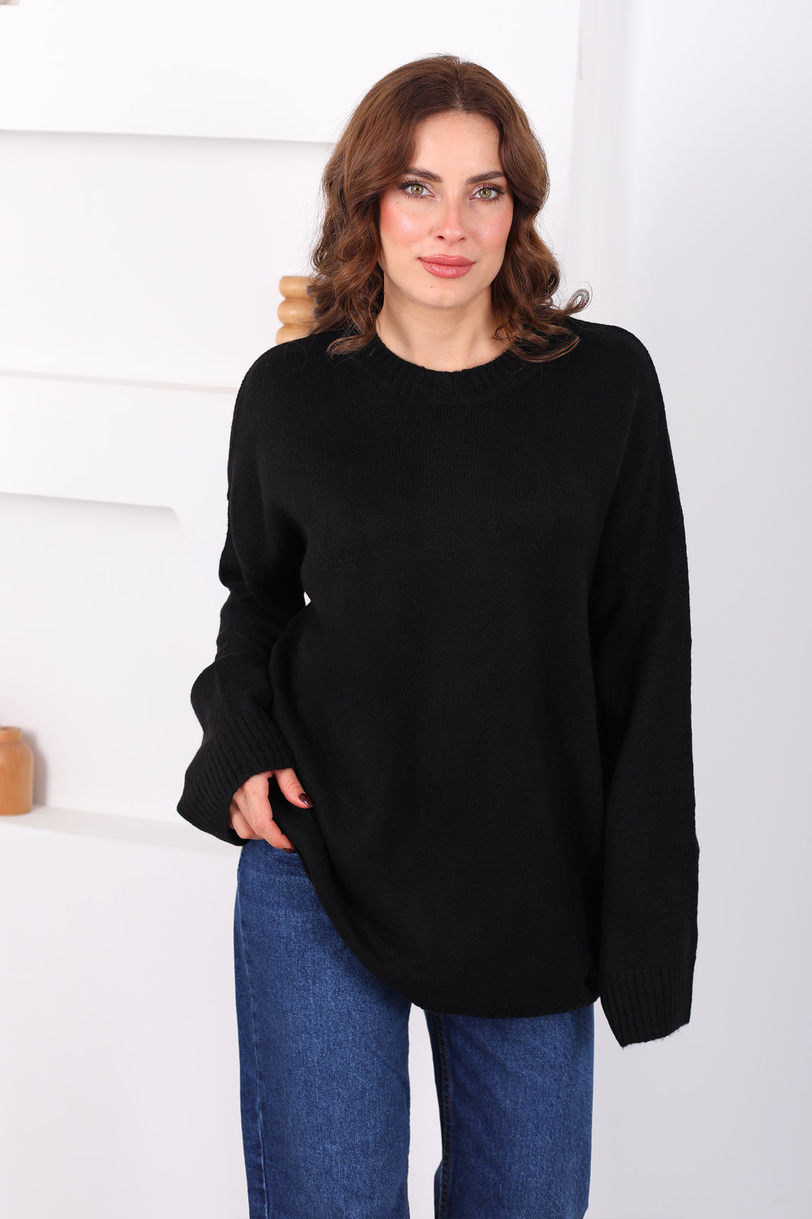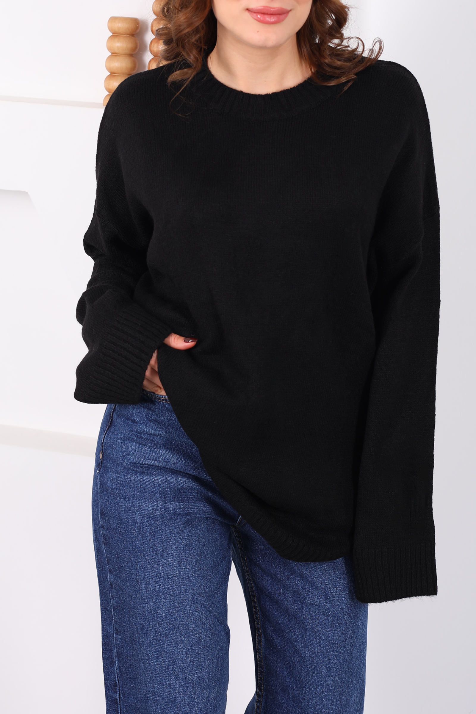 Bisiklet Yaka Oversize Yünlü Siyah Kadın Triko Kazak