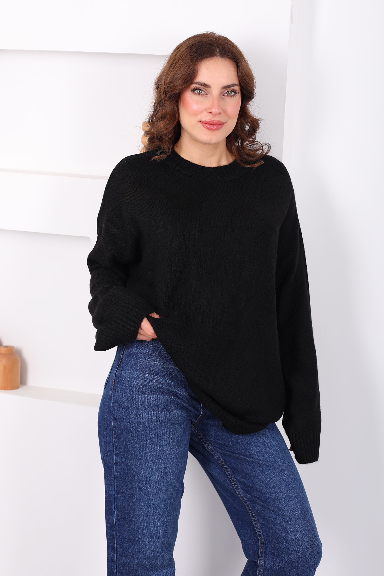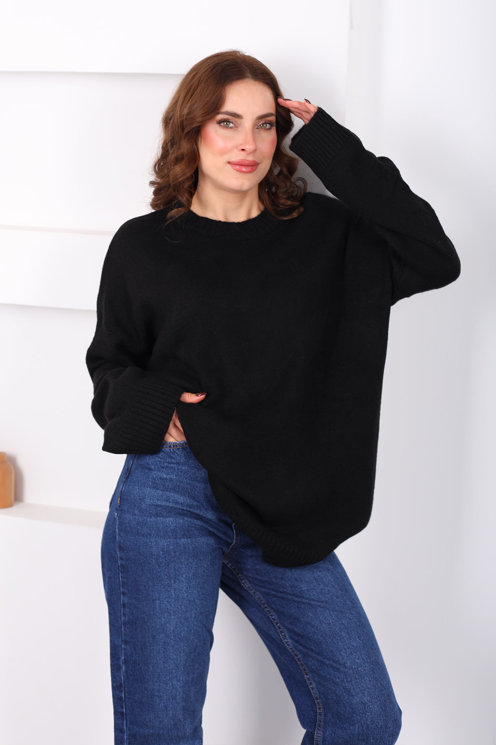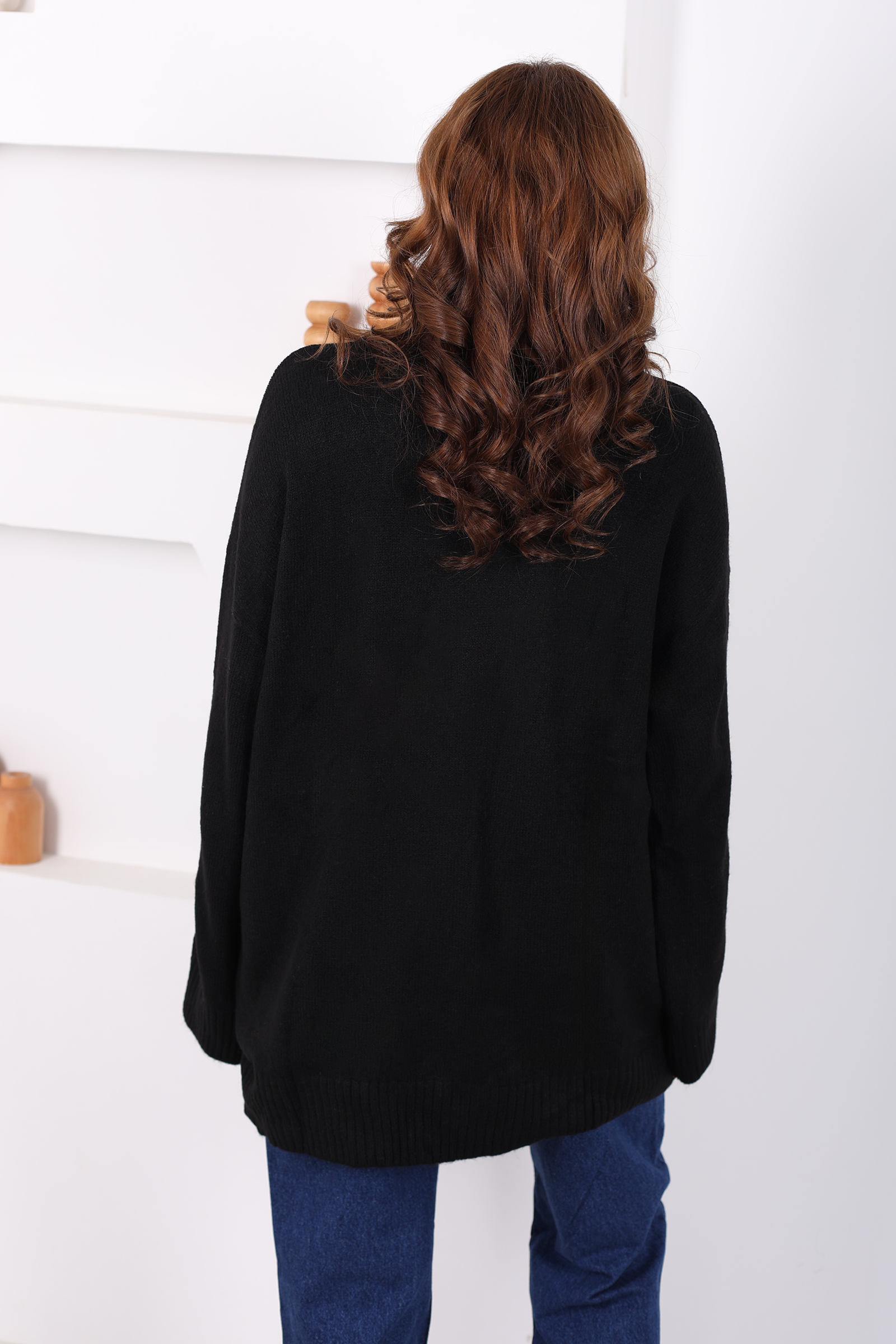Bisiklet Yaka Oversize Yünlü Siyah Kadın Triko Kazak