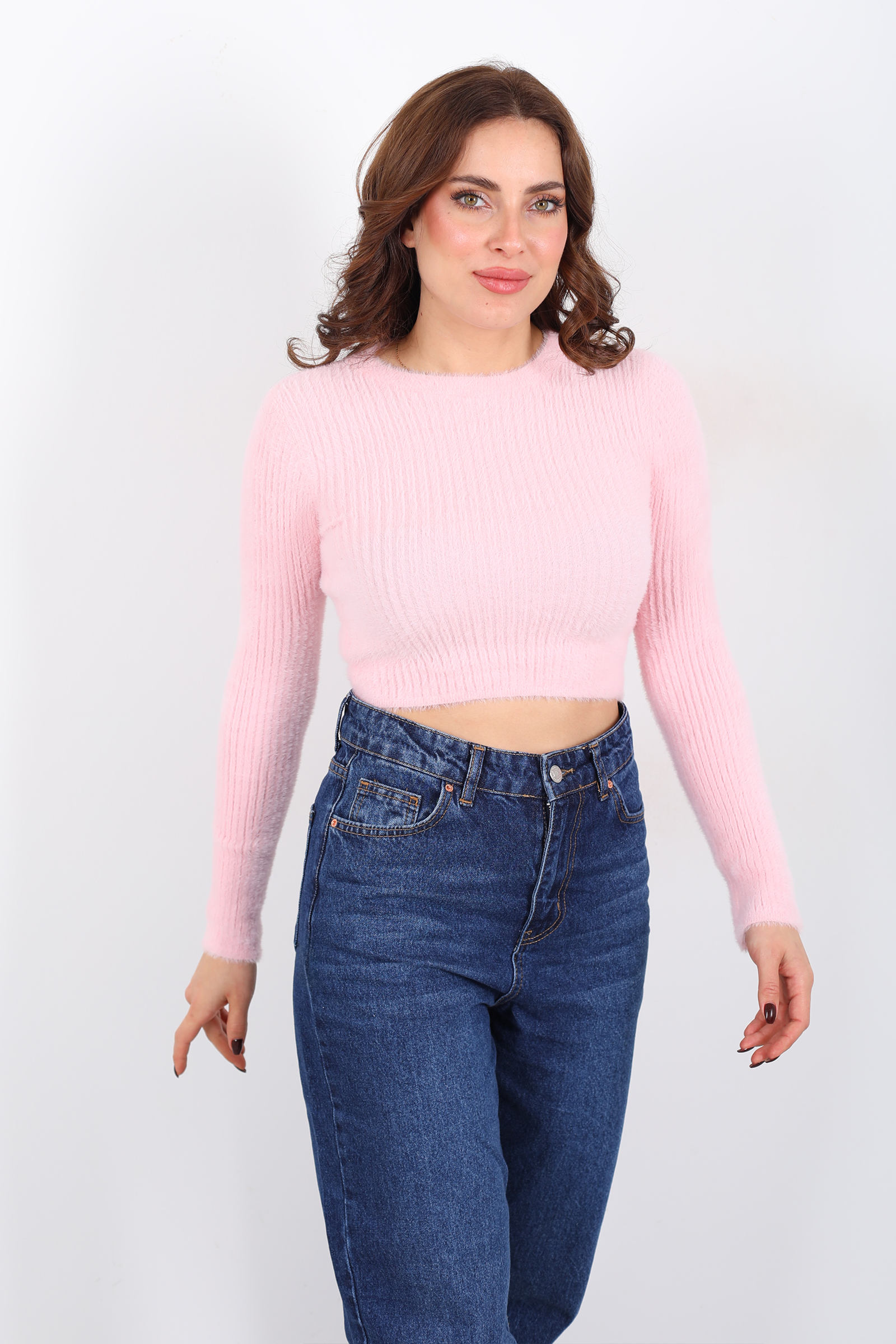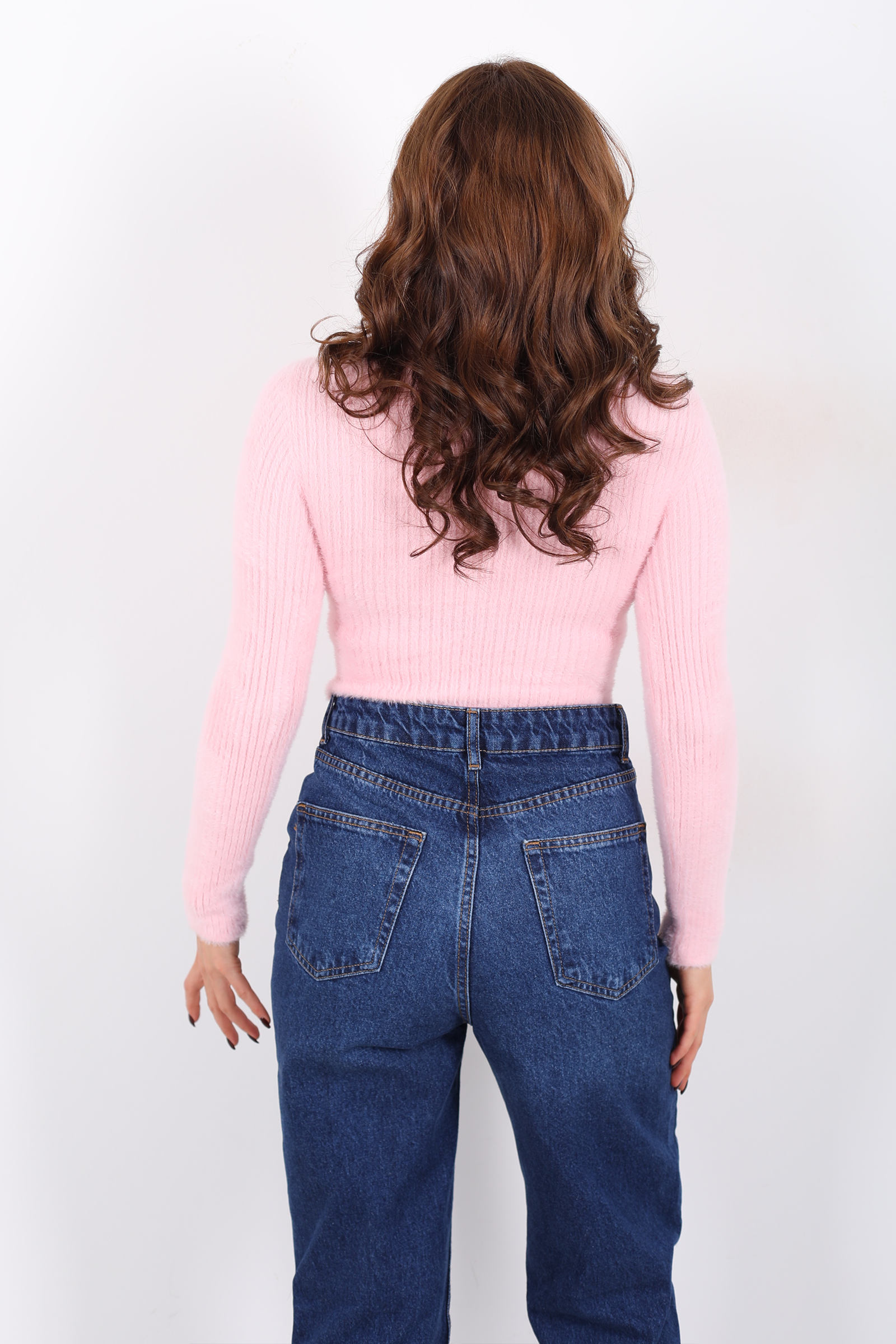 Bisiklet Yaka Sakallı Yumuşak Pembe Kadın Triko Kazak