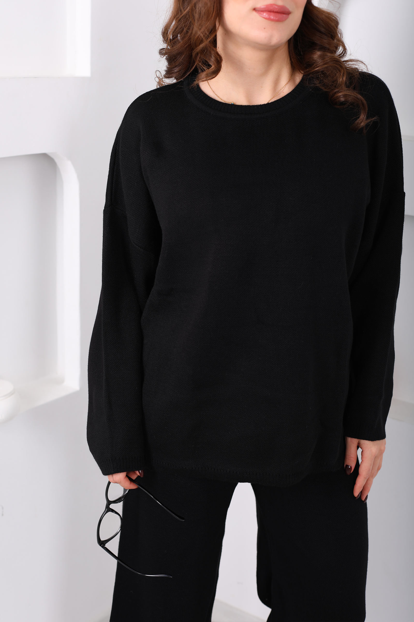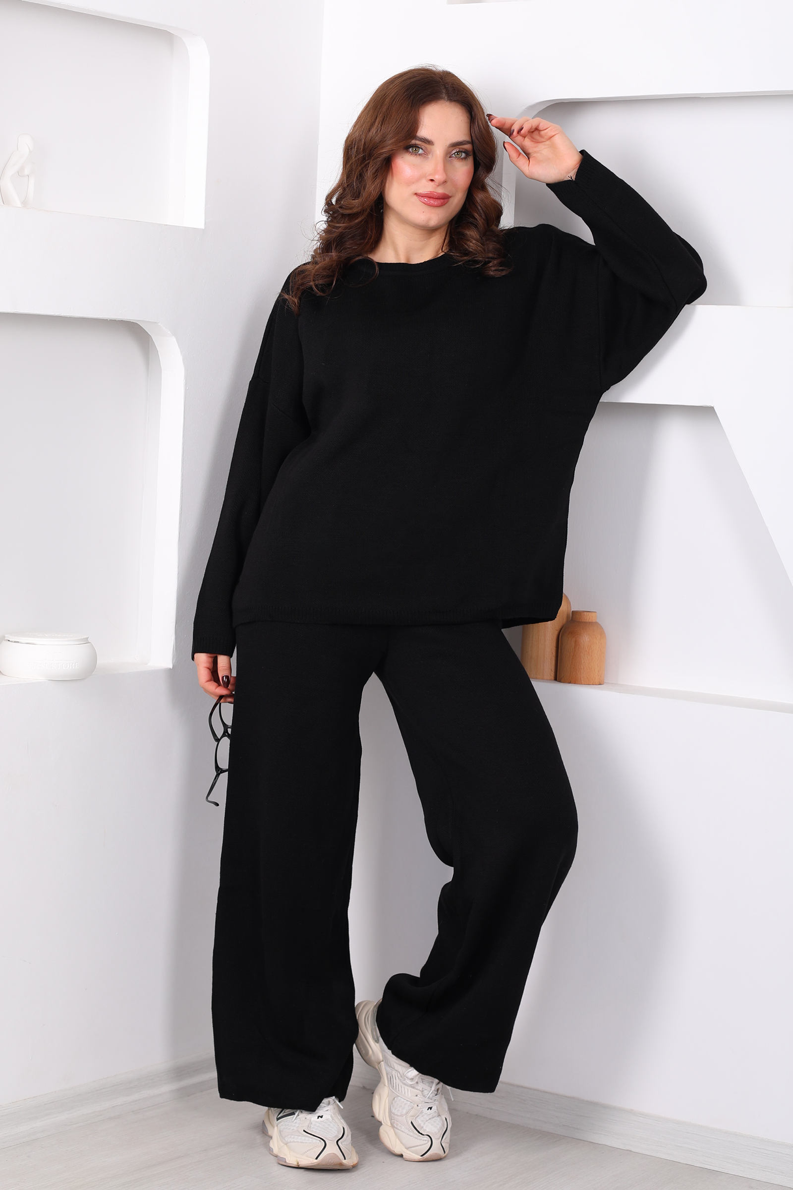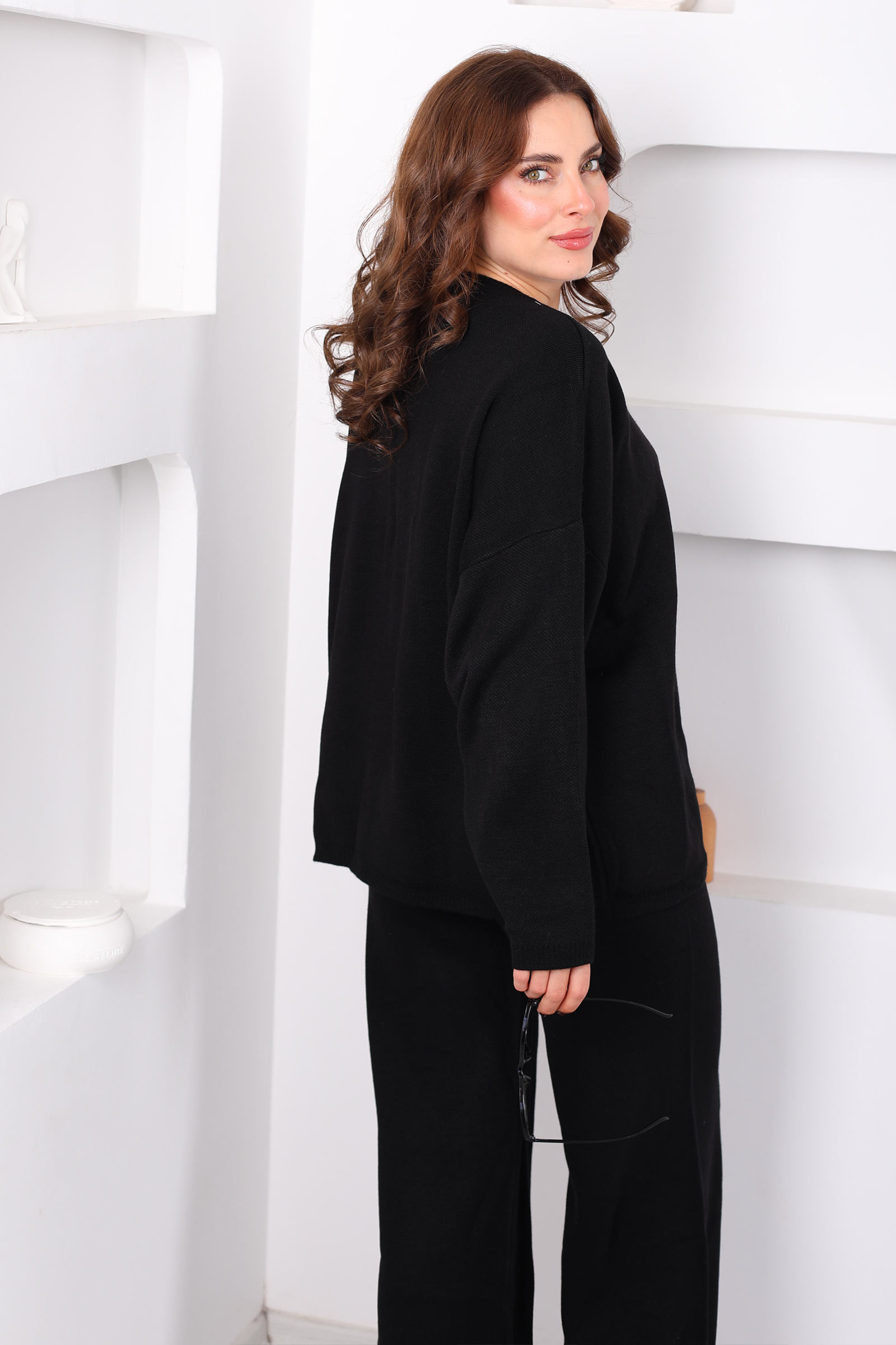 Bisiklet Yaka Salaş Siyah Kadın Triko Takım
