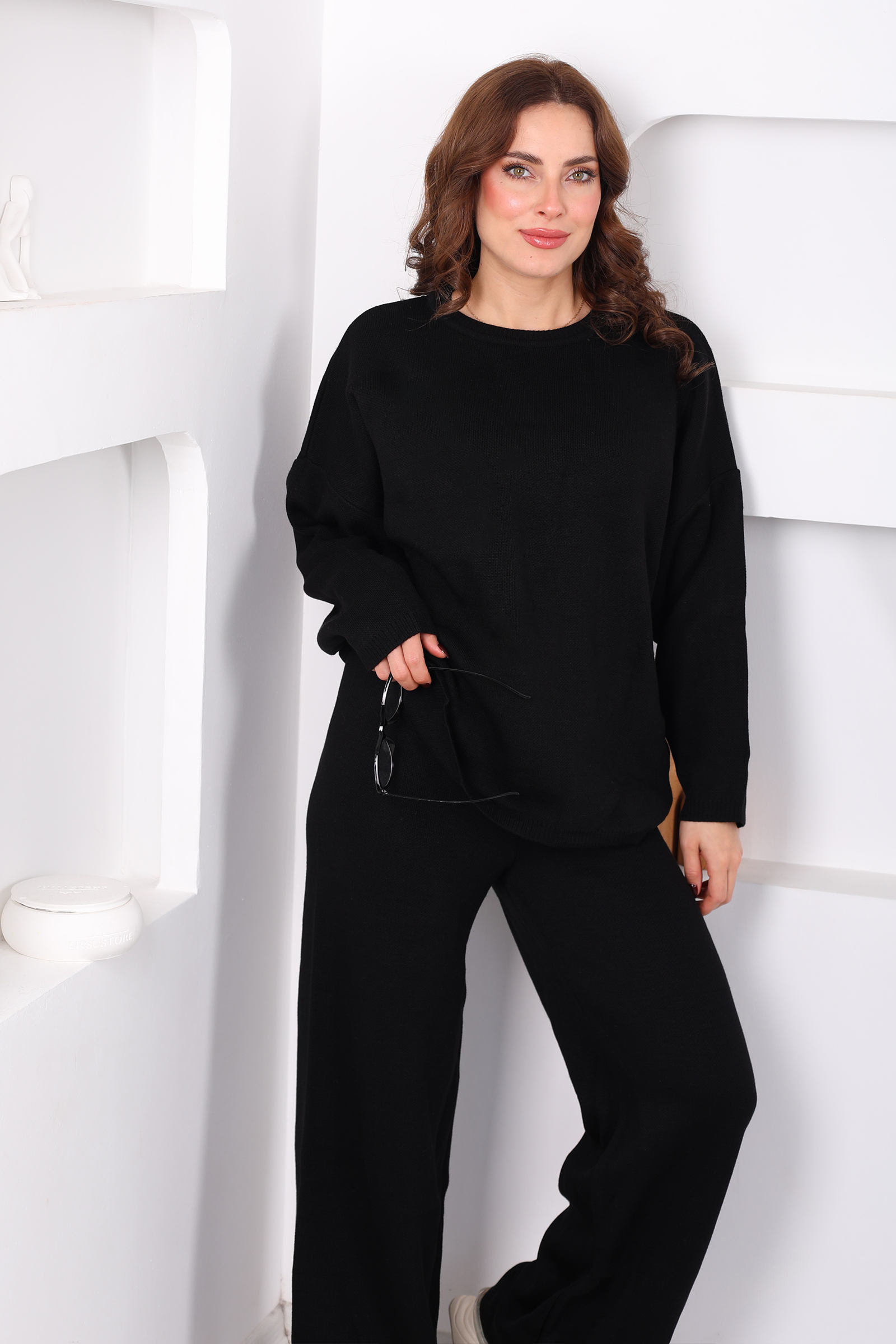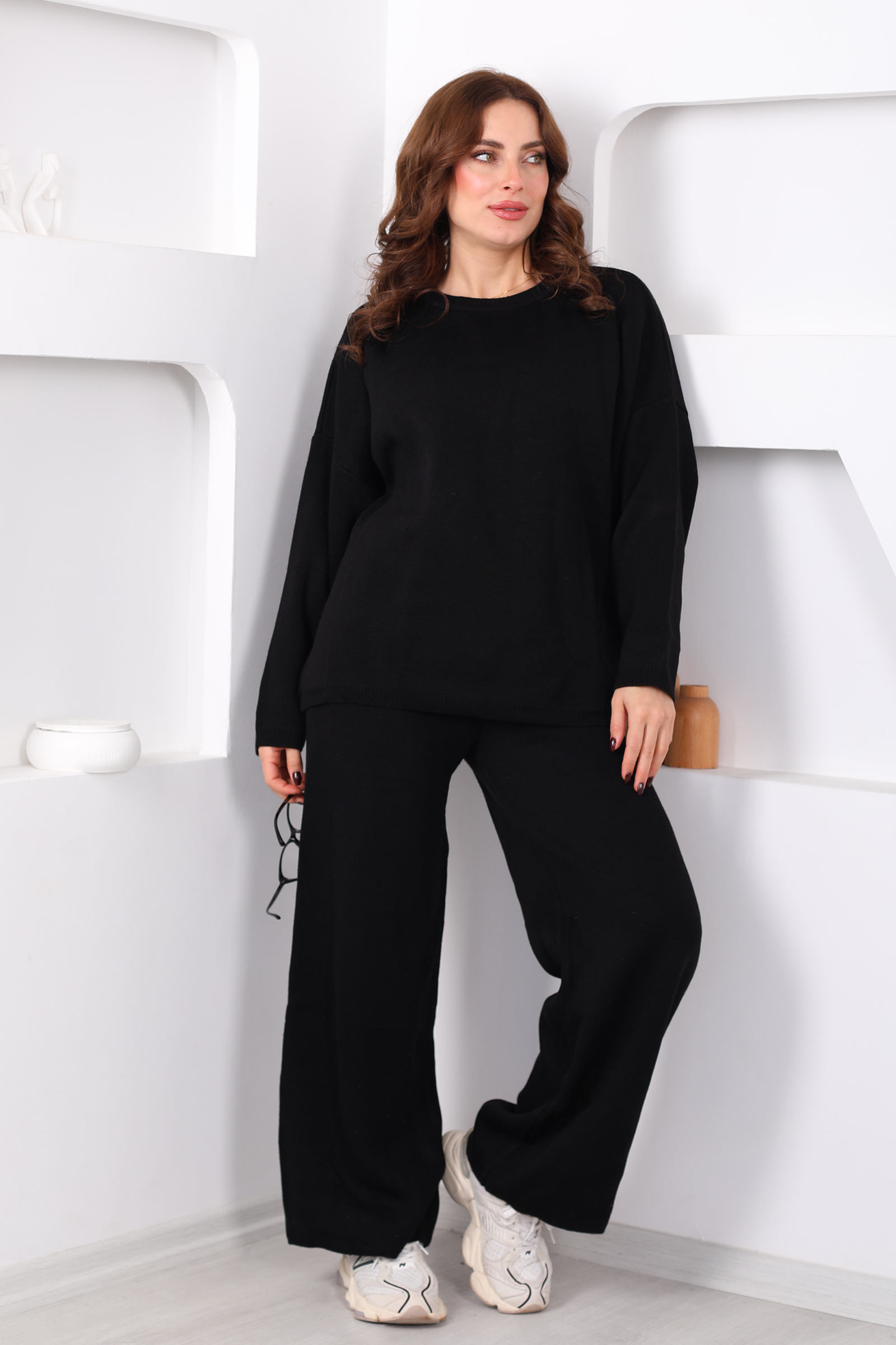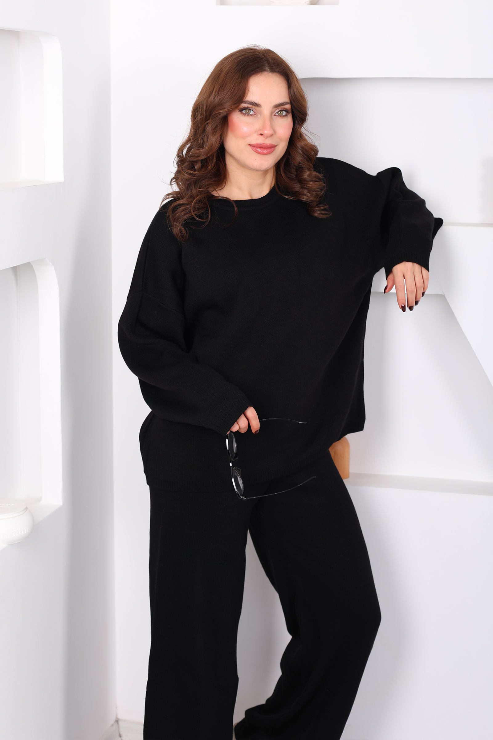 Bisiklet Yaka Salaş Siyah Kadın Triko Takım