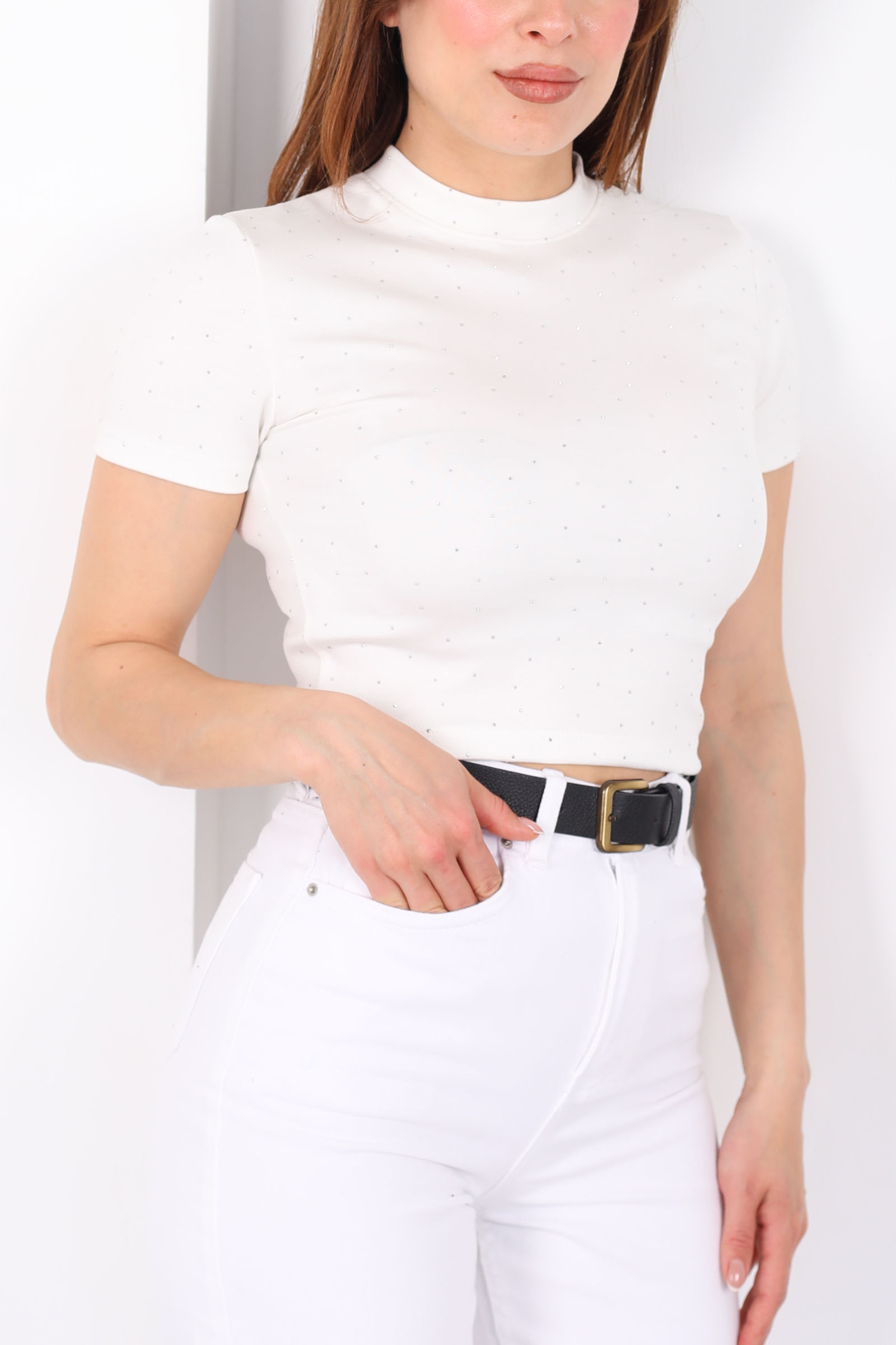 Bisiklet Yaka Taşlı Beyaz Kadın Crop