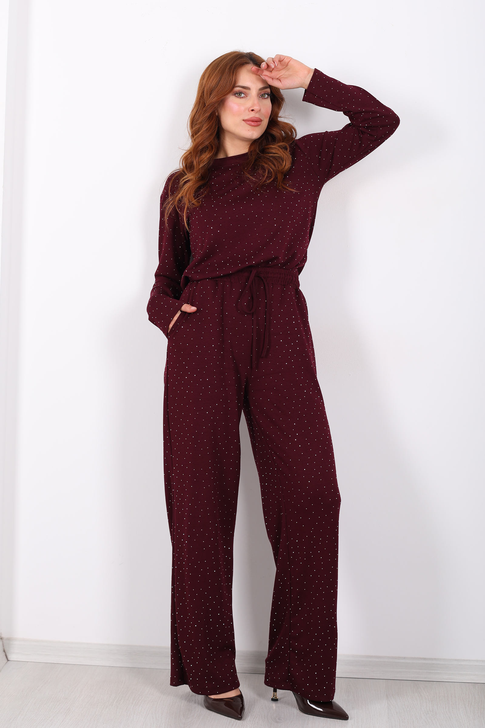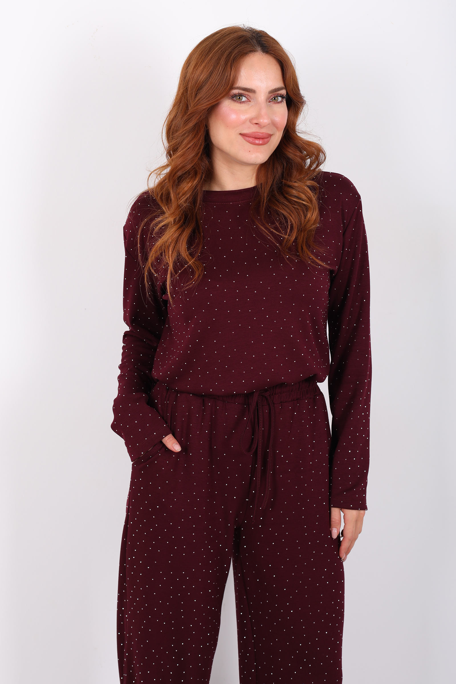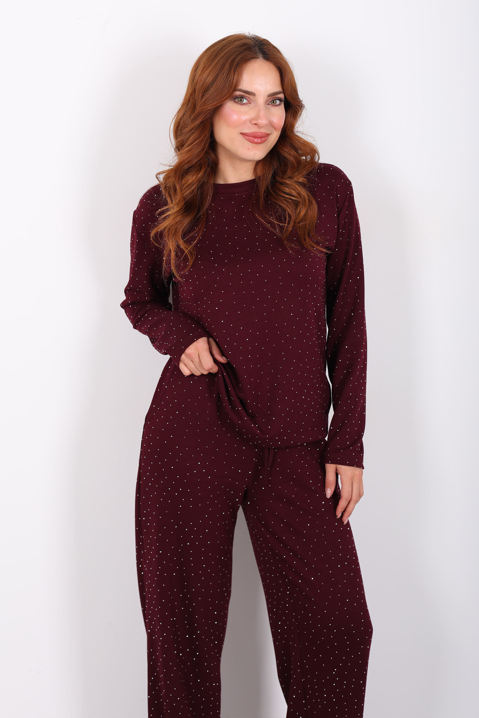 Bisiklet Yaka Taşlı Bordo Kadın Modal Takım